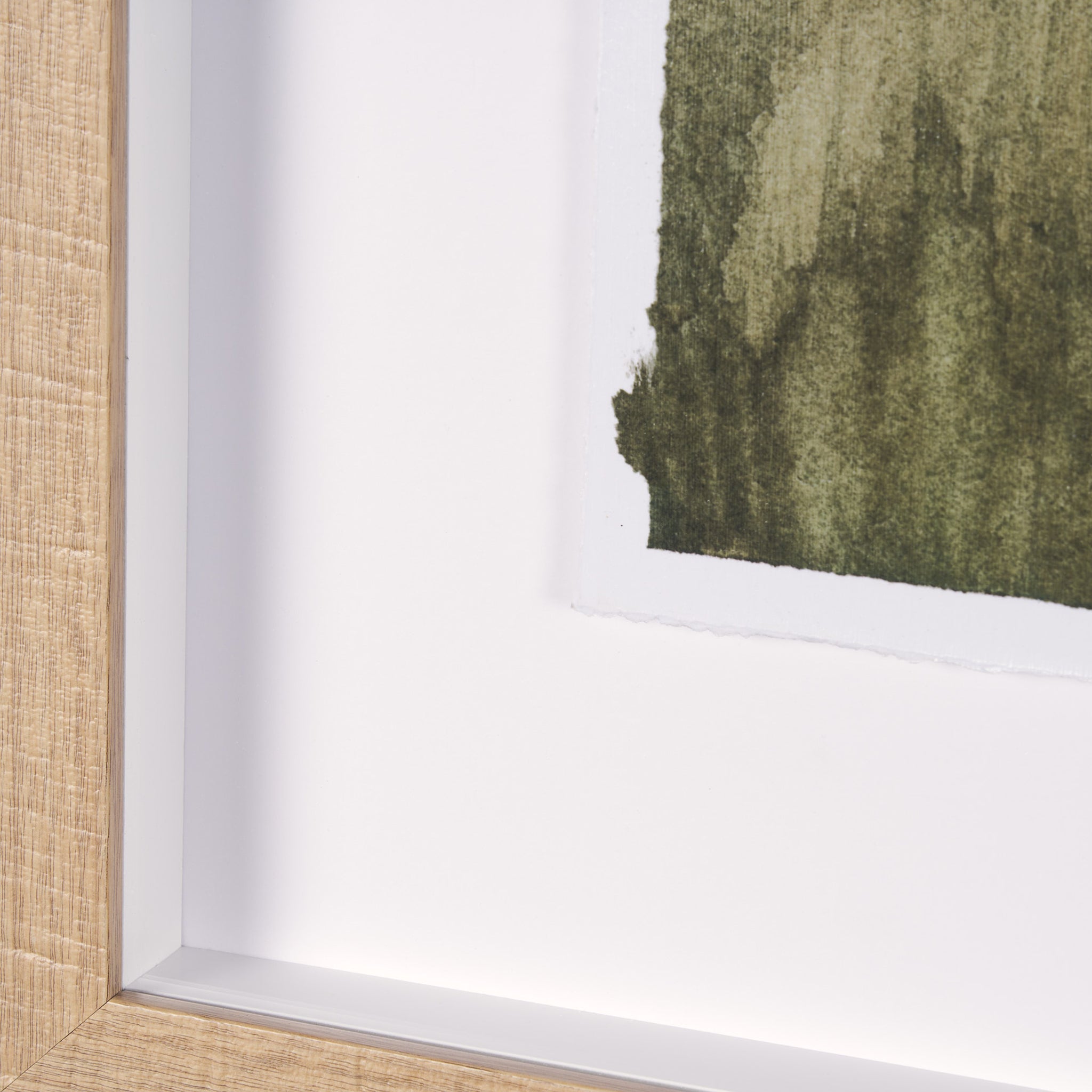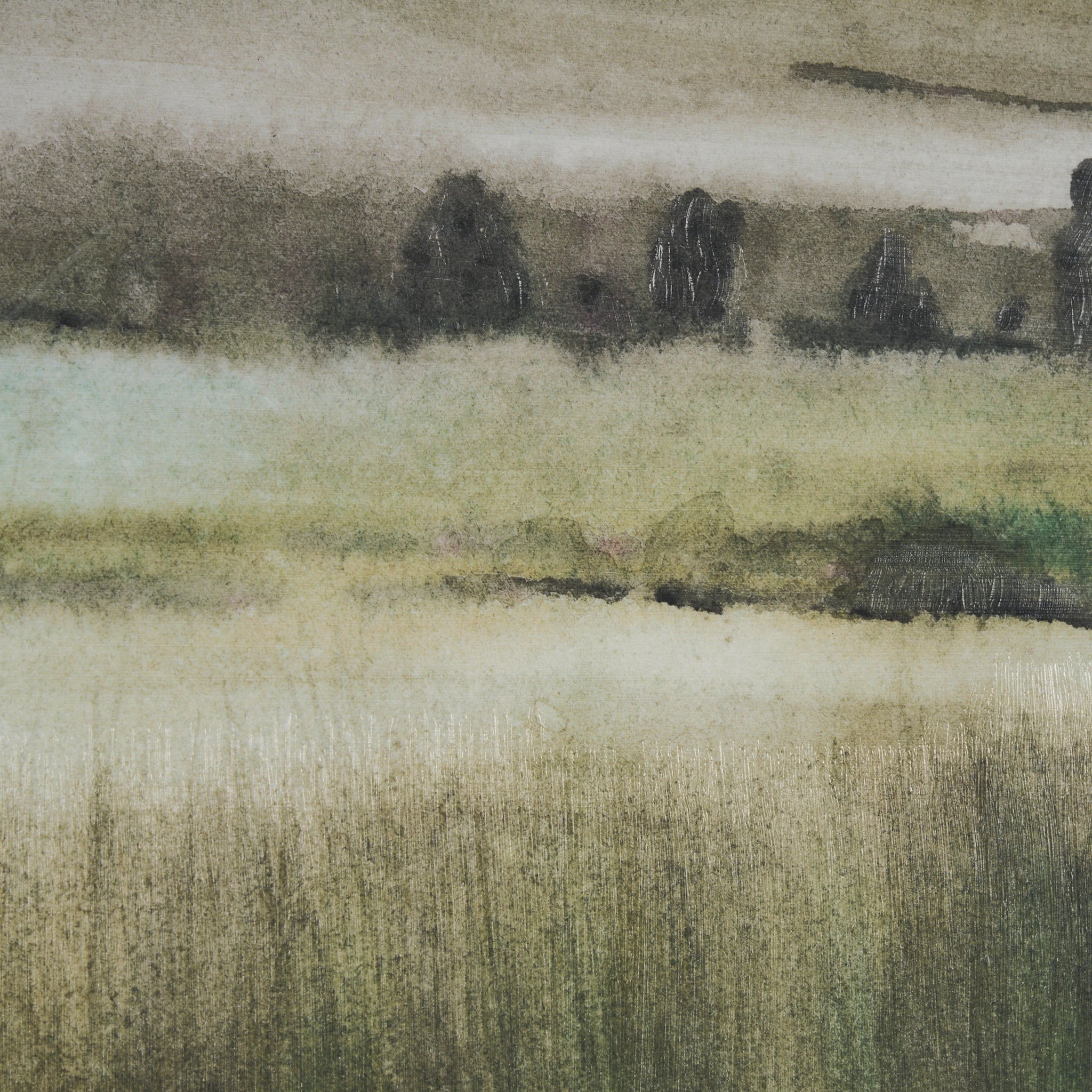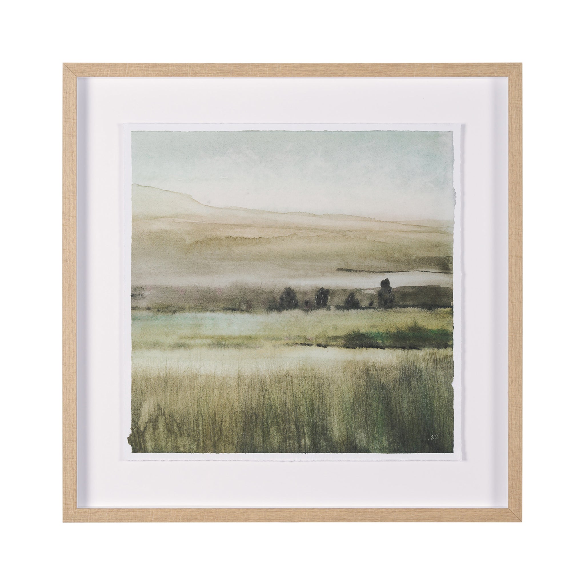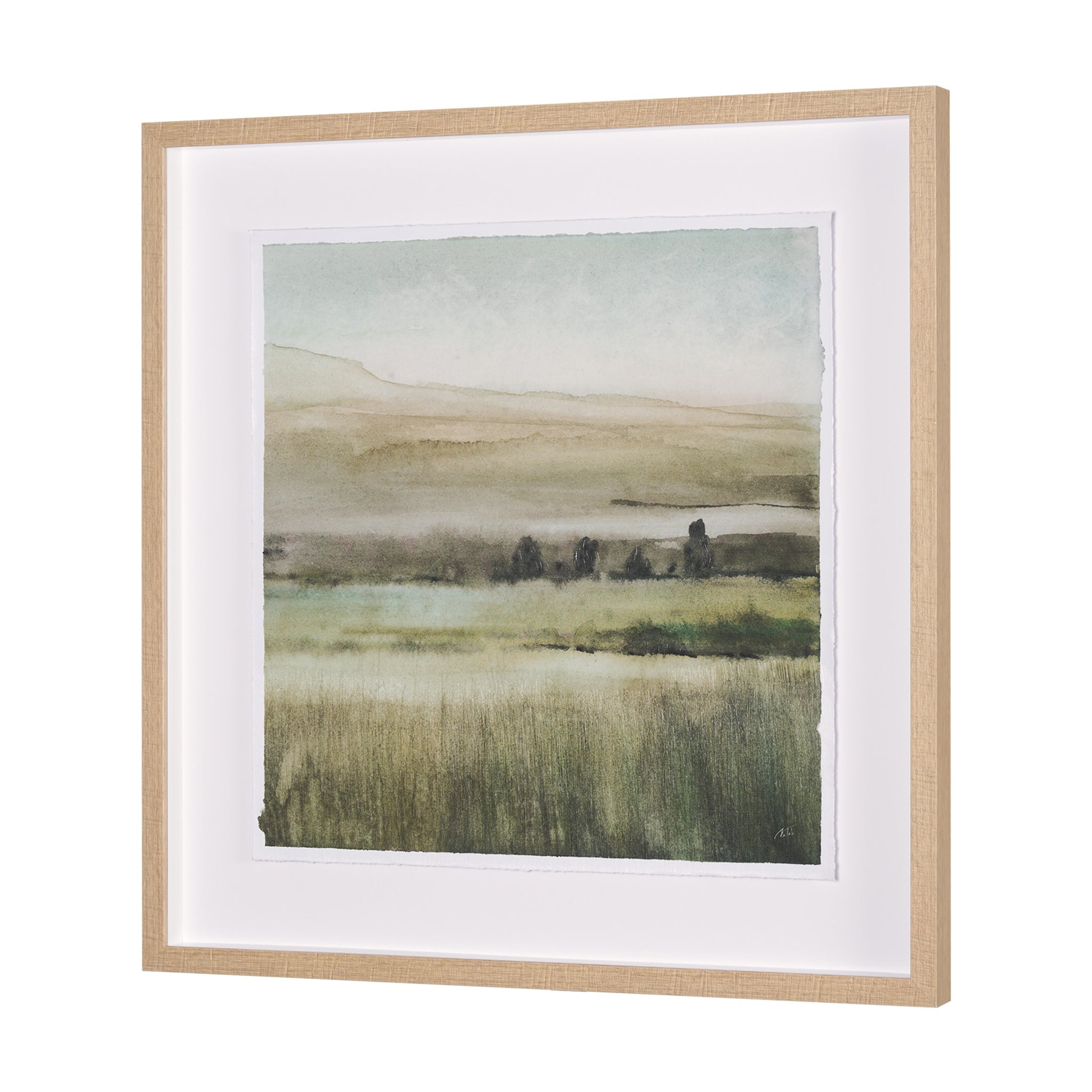 Immerse your space in the tranquil beauty of nature with this captivating framed artwork. Soft, watercolor washes depict a vast, layered landscape, featuring textured green grasslands in the foreground leading to a hazy line of trees and distant hills beneath a muted sky. This serene piece offers a sense of calm and expansive natural harmony, perfect for bringing an understated yet impactful artistic touch to any room.