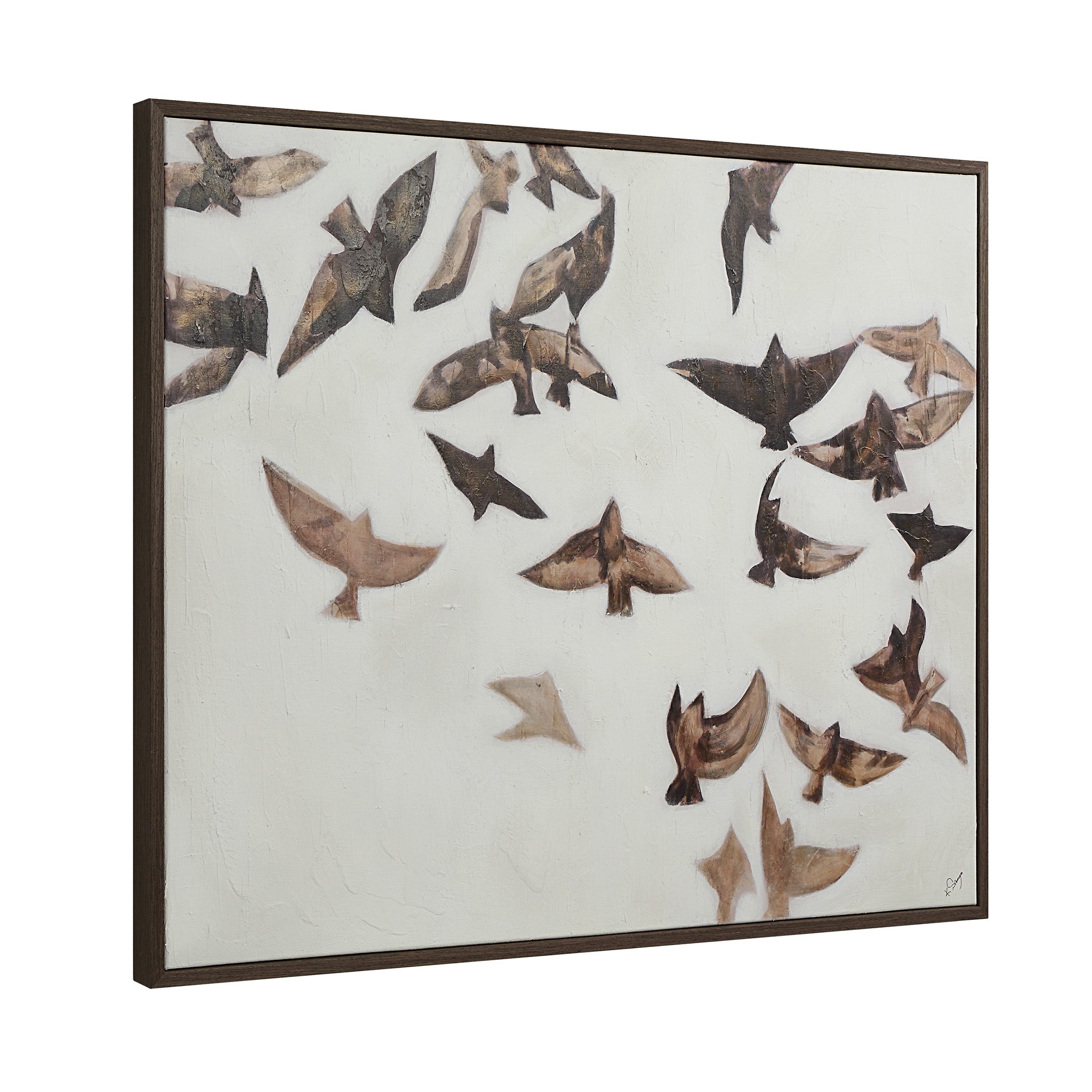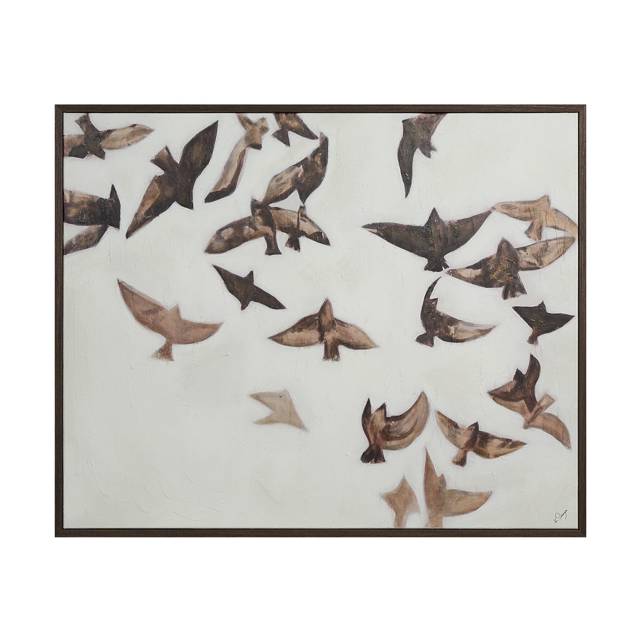 Embrace a whimsical touch in your next design project with the free-spirited vibe of this canvas art. Warm-hued bird silhouettes dive and soar in high contrast against a pure white sky bringing motion and emotion to any space. Framed in dark brown veneer, this textured, hand-painted piece is perfect for modern decorating schemes.