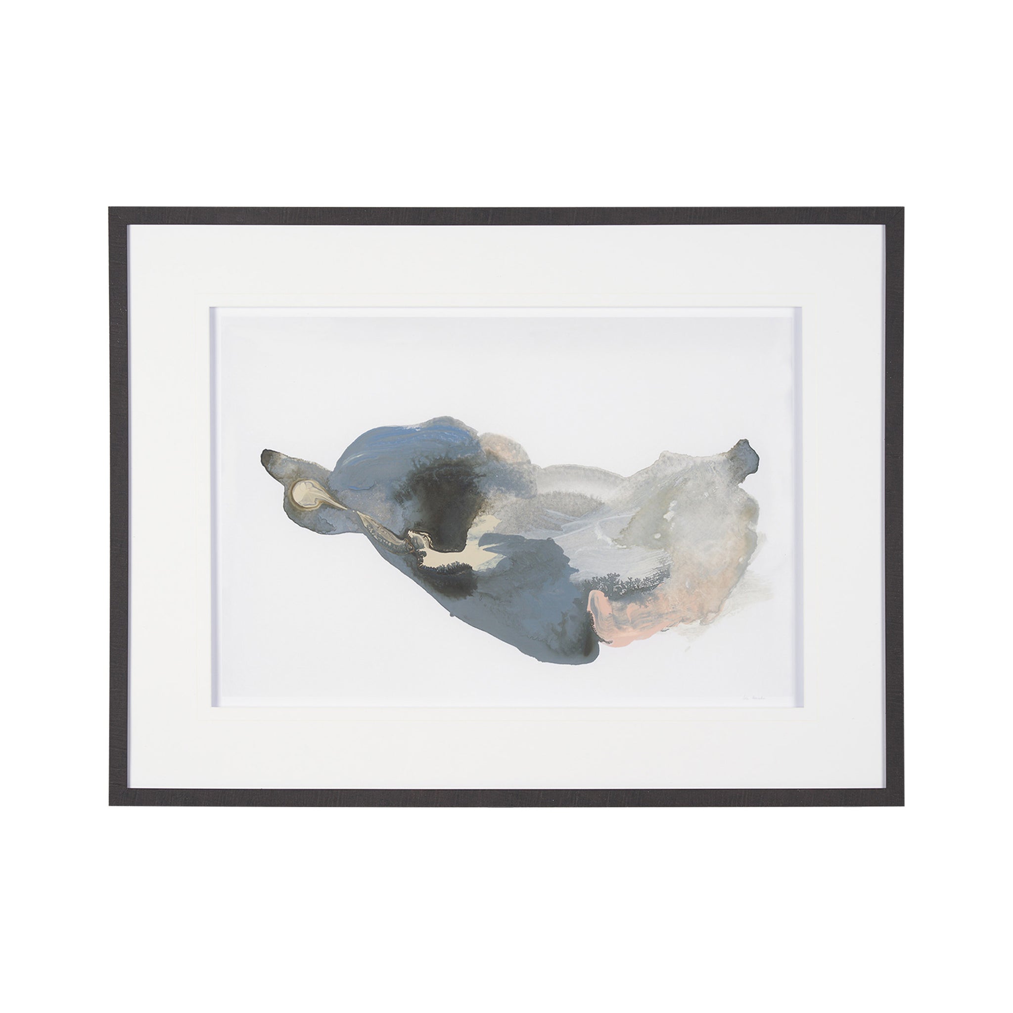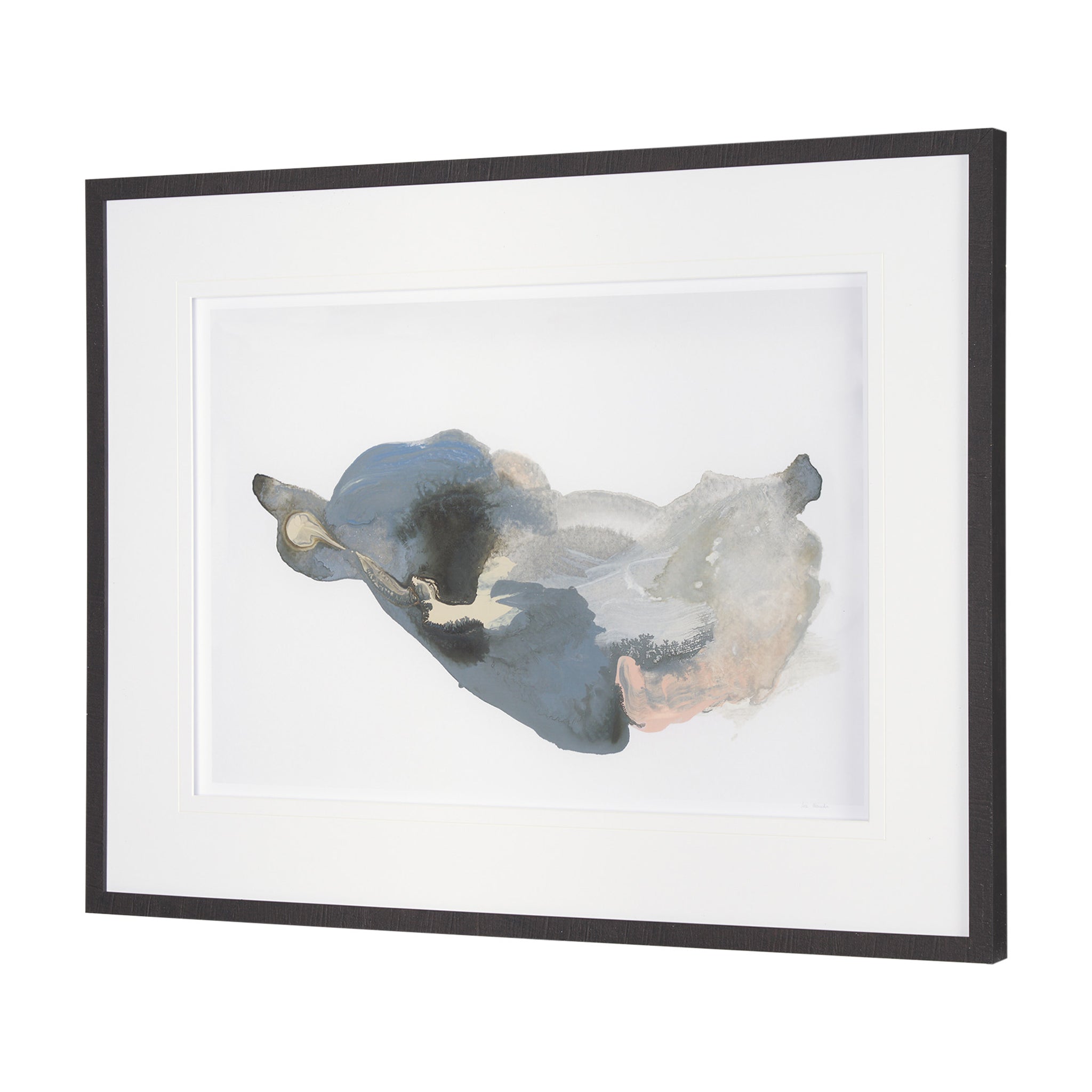 Introduce a tranquil and sophisticated touch to your space with this captivating framed abstract artwork. Fluid, organic forms in muted blues, soft greys, and earthy tones blend seamlessly, suggesting the gentle movement of water or cloudscapes. The subtle hint of warmer hues adds depth, creating a serene and contemplative focal point perfect for modern, minimalist, or coastal-inspired interiors.