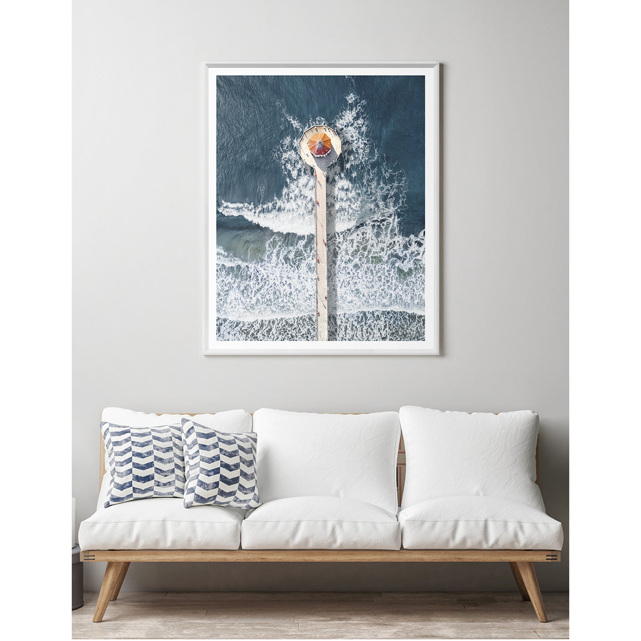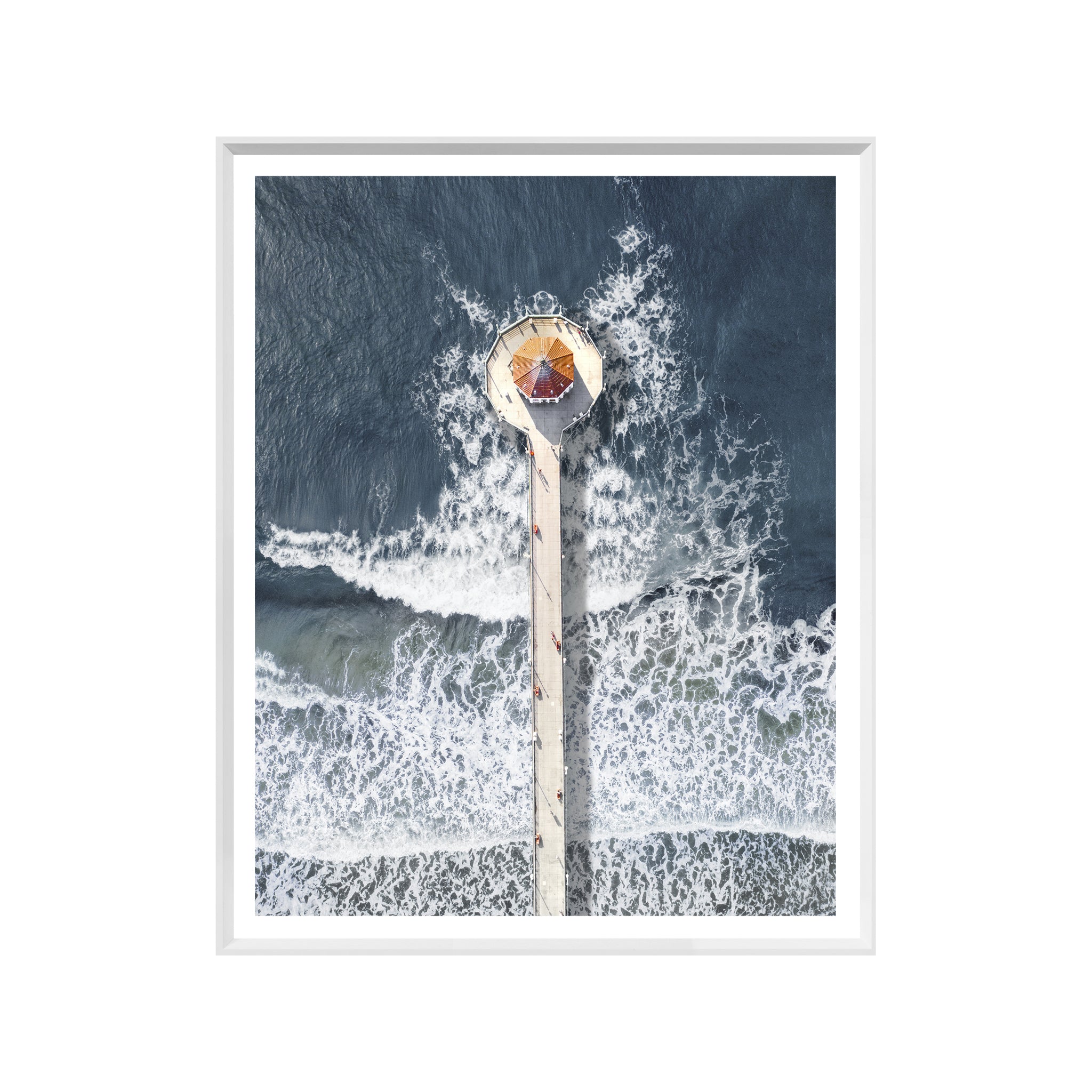 This unique aerial photograph captures the iconic pier, built in 1920, with its remarkable Roundhouse Aquarium at the end. The turquoise and white waves that gently envelop the pier create a mesmerizing dance of colors, blending the timeless beauty of the sea with the historical significance of this coastal landmark.