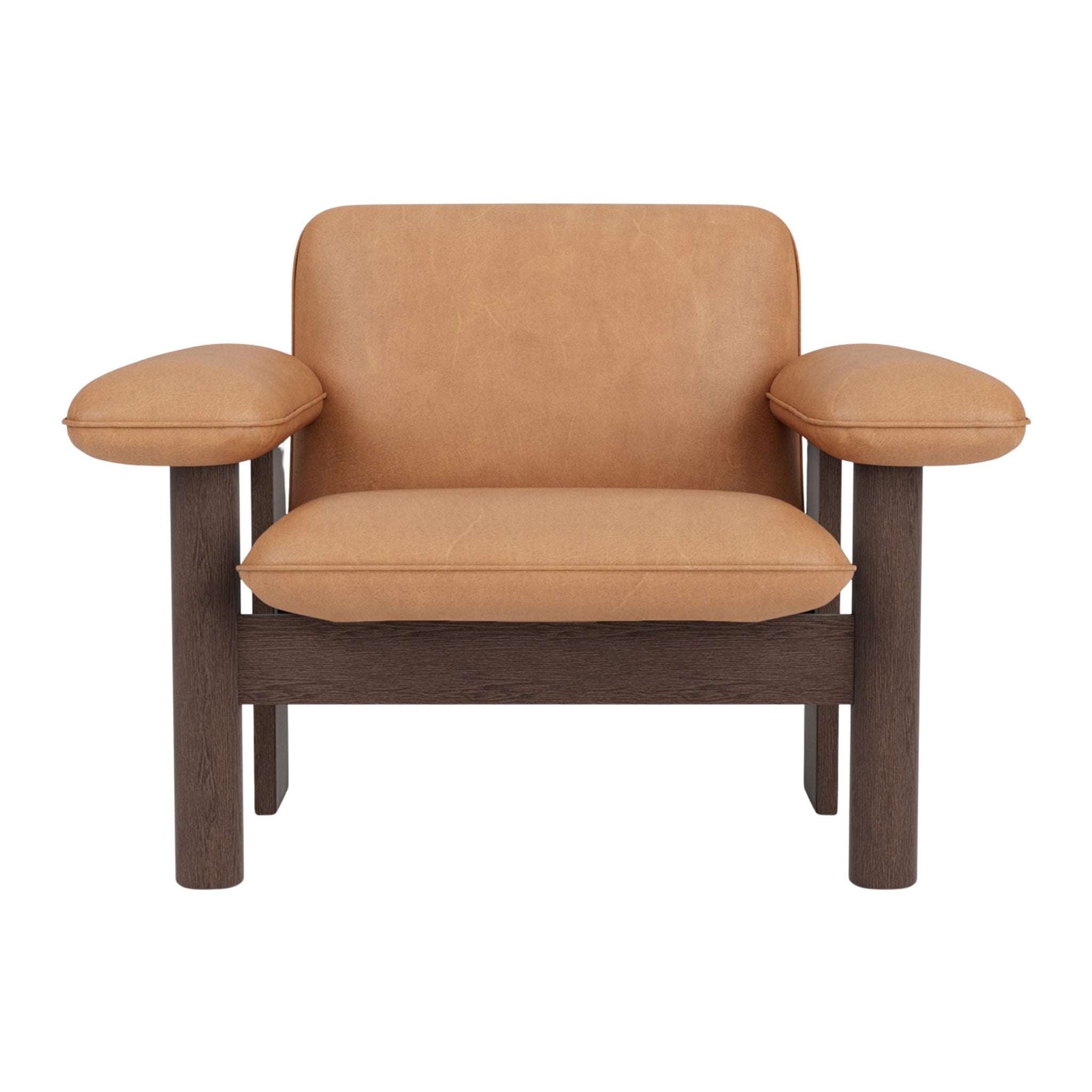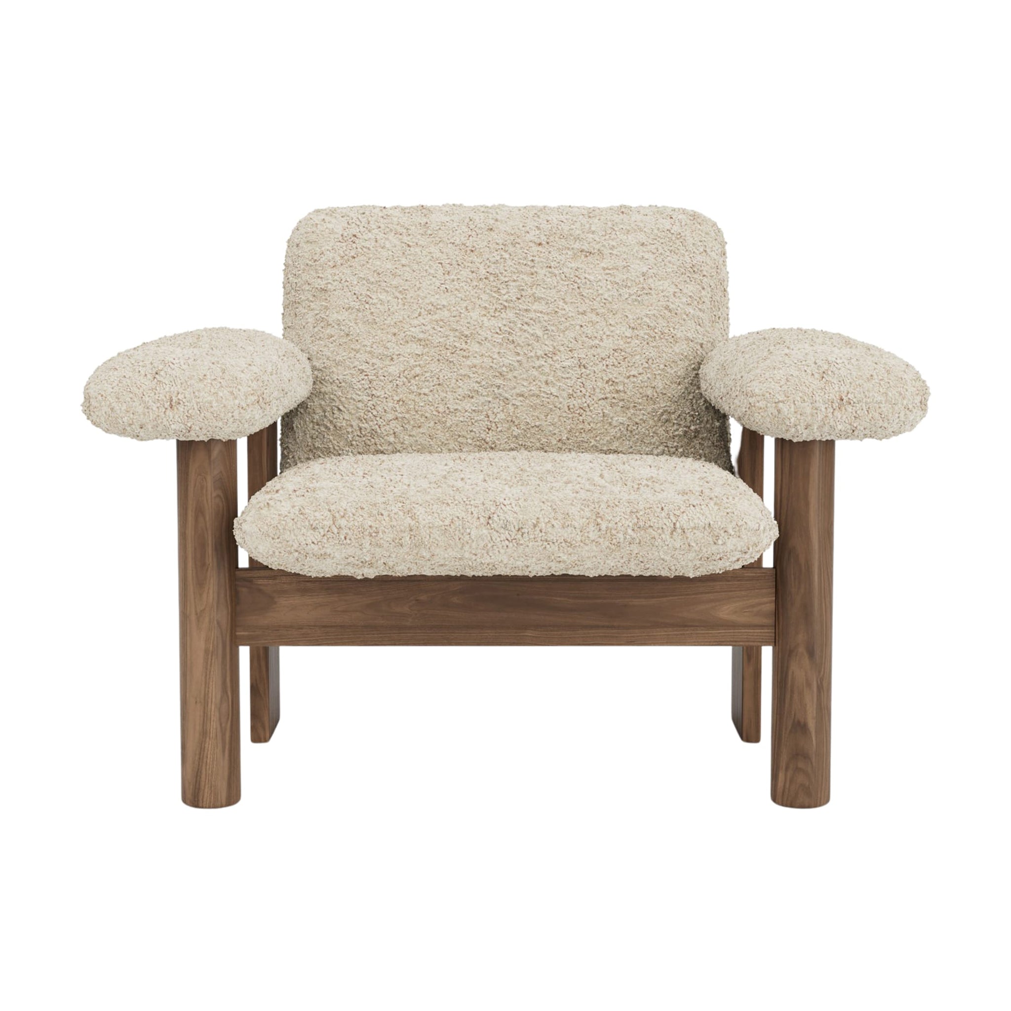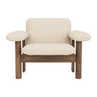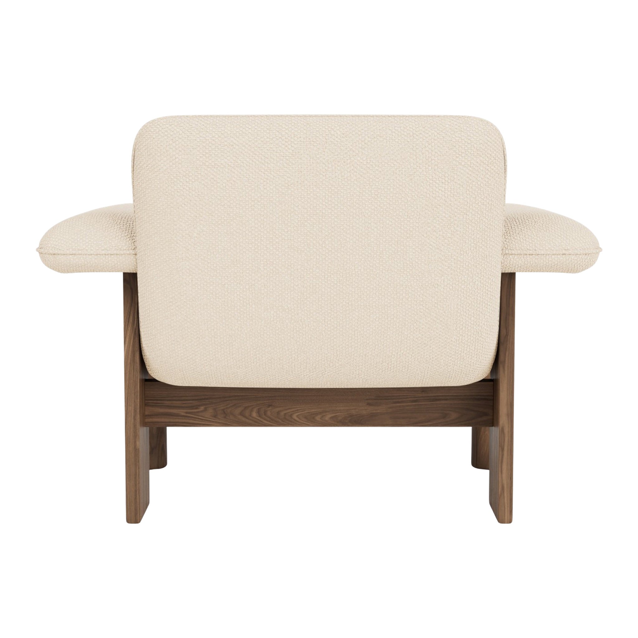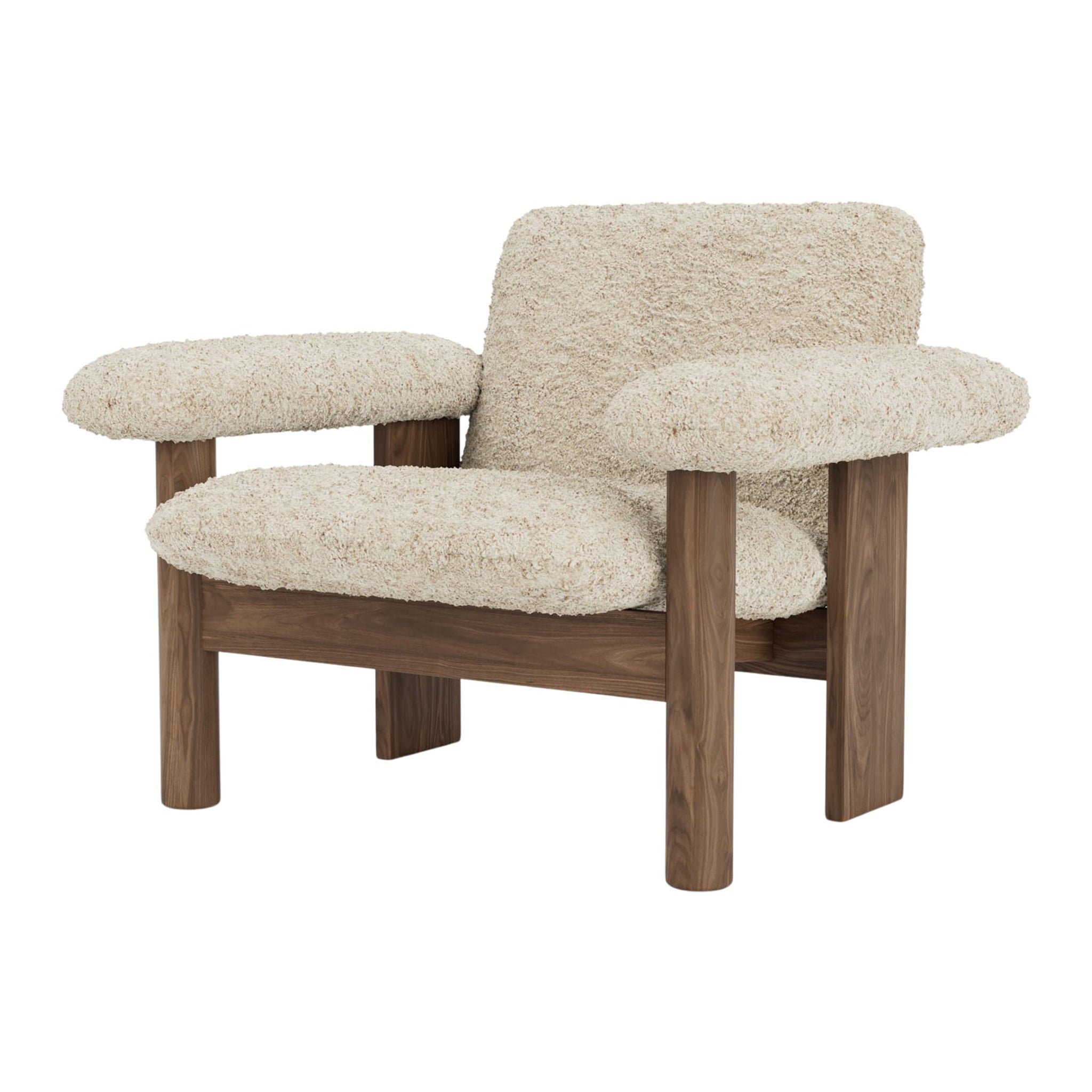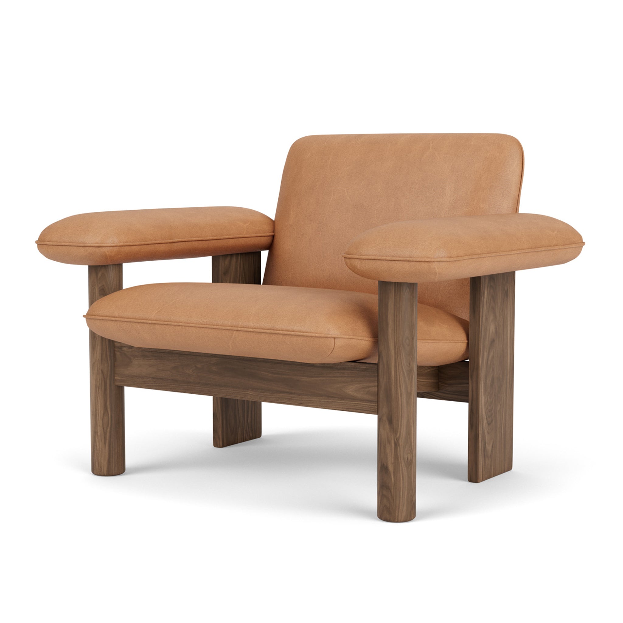 The low profile and enveloping embrace of the Brasilia Lounge Chair invites relaxation. Angled to enhance sitting, this lower version of the original Brasilia chair design rests on the collection's characteristic solid wood frame that features rounded front legs, exaggerated armrests and textile or leather upholstery for a cosy and comfortable experience. At once iconic and modern in its expression, it takes its design cues from Scandinavian mid-century aesthetics and Brazilian modernism.
