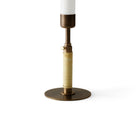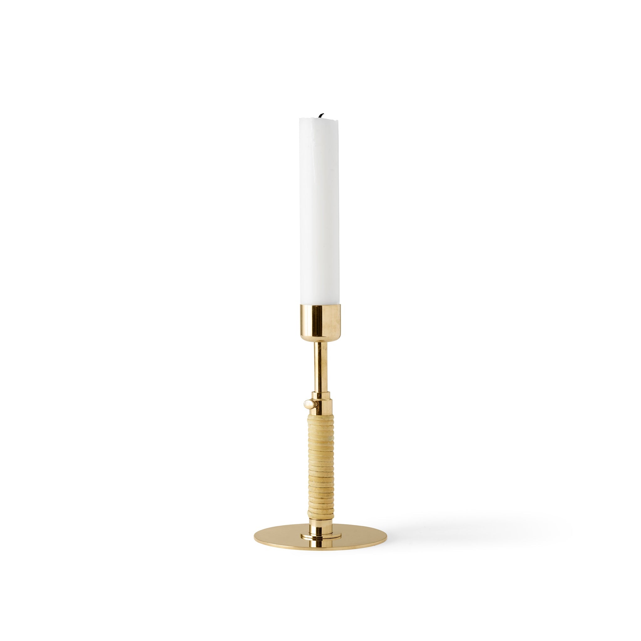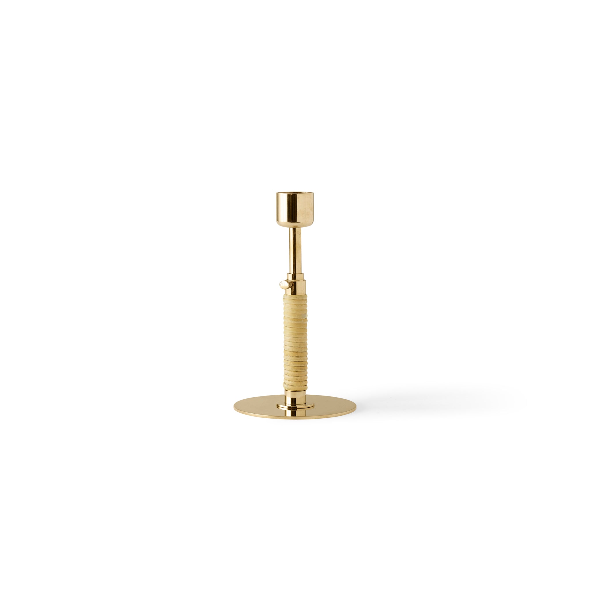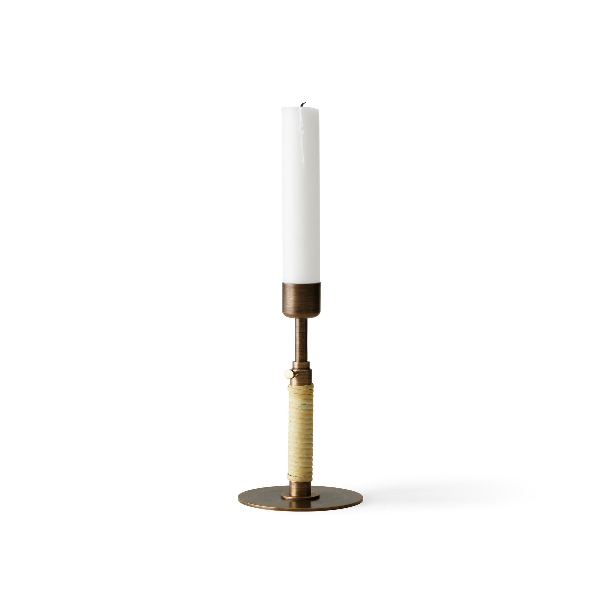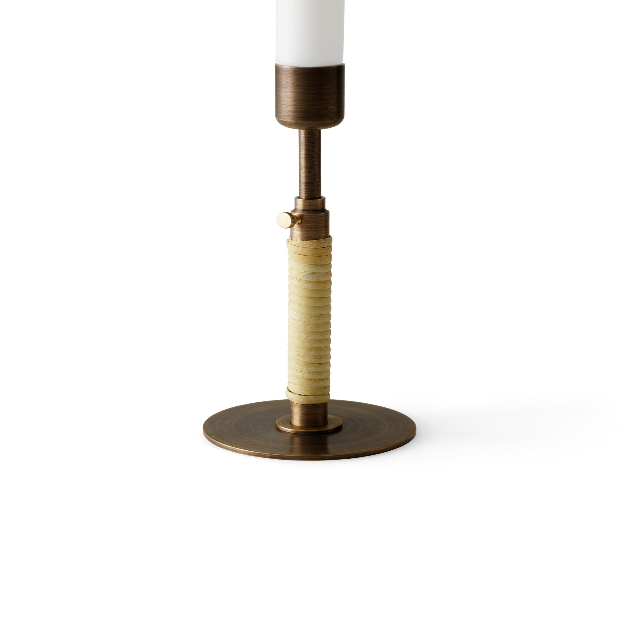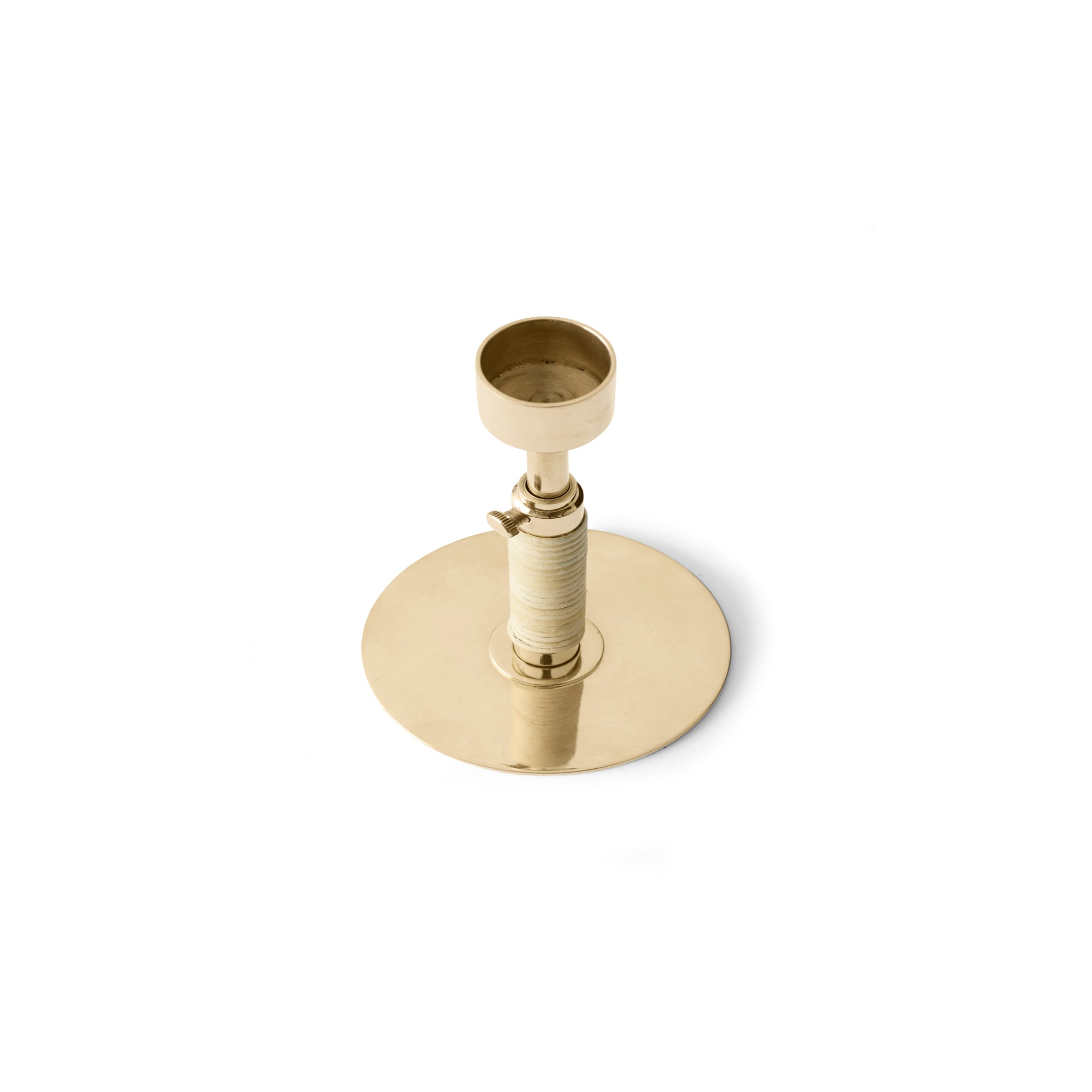 Set on a circular base and stem in polished or bronzed solid brass, the Duca candle holder is detailed with rattan around its stem. A small screw on the side of the design allows the user to adjust the height - extending or shortening the telescopic stick to the desired effect.
