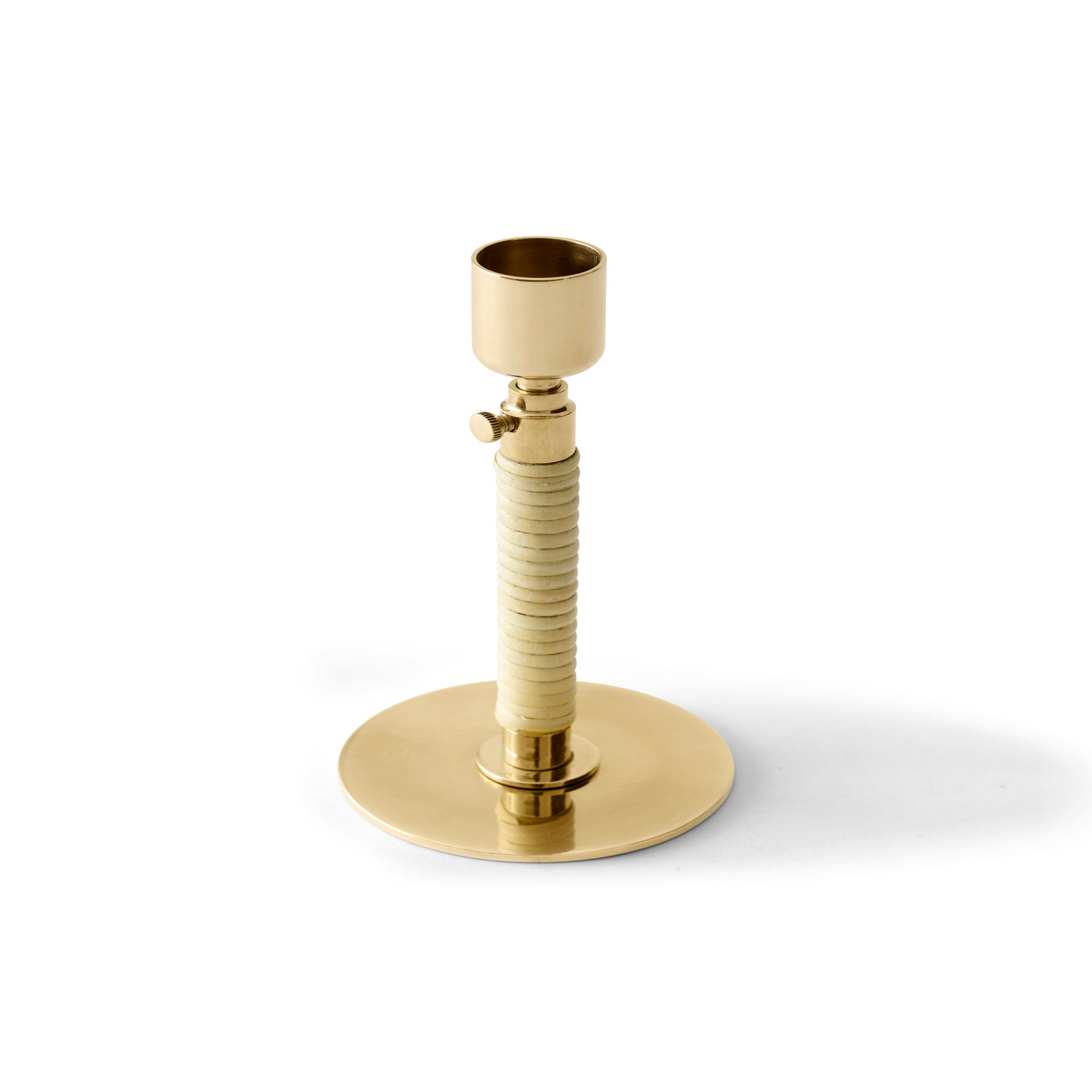 Taking its name from the latin word for "extend," the duca candle holder does exactly that: by loosening the screw on its slender stem, the height of the design can be adjusted as the candle burns. Cast in polished or bronzed brass and detailed with rattan enfolded around its lower half, the simple yet impactful design brings a sense of intimacy and warmth to its surroundings.