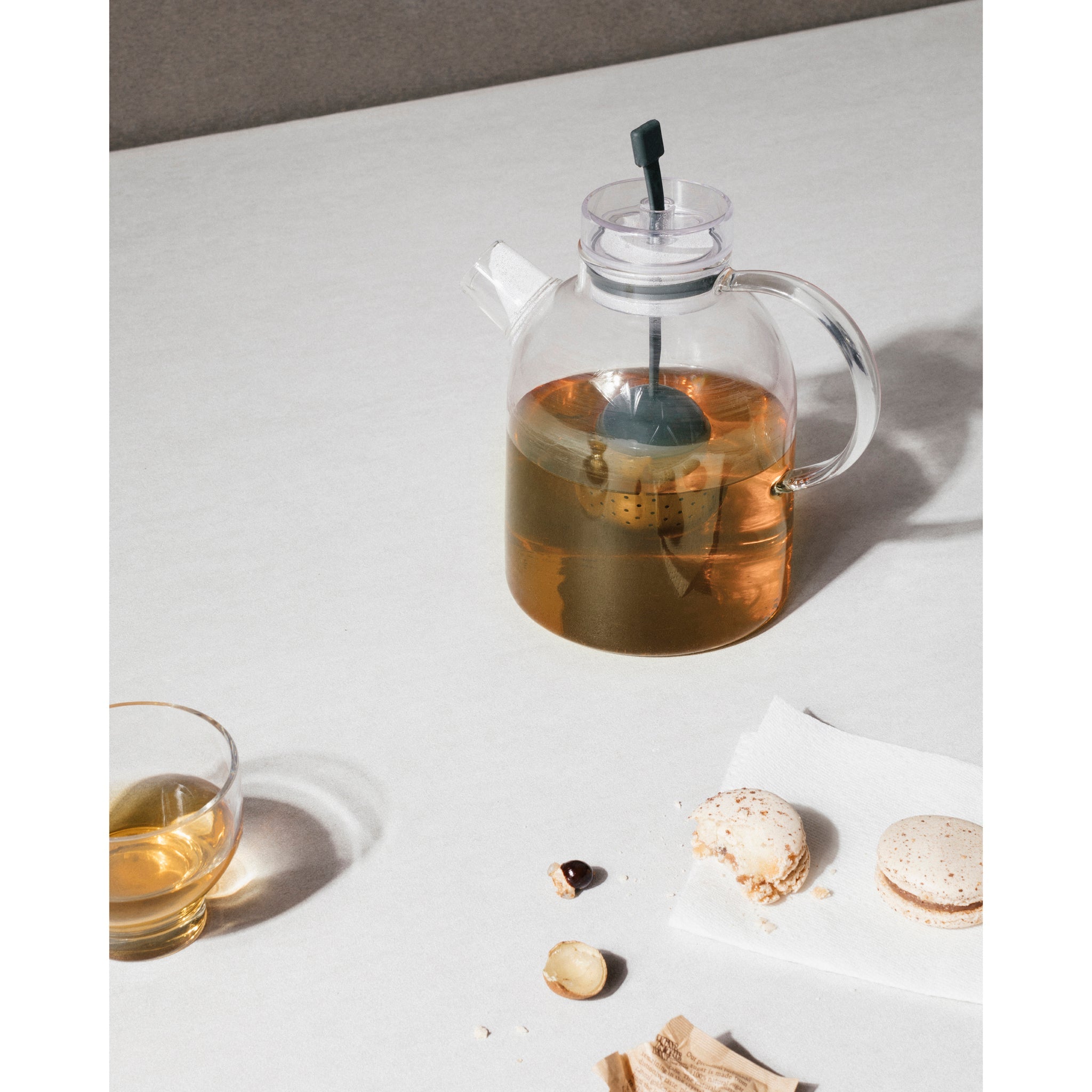 Glass teapot with tea infuser that hangs by a silicone string, serving as a stylish teabag in the middle of the teapot. The pot can contain 1,5 liter. Inspired by classic, Oriental teapots - in a harmonic fusion with modernistic, Scandinavian design.