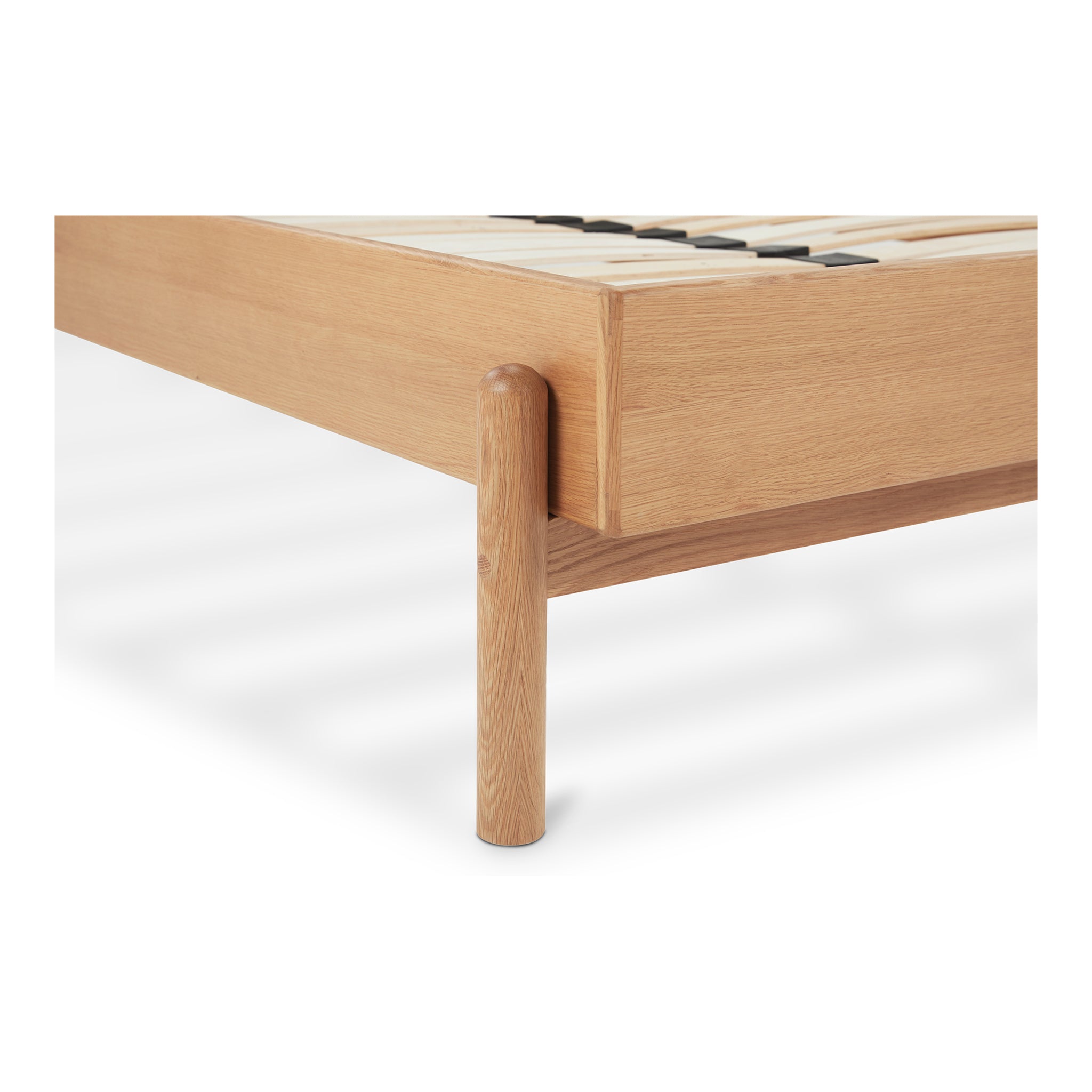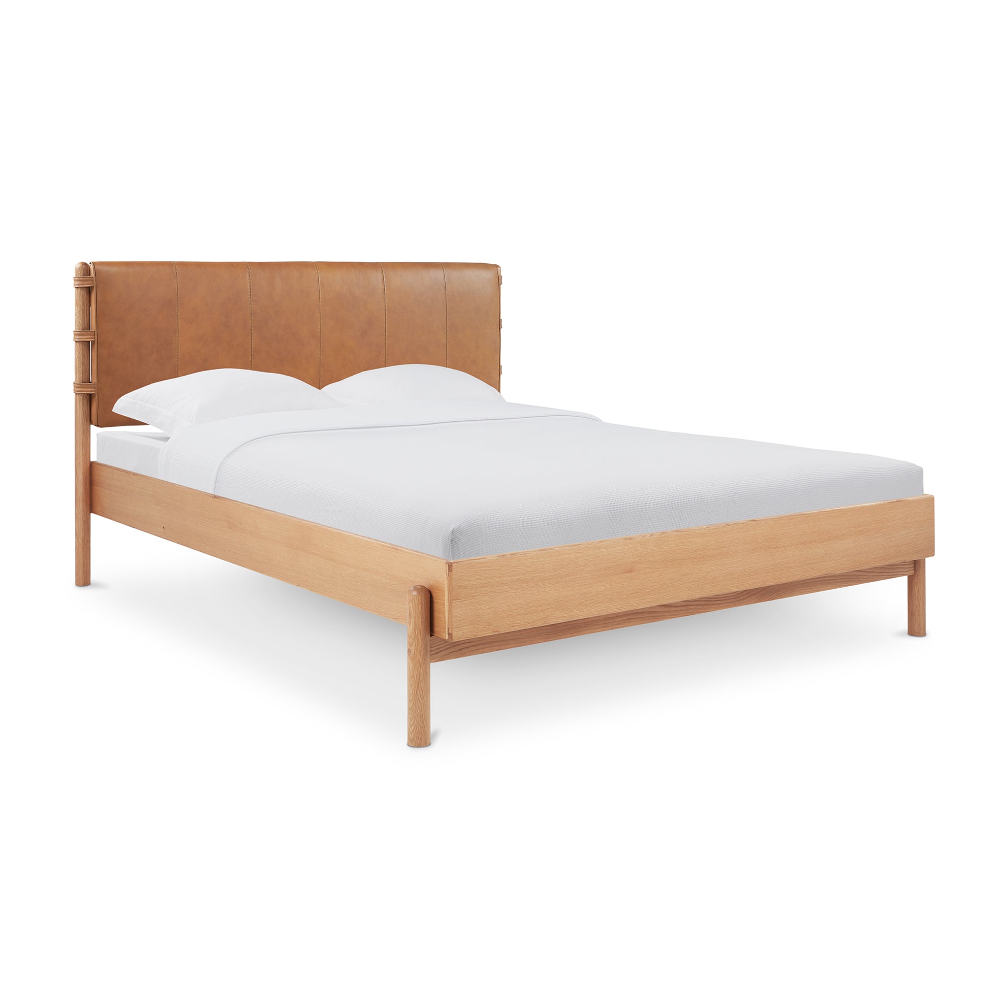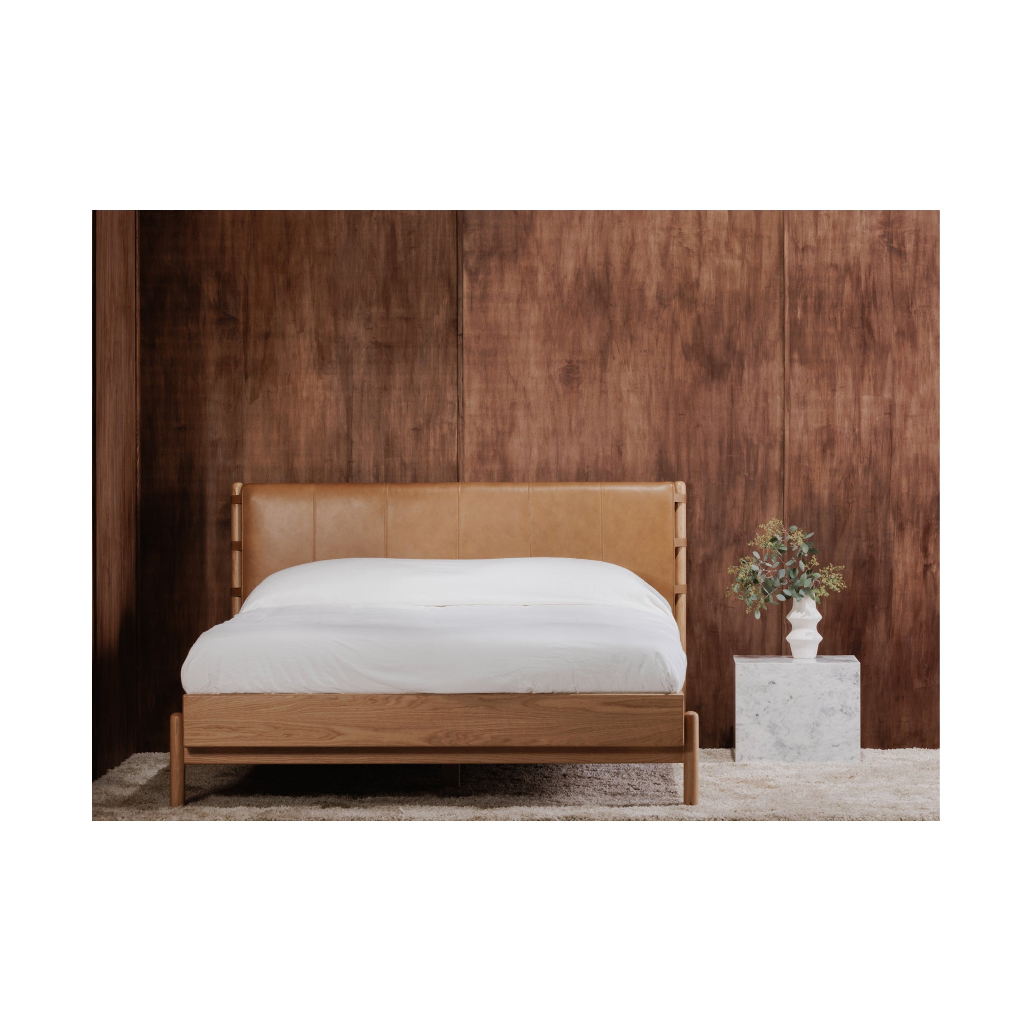 Crafted with a high-quality leather headboard and rounded solid oak legs, the Caleb King bed frame elegantly brings understated luxury with superb craftsmanship. The soft curves of the leather headboard provide a sense of warmth and coziness, while the rounded legs add a touch of organic form to the overall design. The clean lines and natural materials create a harmonious and sophisticated piece, fitting seamlessly into any contemporary space.