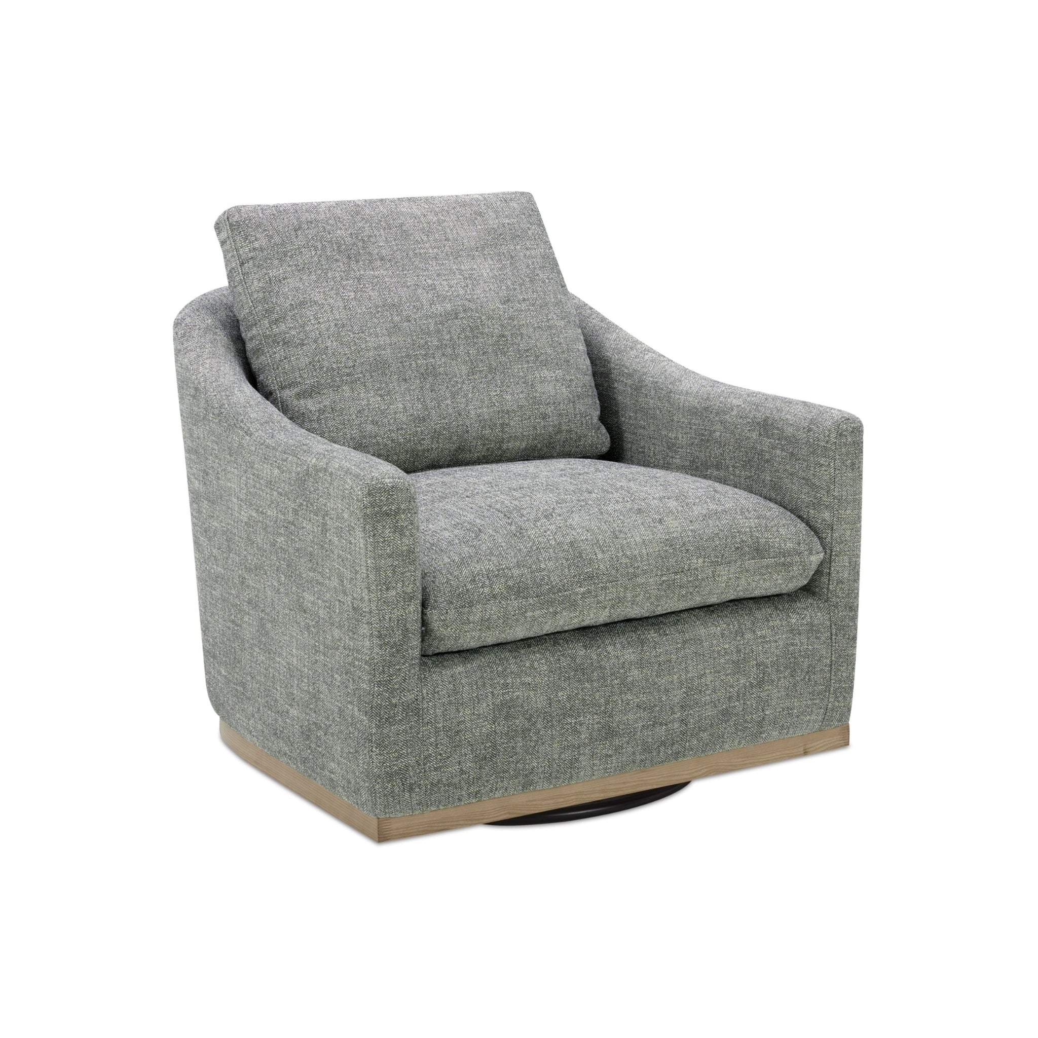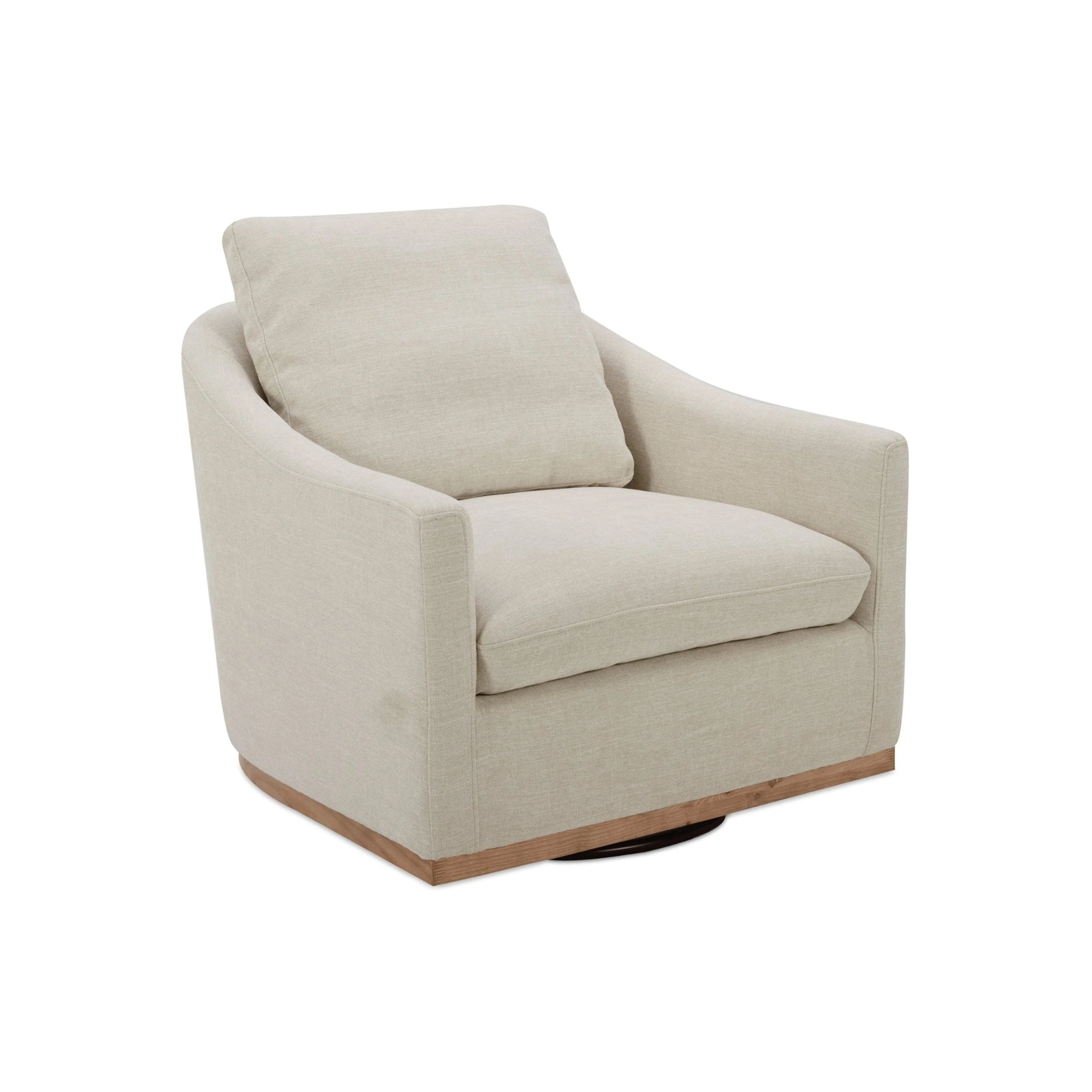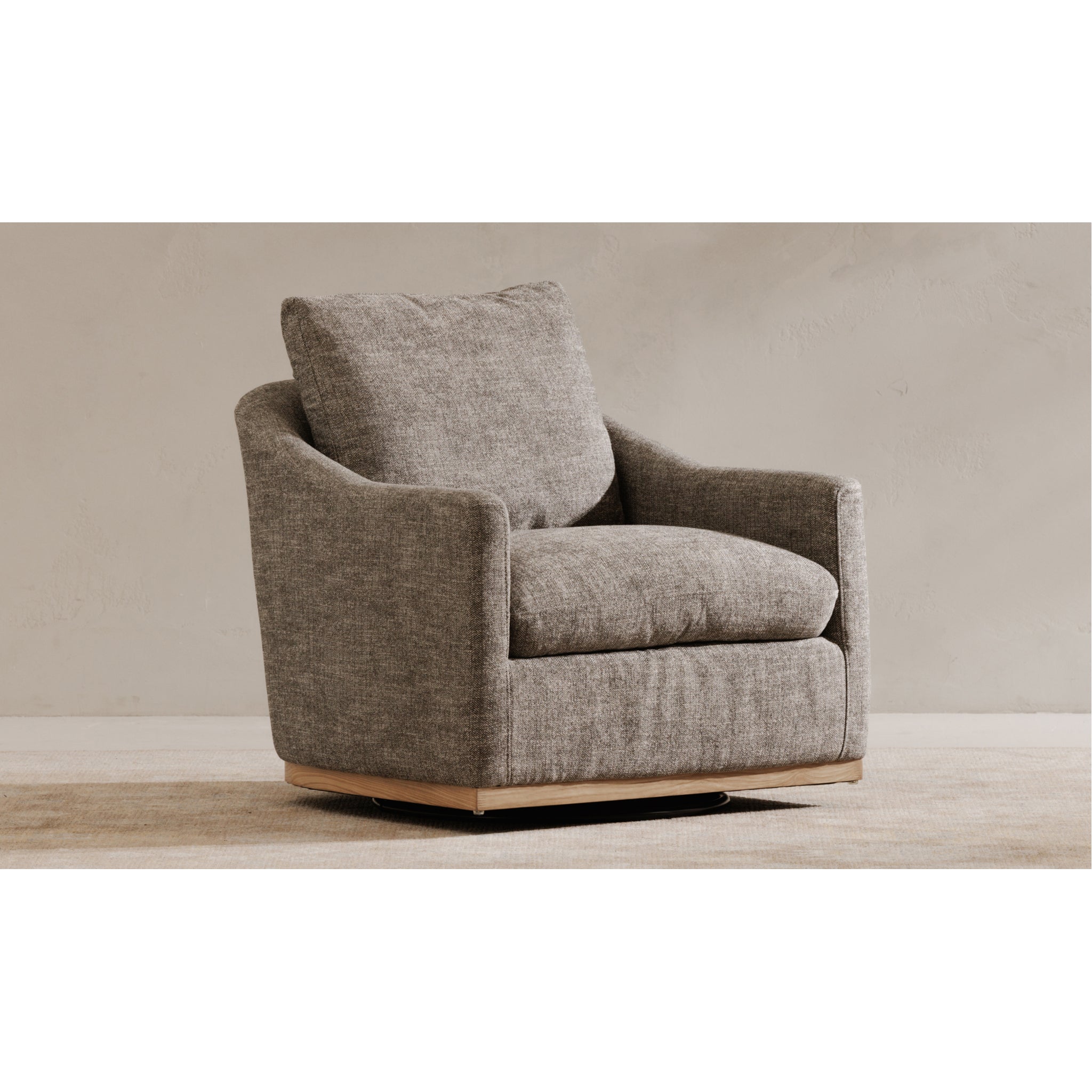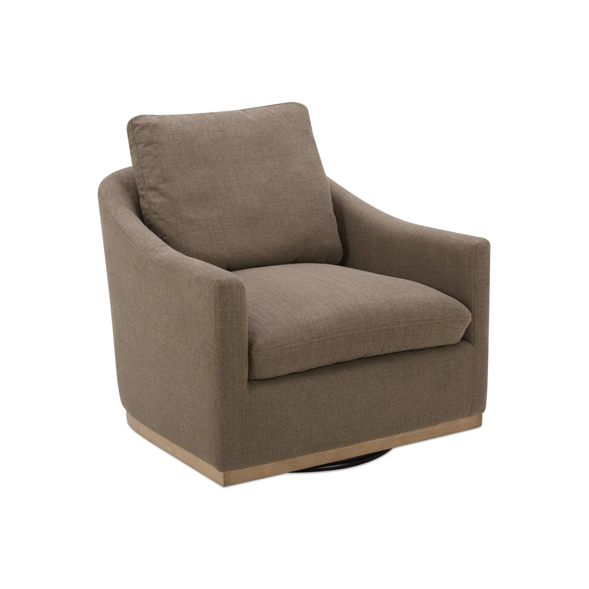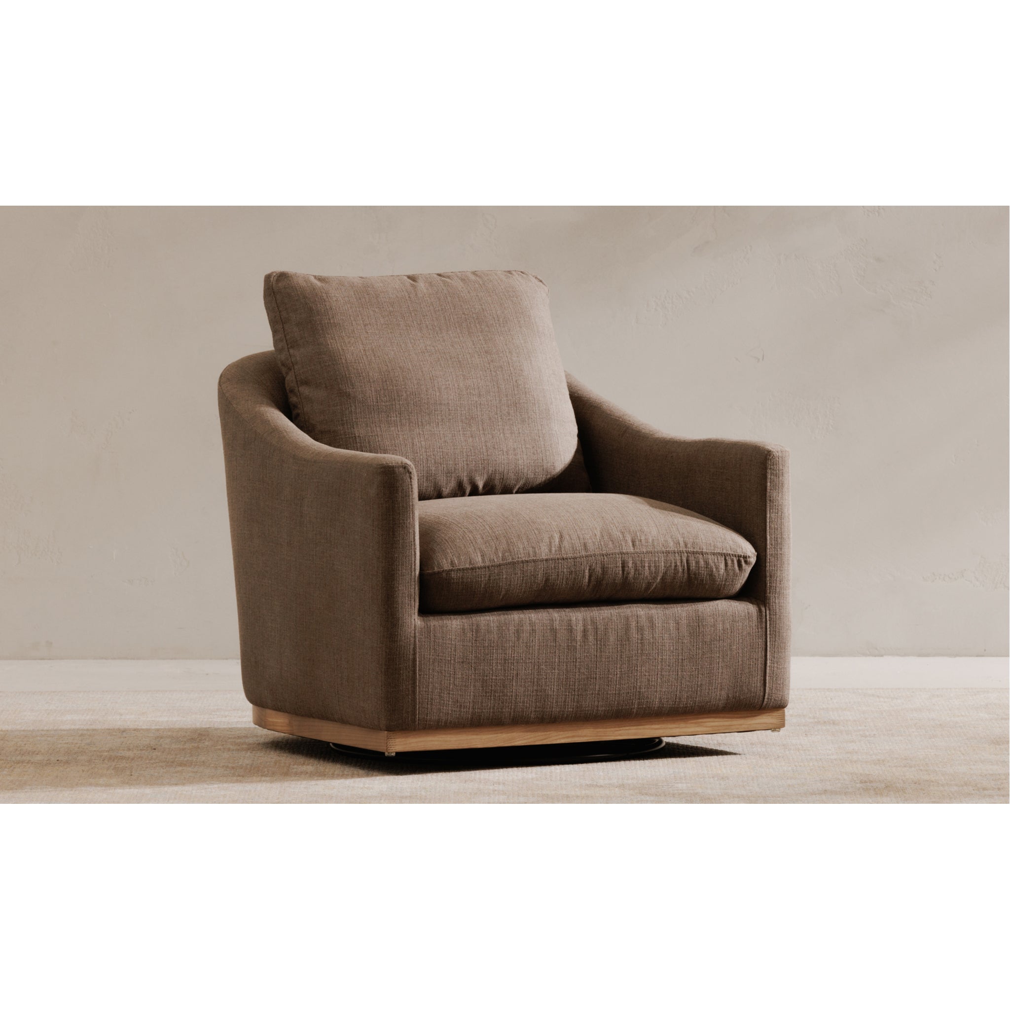 The Laurence swivel chair features a curved barrel back paired with a generously sized toss cushion support. A smooth, solid wood base completes the look with a 360° swivel function for an updated, sophisticated feel.
