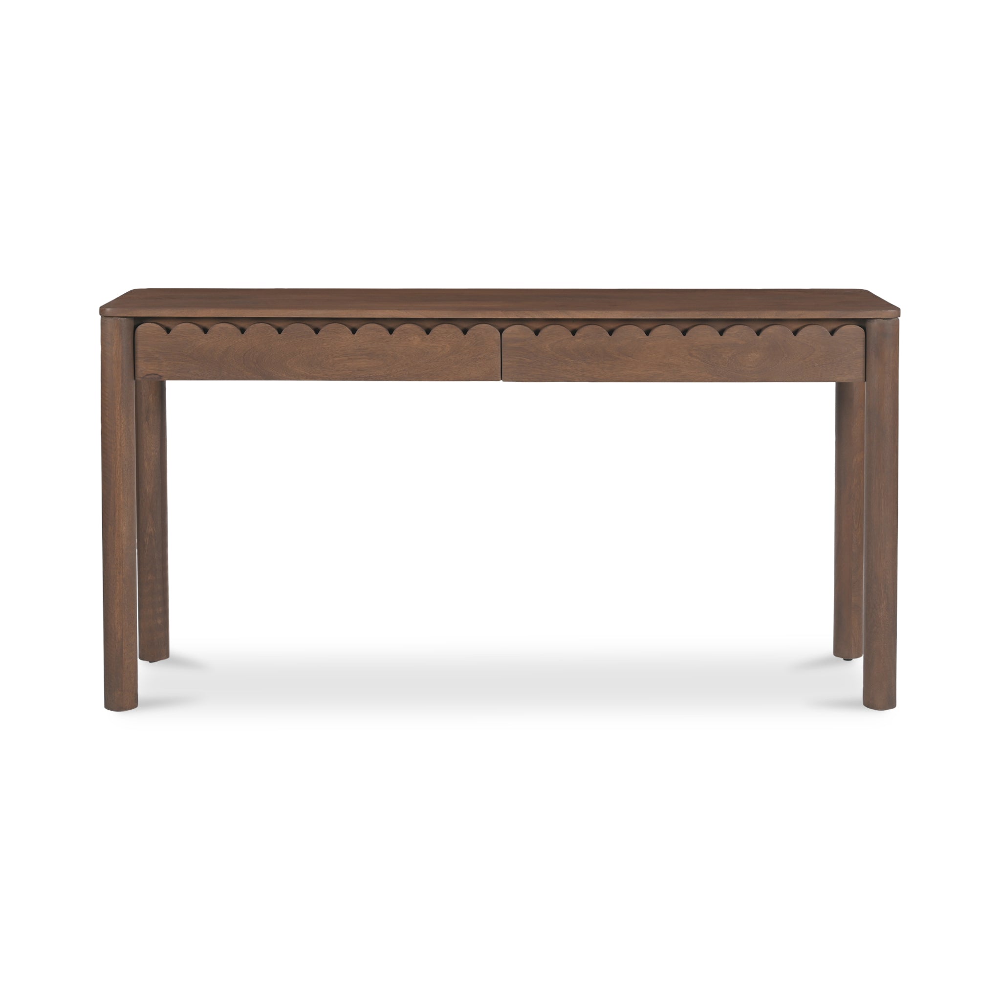 Modern aesthetics effortlessly blend with the refined simplicity of traditional Shaker design in the Lola console table. Meticulously crafted, its elegant form is defined by sleek, geometric curves that add a captivating touch of modernity. The post legs stand as pillars of strength, grounding the console table with their understated presence. A showcase of intricate scalloped edge details to the faces of the two drawers lends a timeless charm reminiscent of classical influences.