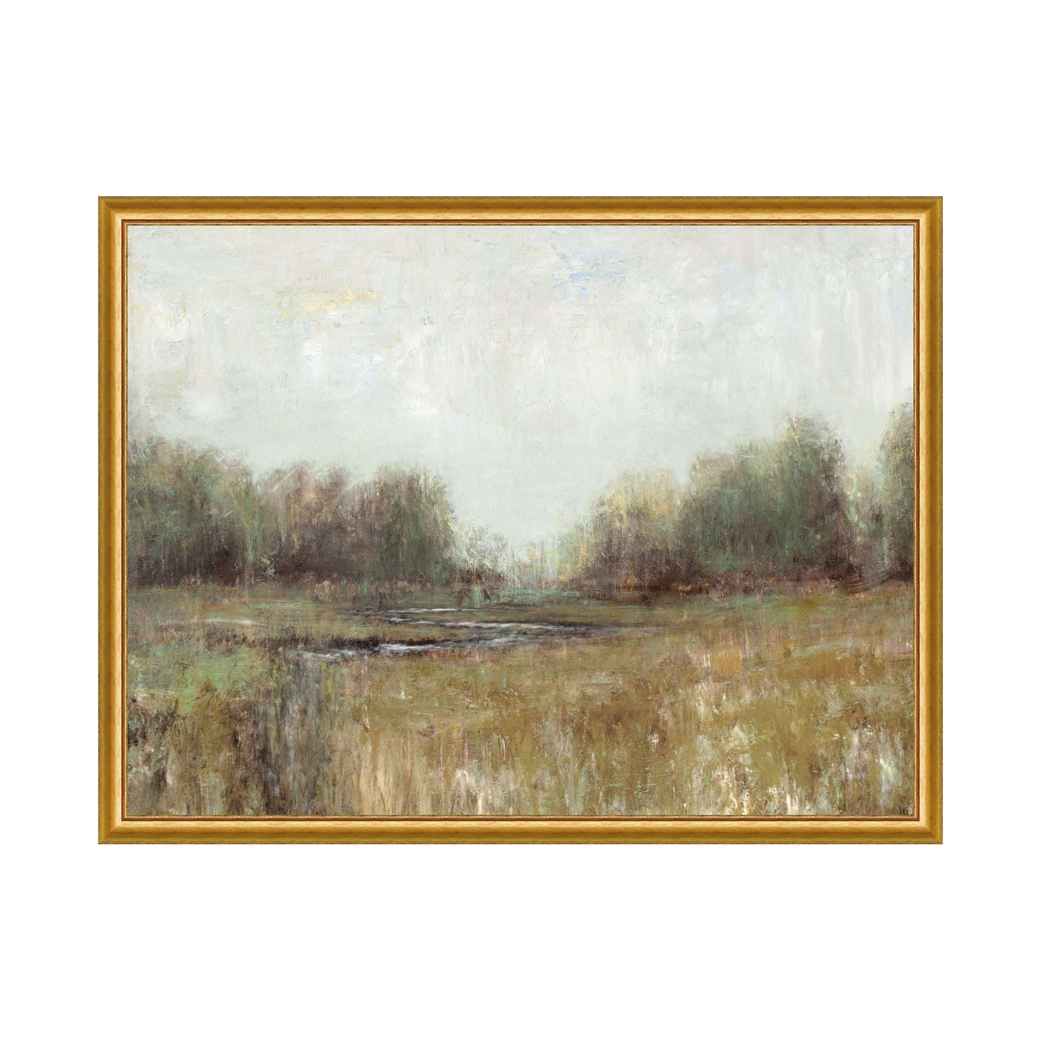 Misty Stream is a tranquil artpiece that transports you to the heart of nature's beauty. With subdued tones and a captivating portrayal of a gentle stream winding through a grassy meadow, this artwork, gallery wrapped and artistically enhanced, invites you to embark on a peaceful journey. The subtle play of light and shadow, the distant trees, and the quiet elegance of Misty Stream create a sense of serenity and harmony. Finished with a gold frame.