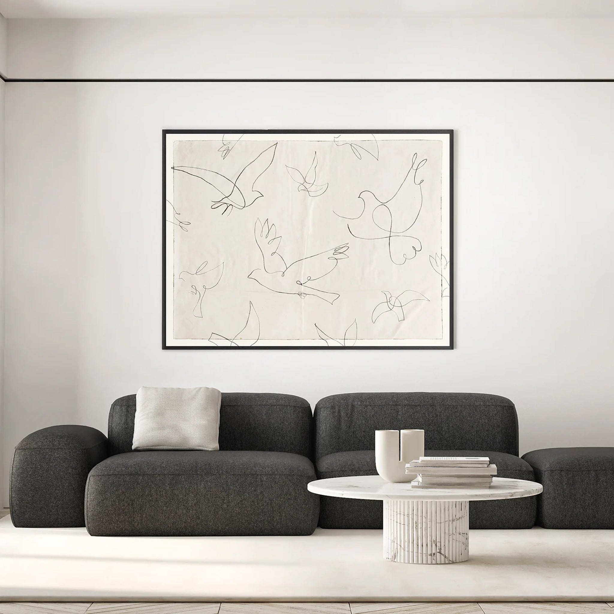 This mid-century inspired work of art captures a minimalist aesthetic rendered on textured paper and framed in dramatic dark wood. It features a series of birds playing mid-flight and makes an eye-catching focal point either as part of a grouping or as a standalone conversation piece. Add the serenity of their winged play to any room in your house.