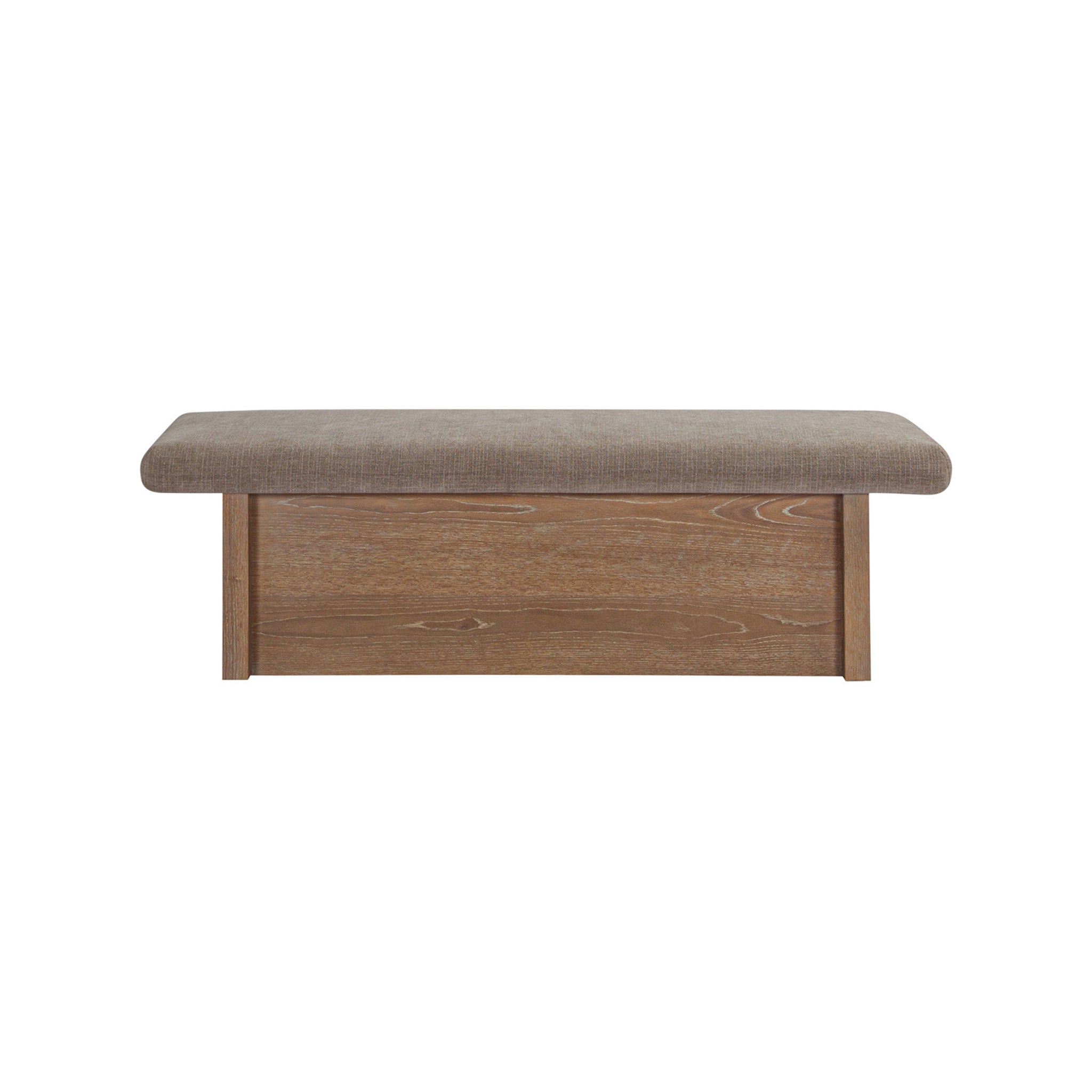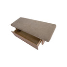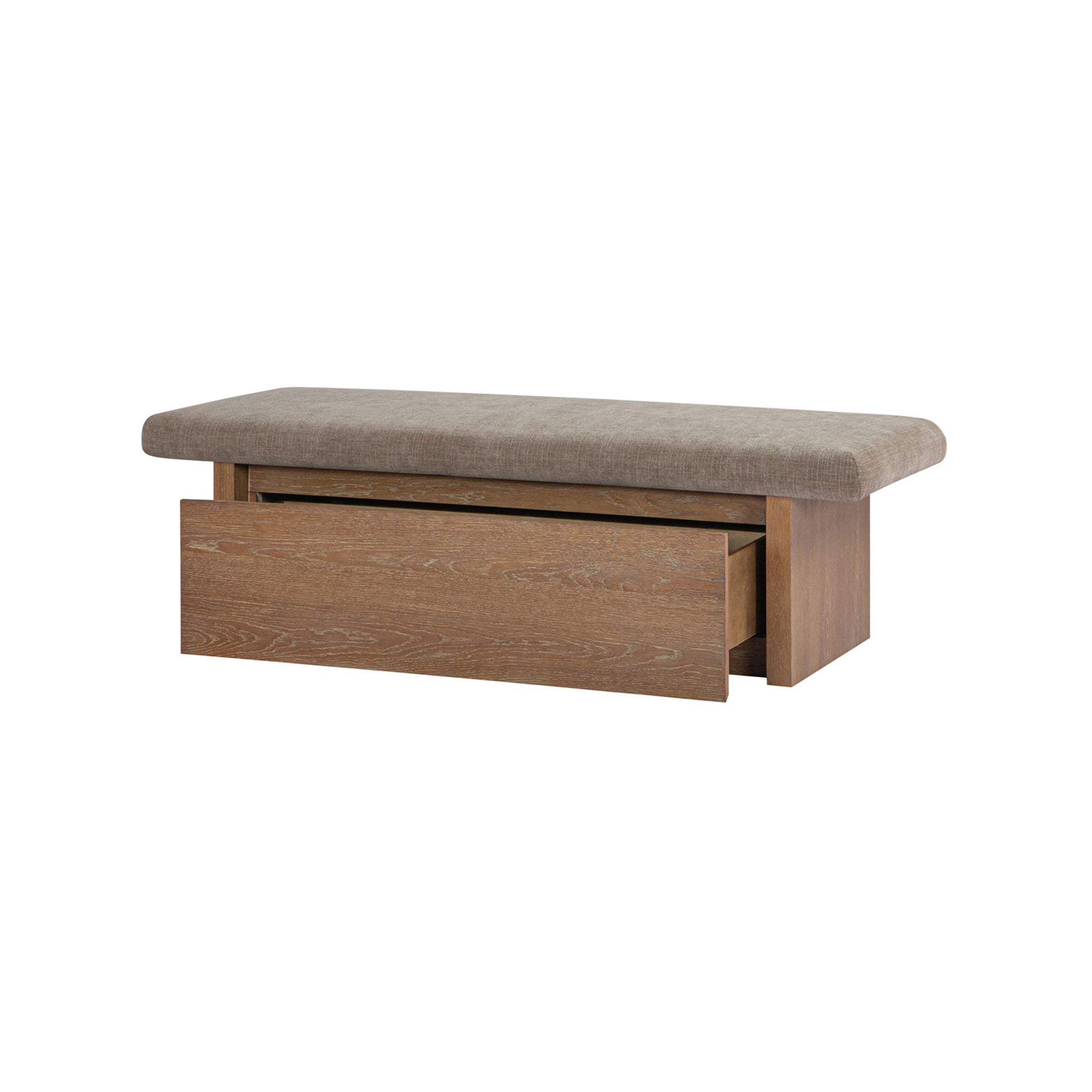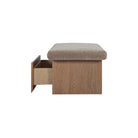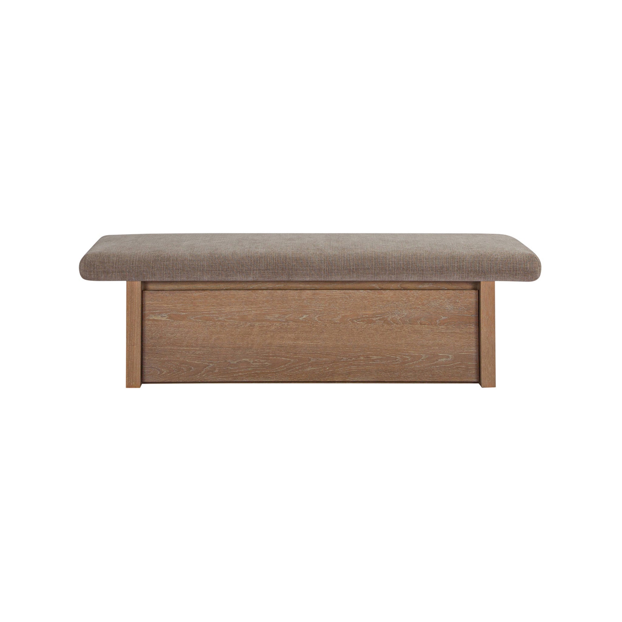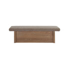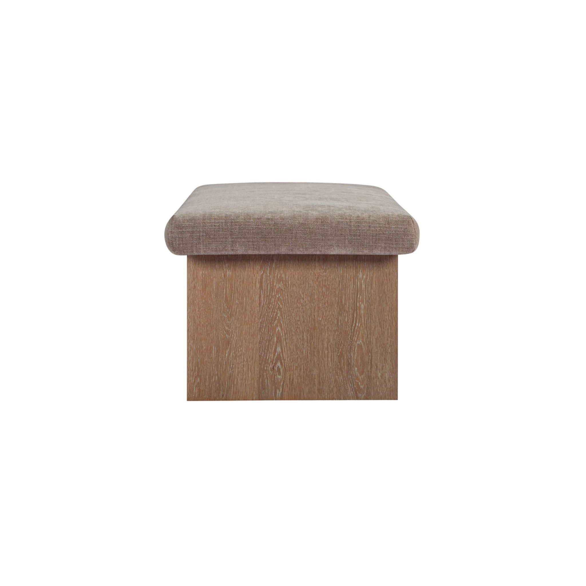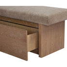 The Gina storage bench marries contemporary elegance with versatile, functional design. Its generous, deep-seated top is wrapped in a soft, muted chenille, that effortlessly transitions the bench from entryway statement to sophisticated coffee table or seating at the foot of a bed. The recessed wooden base invites functional repose as a sleek wire-brushed drawer offers ample storage.