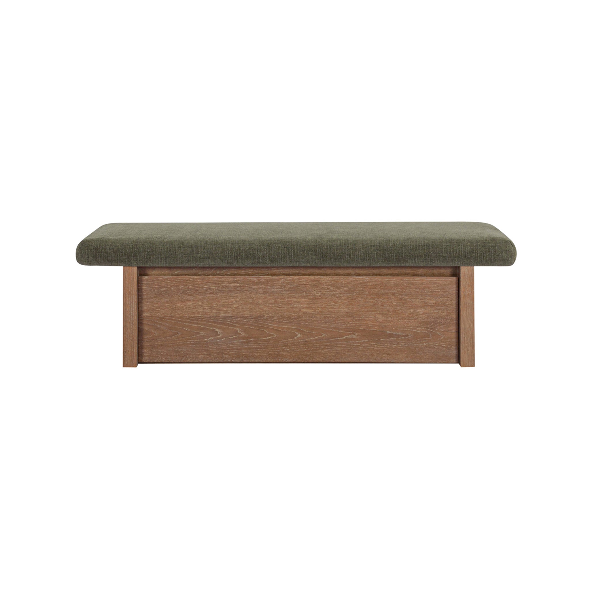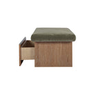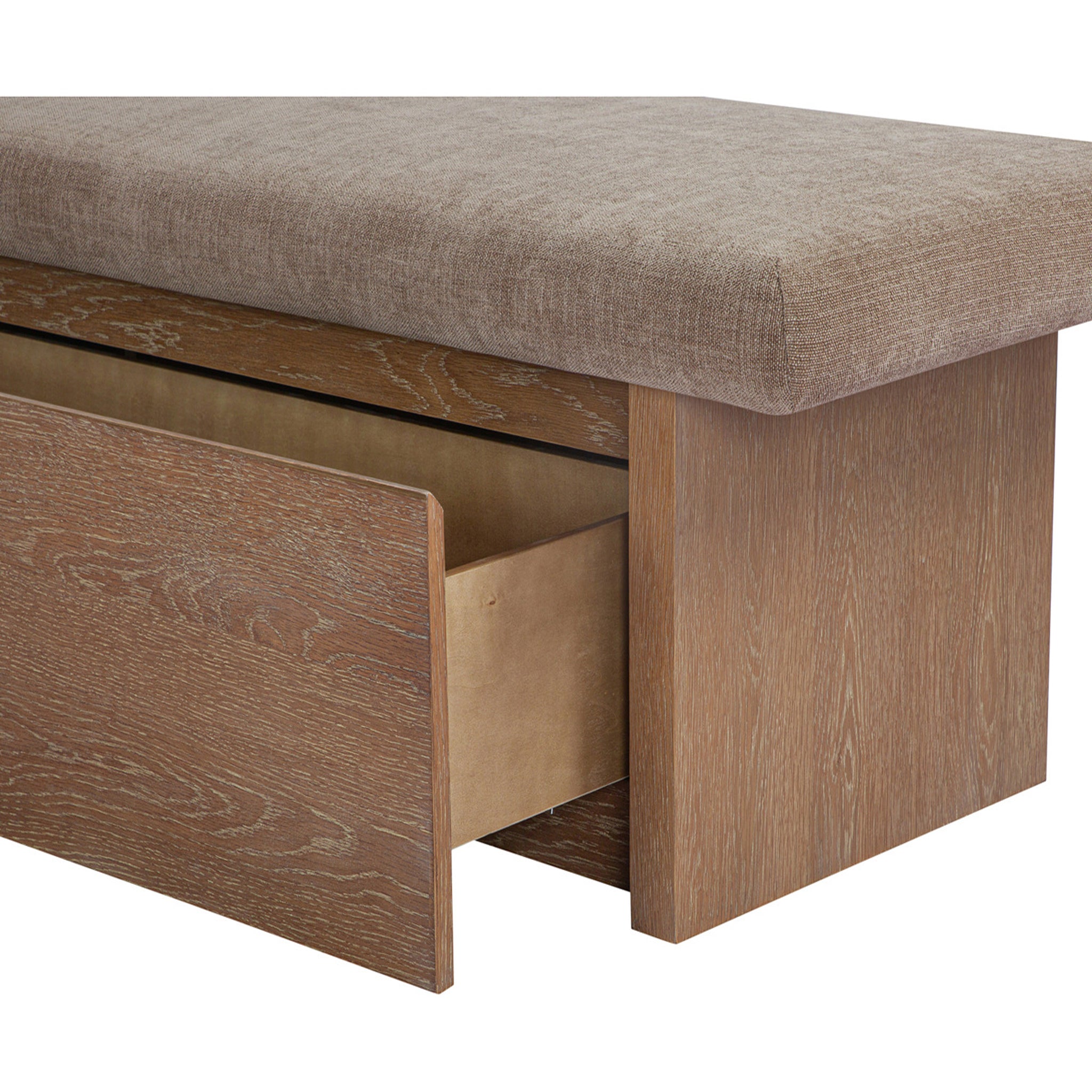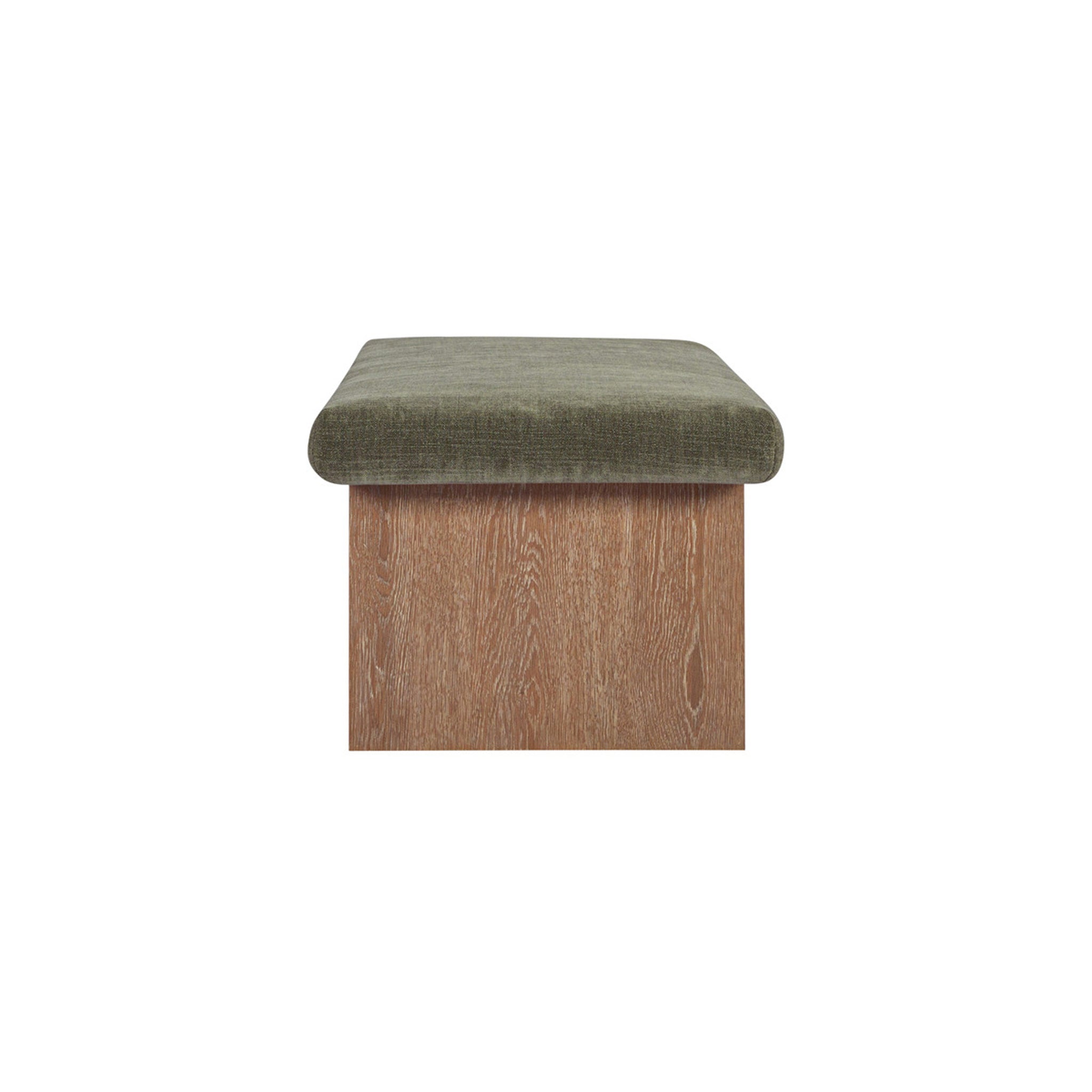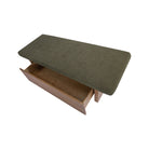 The Gina storage bench marries contemporary elegance with versatile, functional design. Its generous, deep-seated top is wrapped in a soft, muted chenille, that effortlessly transitions the bench from entryway statement to sophisticated coffee table or seating at the foot of a bed. The recessed wooden base invites functional repose as a sleek wire-brushed drawer offers ample storage.