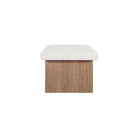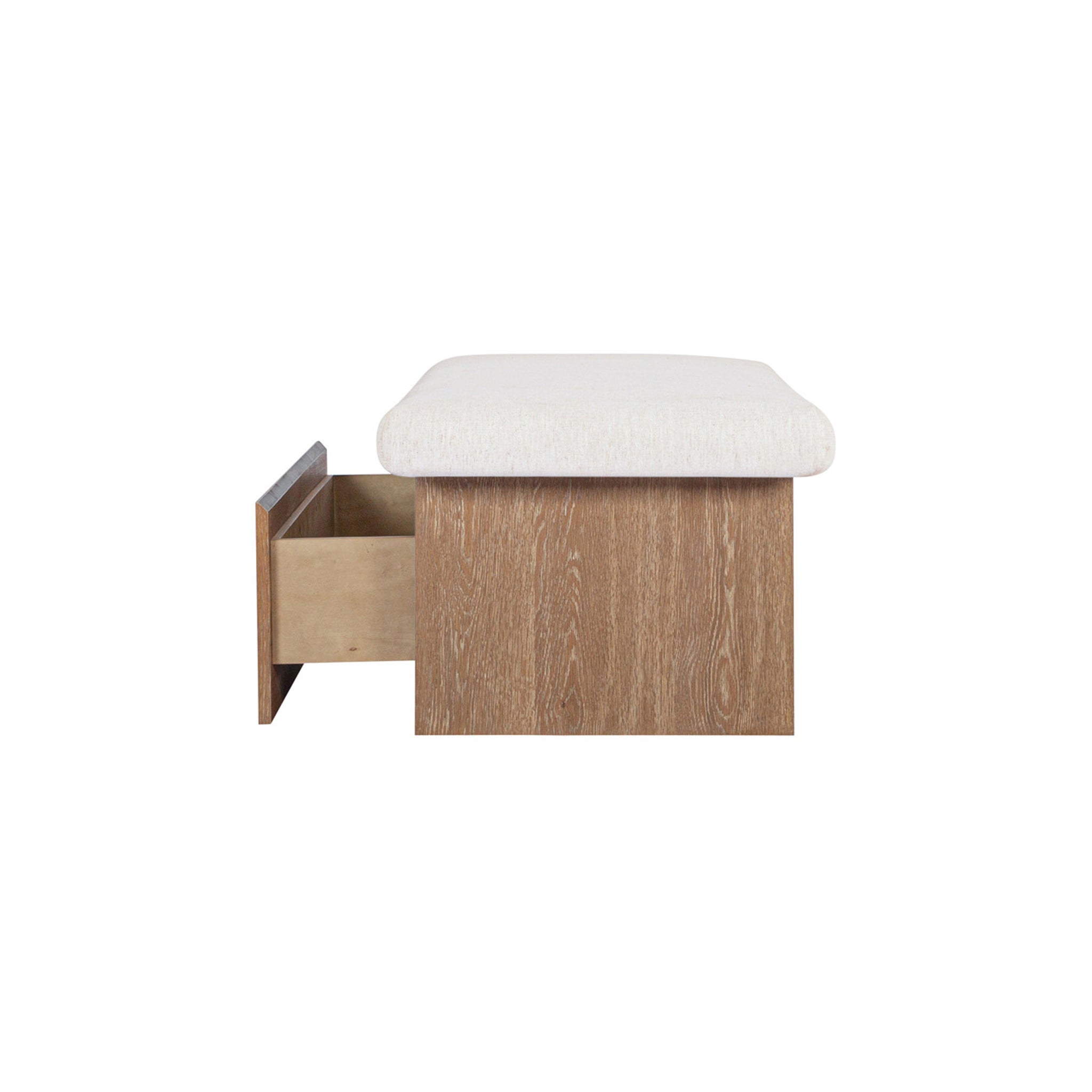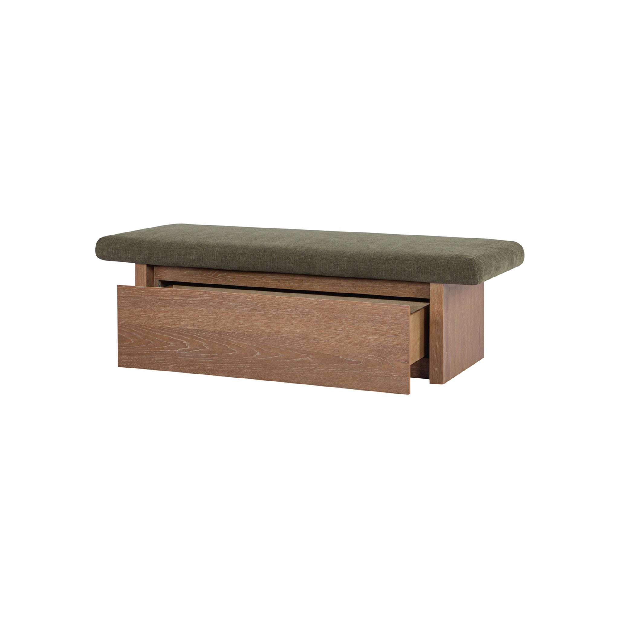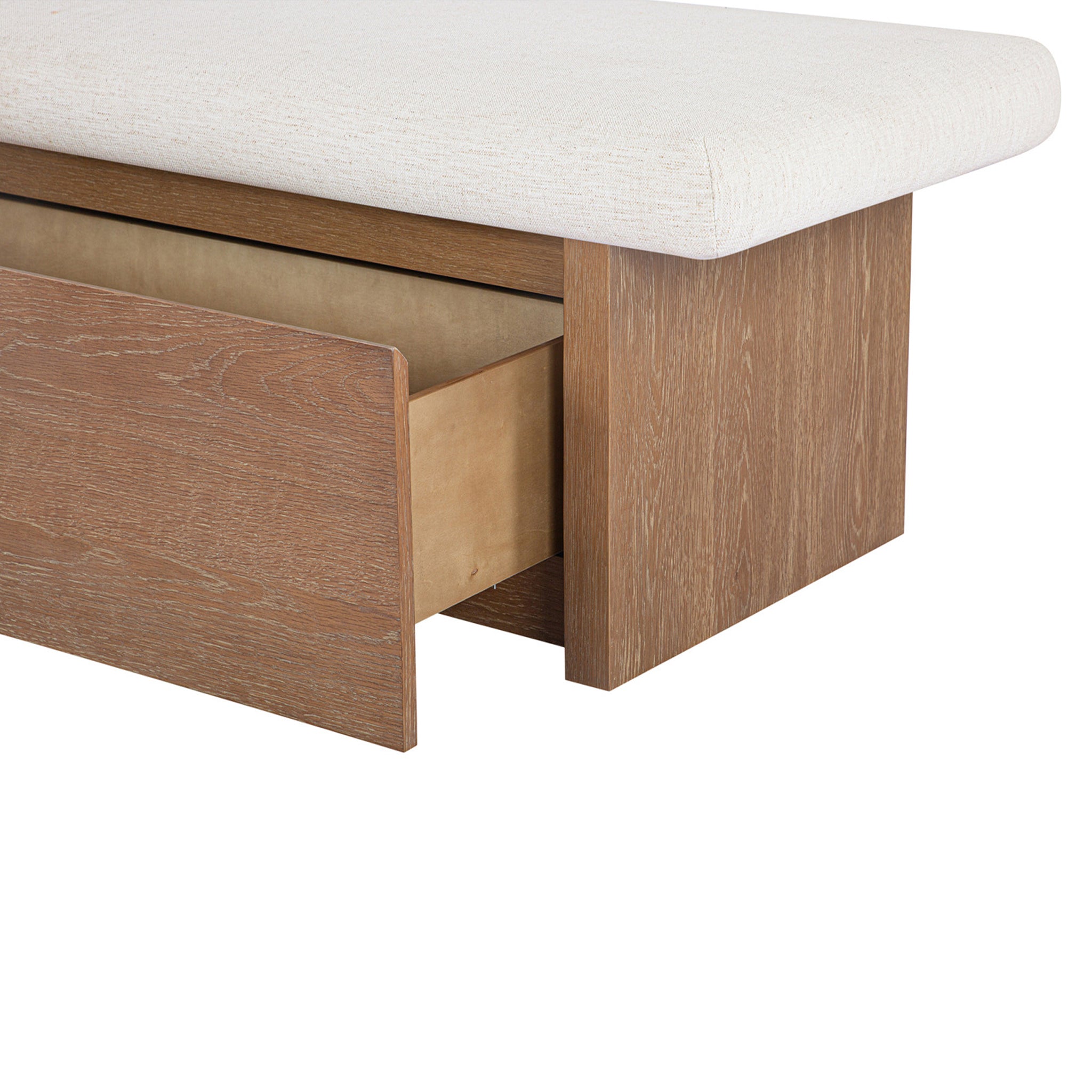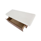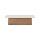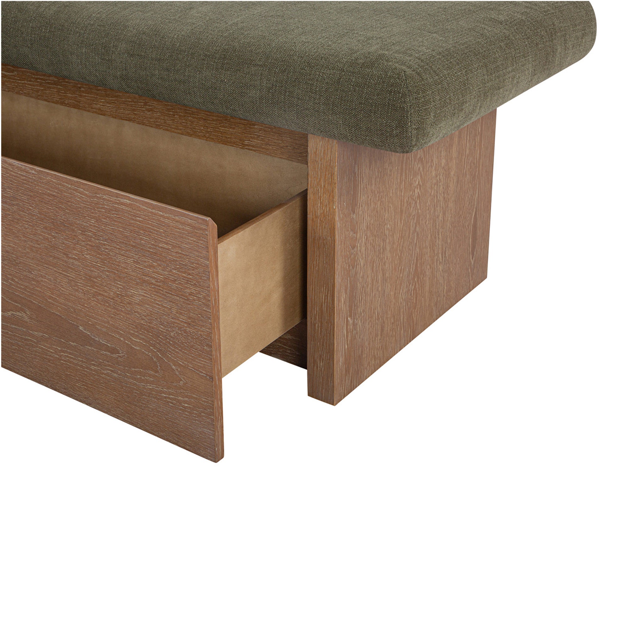 The Gina storage bench marries contemporary elegance with versatile, functional design. Its generous, deep-seated top is wrapped in a soft, muted chenille, that effortlessly transitions the bench from entryway statement to sophisticated coffee table or seating at the foot of a bed. The recessed wooden base invites functional repose as a sleek wire-brushed drawer offers ample storage.