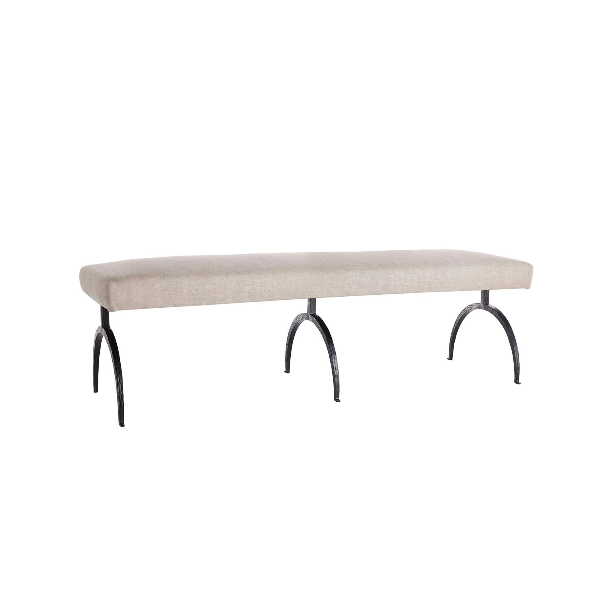 A long, rectangular seat rests on a perfectly poised iron frame with curved legs to compose the foundation of the bahati bench. blackened iron has been hand-forged, yielding delicate details along its thin frame. the seat's cushion is covered in a natural linen.