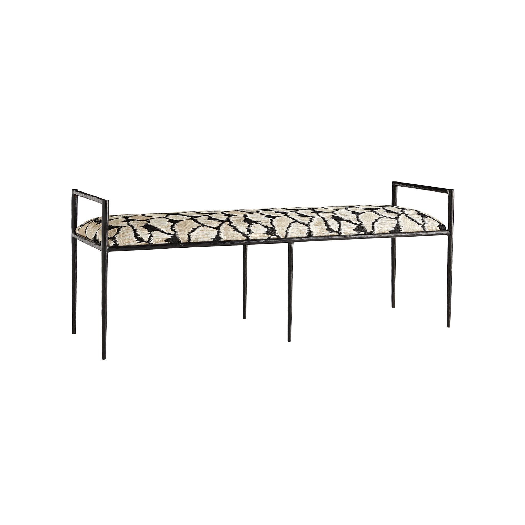 The barbana bench raises the bar for stylish seating options. its frame is perfectly poised perched on delicate legs as faint as an insect's. the natural iron body is hand-forged yielding soft impressions along the sharp-angled frame. the tightseat is covered in a regal ocelot embroidered linen.