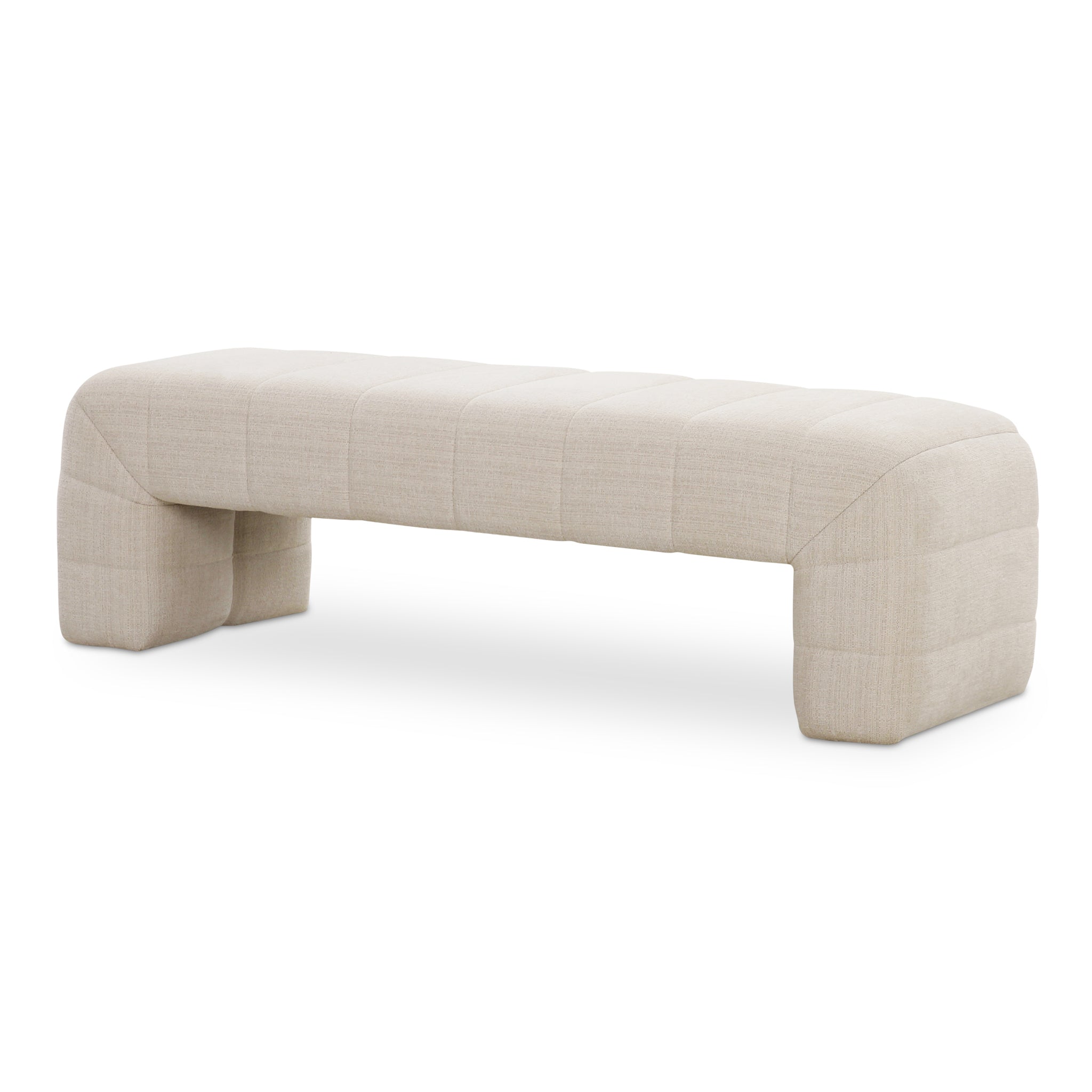 The Violet bench features a plump form enveloped in warm upholstery for a touch of elegance. Wide channel detailing adds texture and visual interest, complemented by rich, warm tones that tell a story of comfort and coziness as the high-density foam seat provides a plush seating experience.