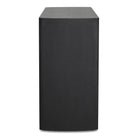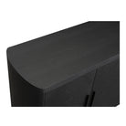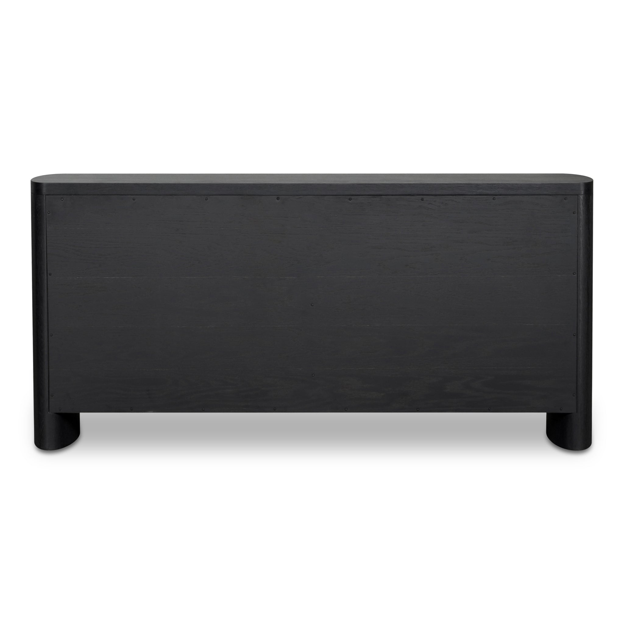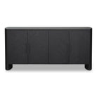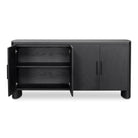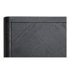 The Ophelia sideboard showcases a sleek, modern silhouette with a rounded edge frame and base. A herringbone pattern embellishes its door front, adding a touch of sophistication, while the sideboard's rich black stain finish exudes a sense of maturity and timelessness. A charming parquetry pattern adorns the exterior surfaces, infusing rustic elements into any living or dining space.