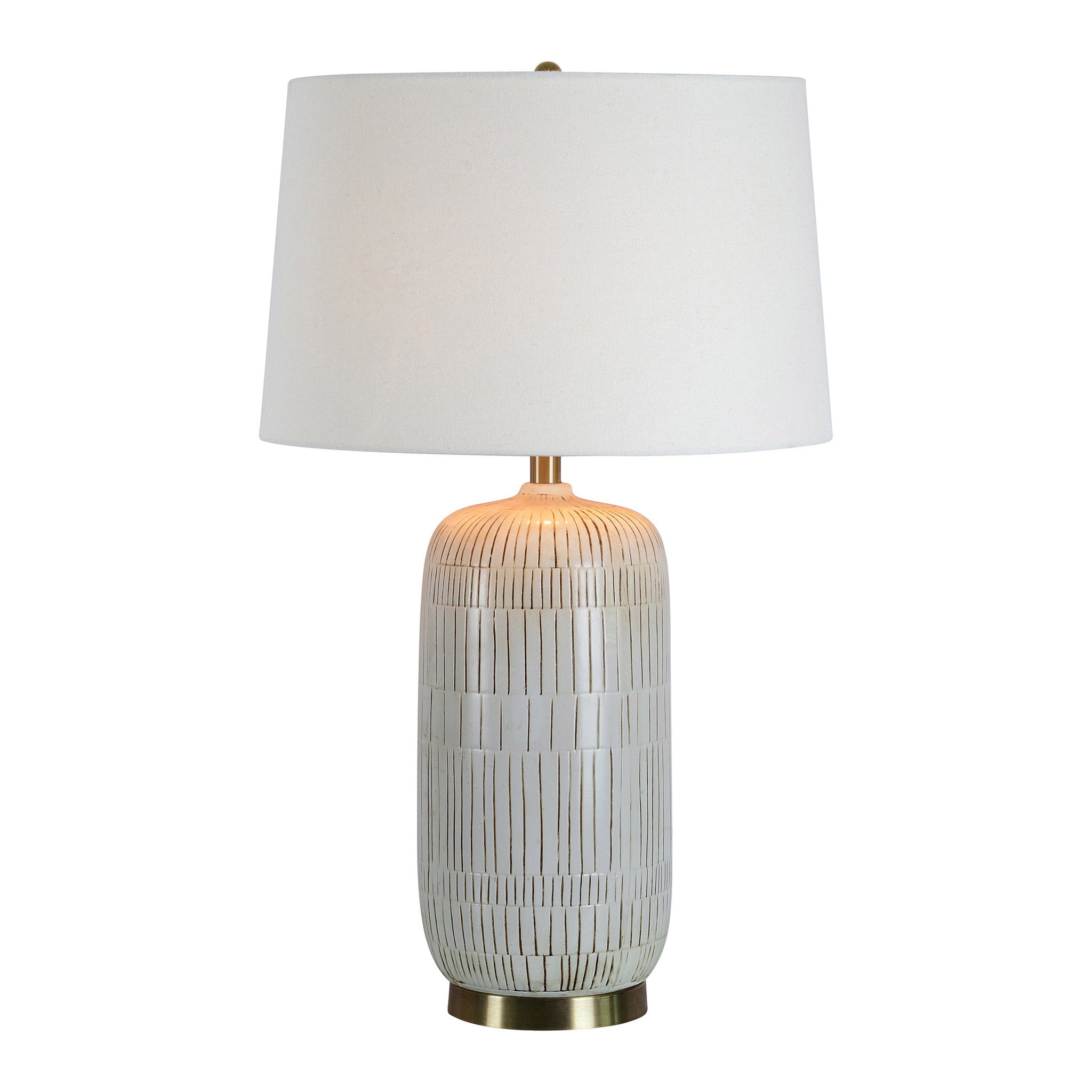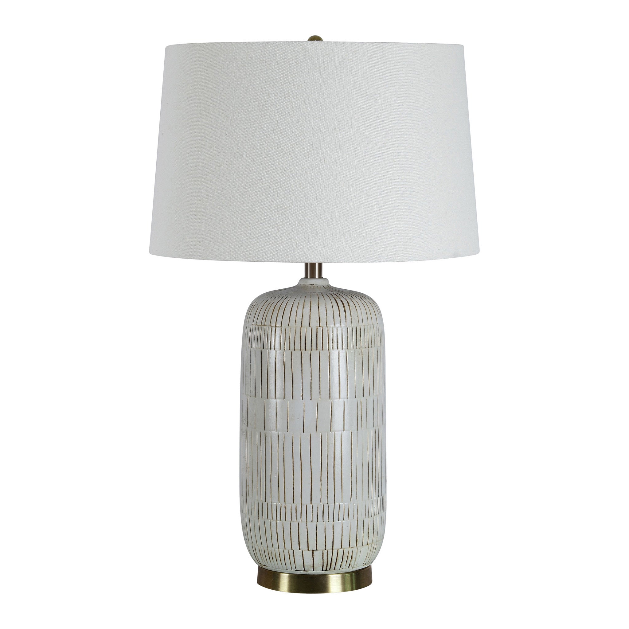 Casual elegance is showcased in this table lamp. The embossed ceramic cream base is accented with antique brass plated Iron in this beautiful design. An off-white linen shade completes the look. The three-way switch allows you to control the ambiance in the room.