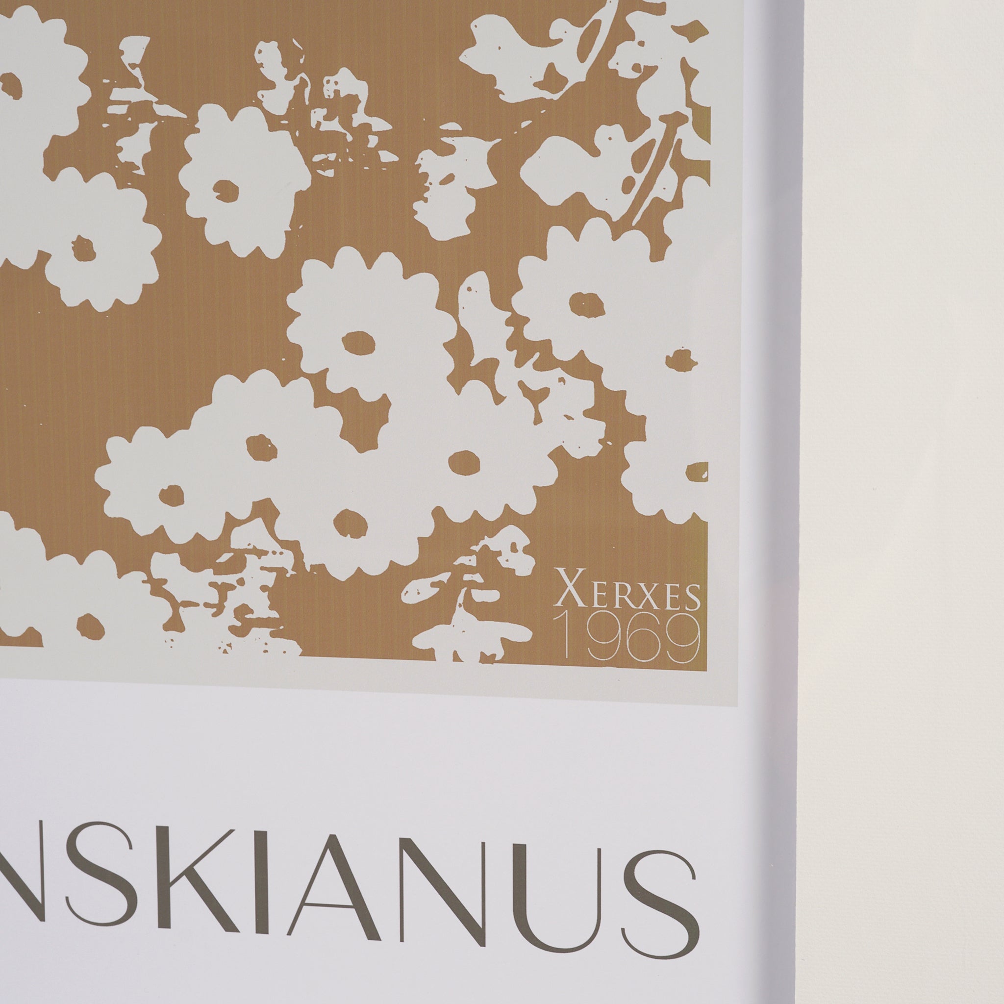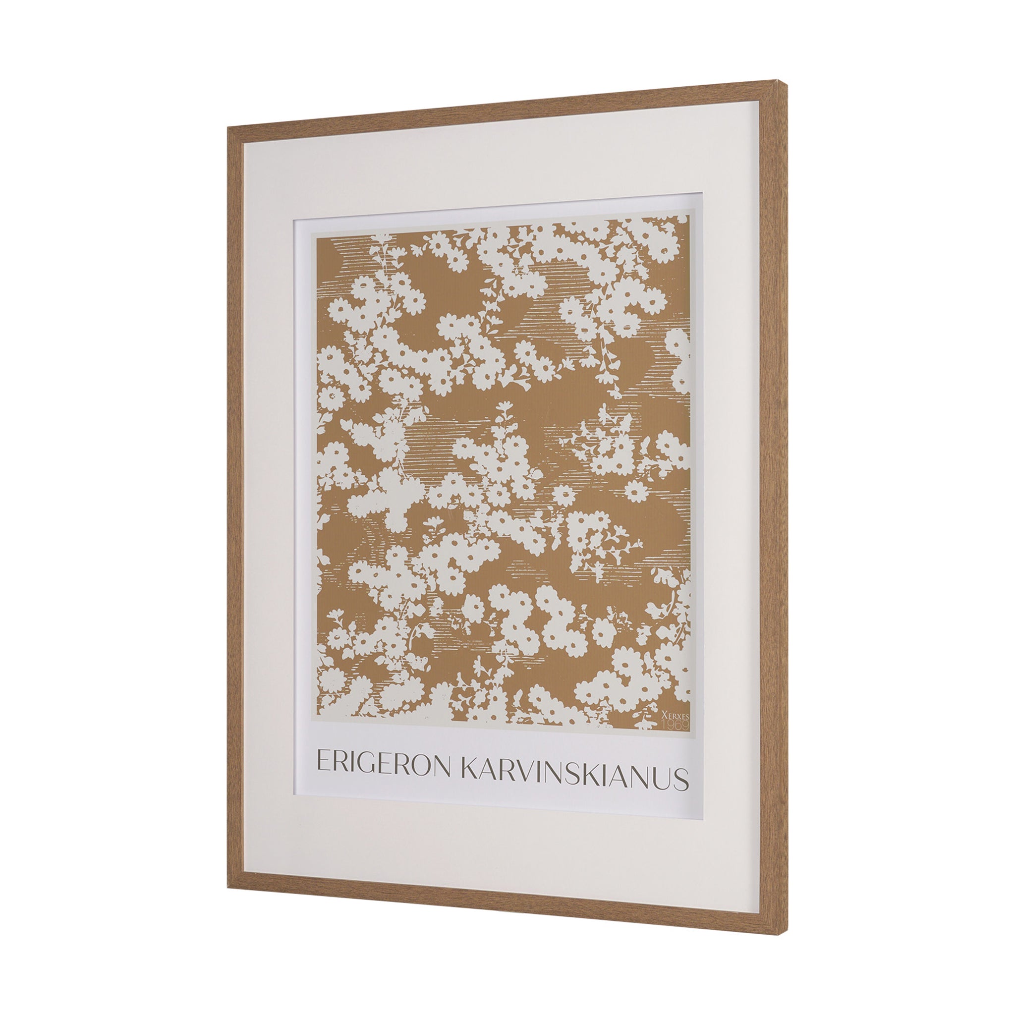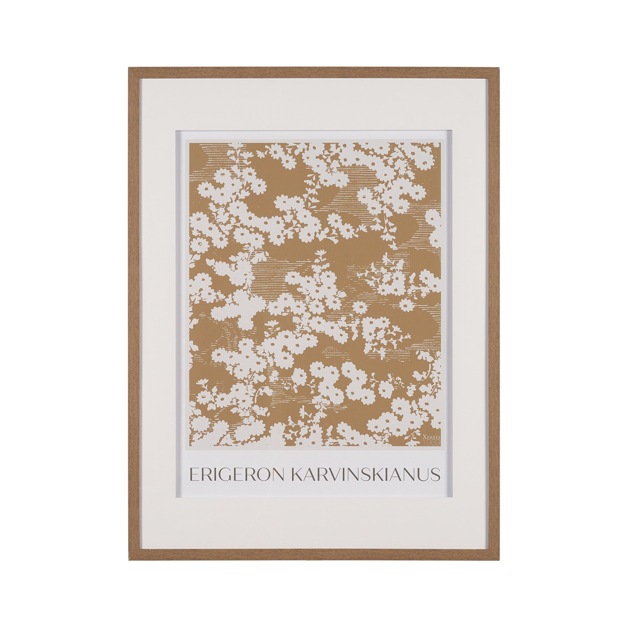 Embrace the understated beauty of nature with this elegantly framed art print. Delicate white blossoms and foliage form a captivating repeating pattern against a warm, golden-brown background, beautifully detailed. This chic, graphic piece offers a sophisticated blend of scientific precision and modern design, bringing a serene and stylish botanical accent to any wall.