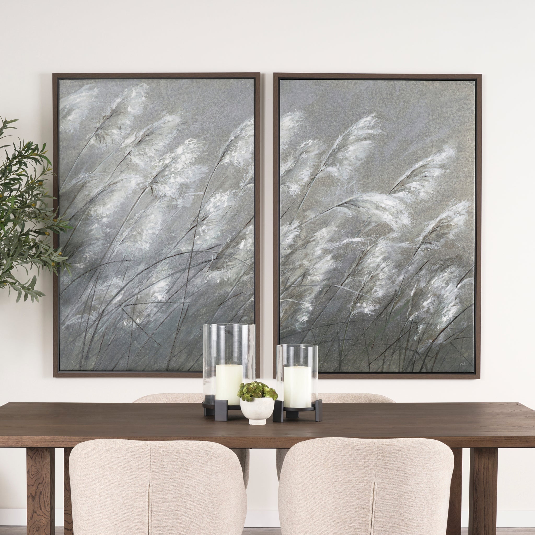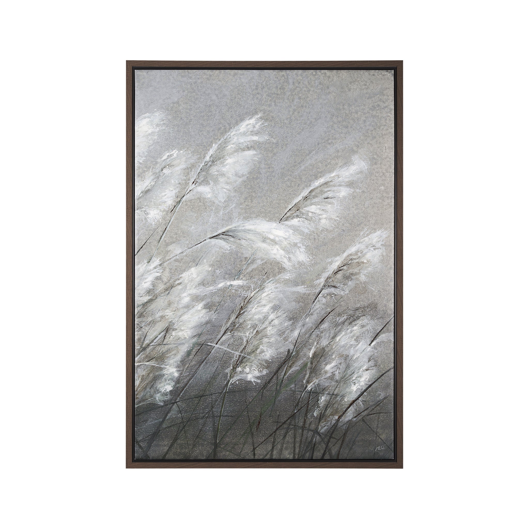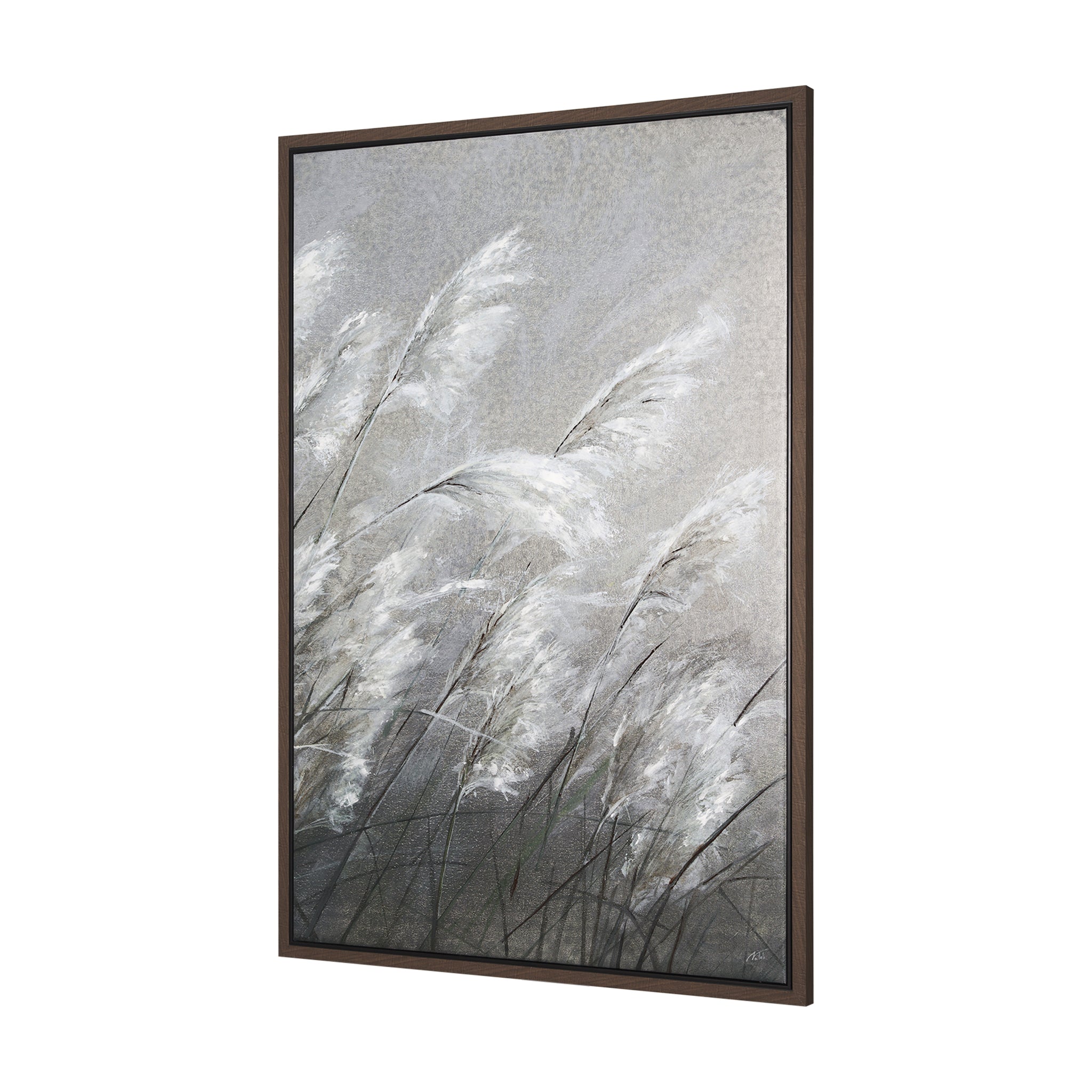 Capture the serene beauty of nature's gentle sway with this striking framed art. Depicting tall, feathery grasses dancing in the breeze, the piece utilizes a tranquil palette of greys and whites to create a textured and dynamic visual. Its subtle elegance makes it a captivating focal point, bringing a sense of calm and natural movement to any contemporary or coastal-inspired space.