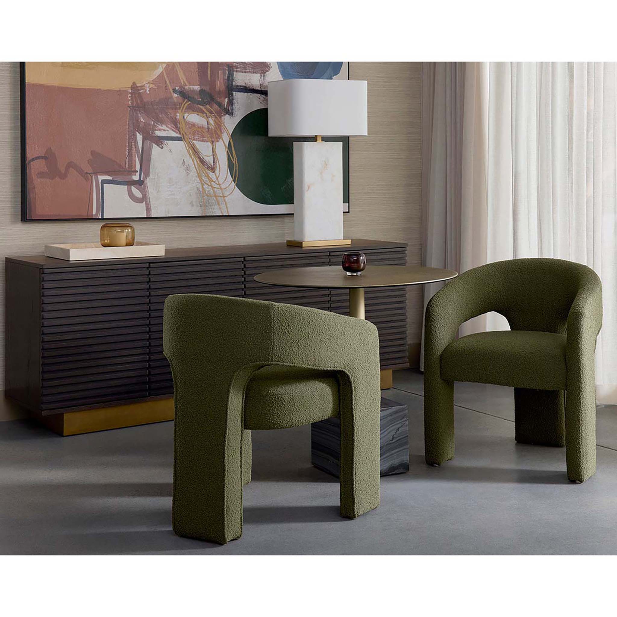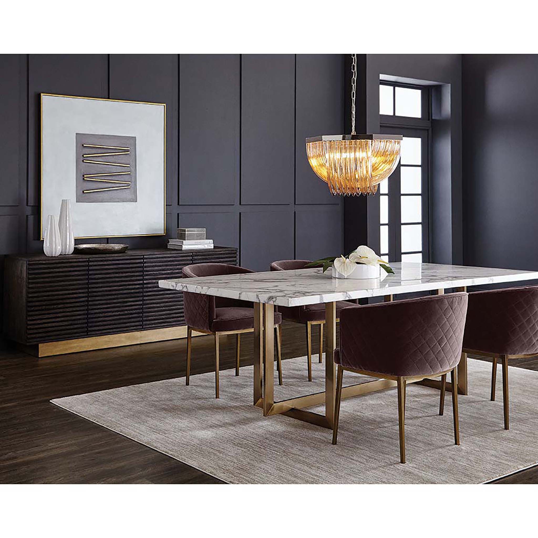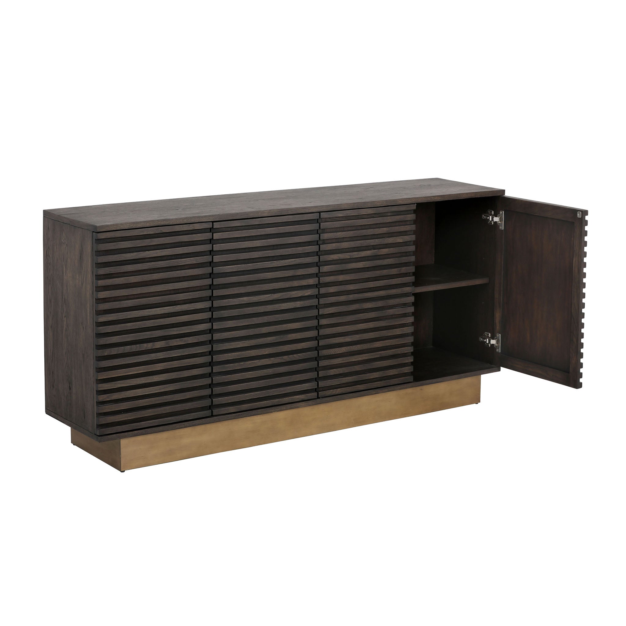 This beautifully crafted sideboard will add allure to any dining space. Designed with four large paneled cabinet doors and shelving for ample storage. An antique brass steel base completes the look. Distressed finish will have visible cracks and dents are part of the finish.