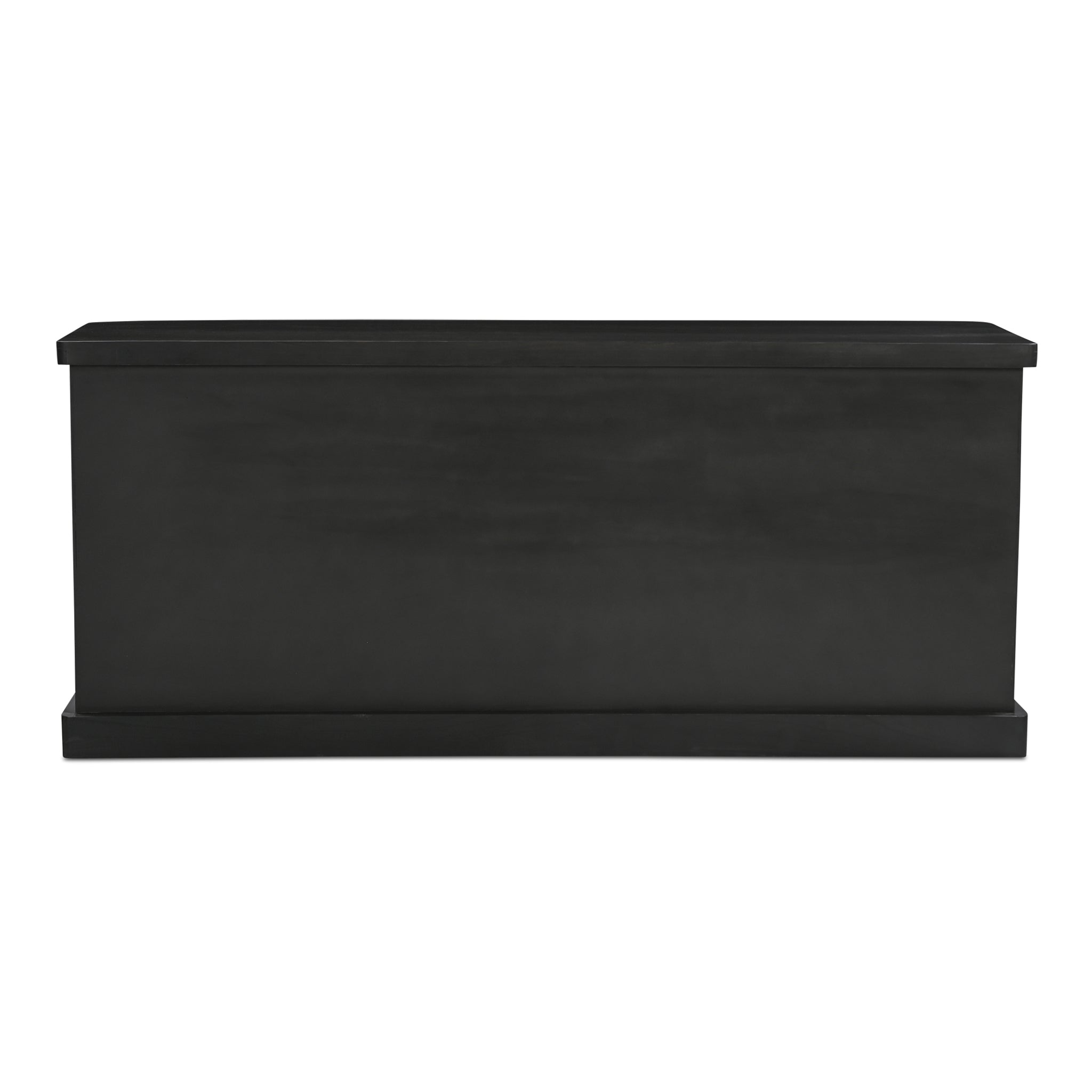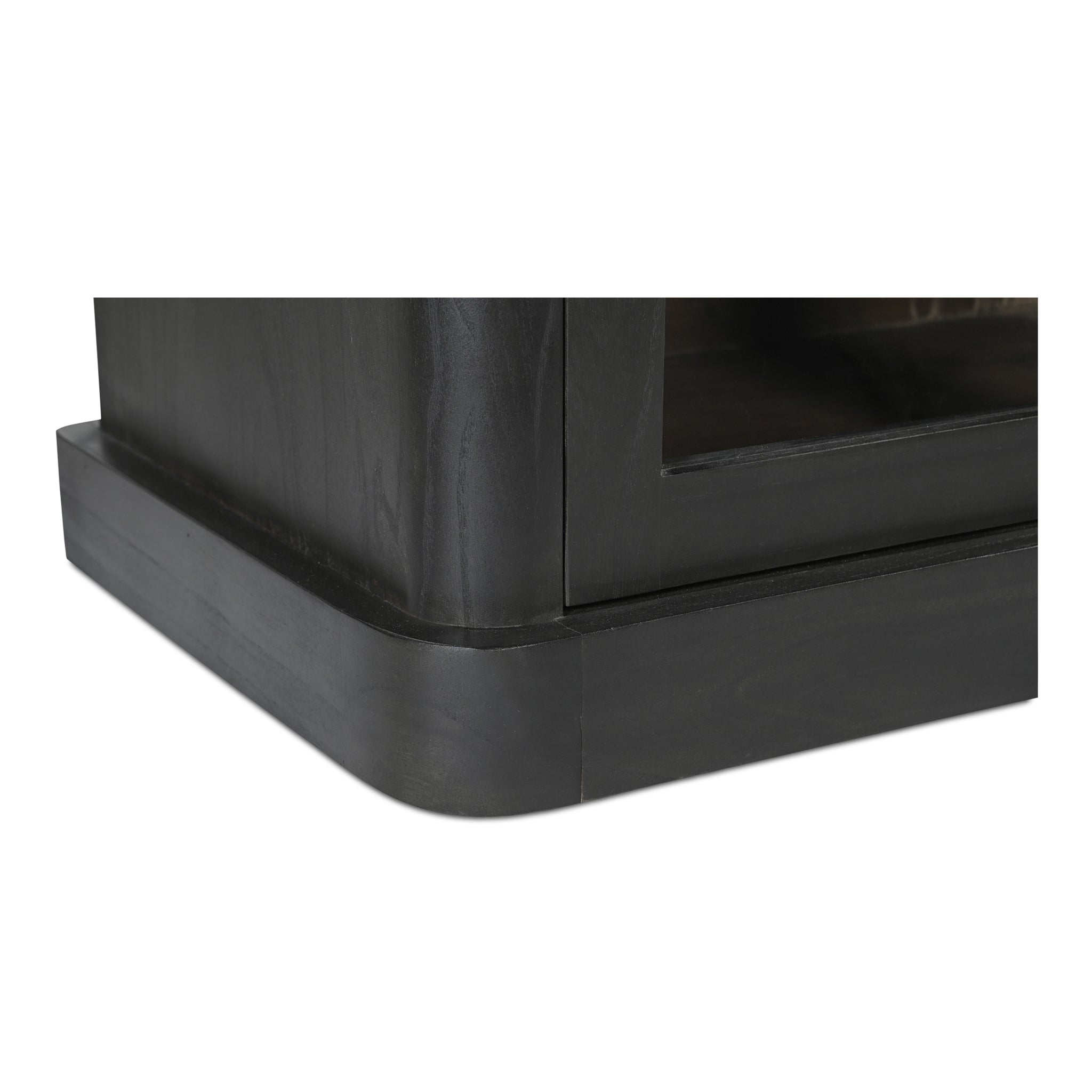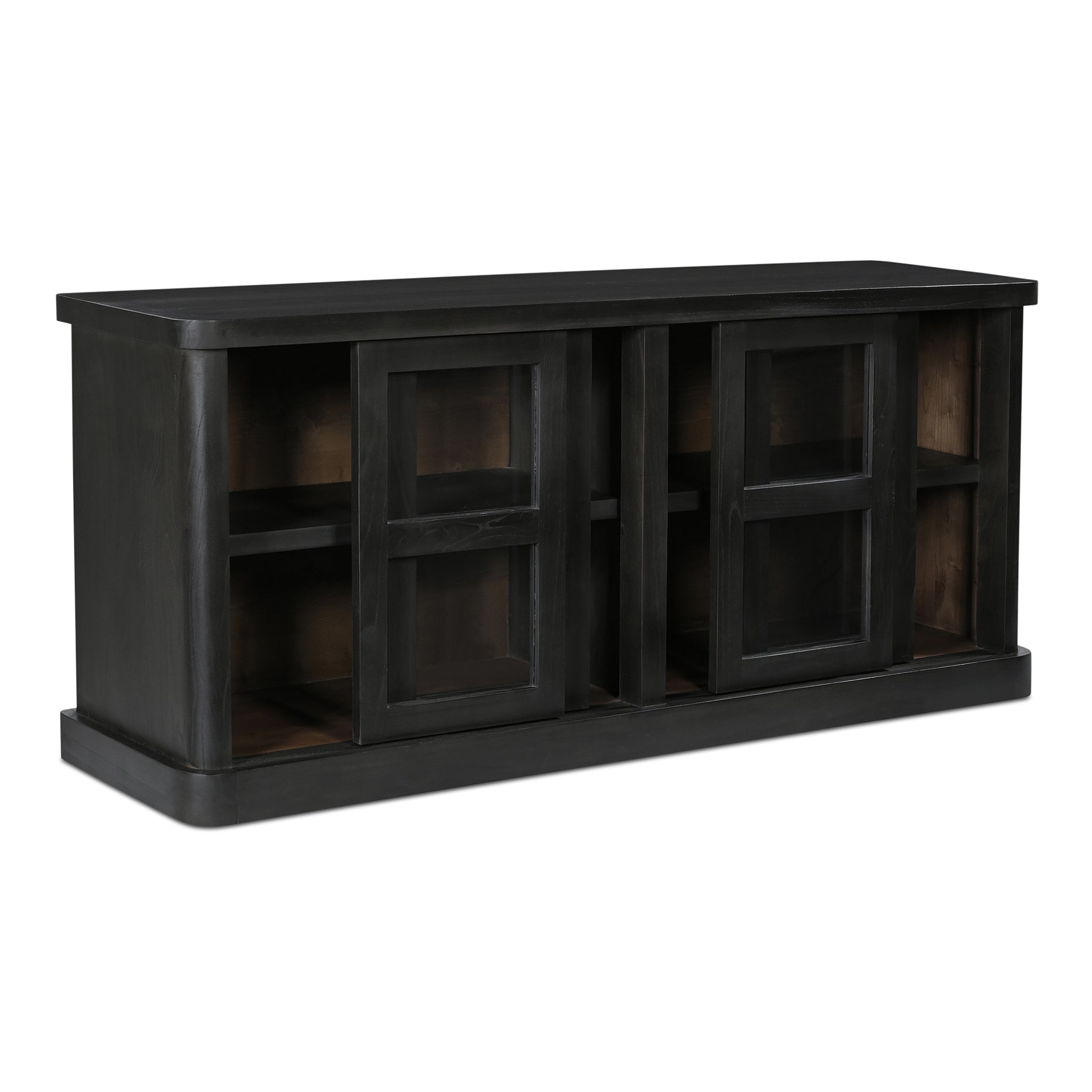 The Mary sideboard elegantly merges rustic charm with modern design, adding a contemporary touch. Its sleek black frame, rounded corners, and warm brown interior deliver a sophisticated contrast suitable for traditional and transitional settings. With four sliding glass front doors, it optimizes space while elegantly displaying and protecting items inside.