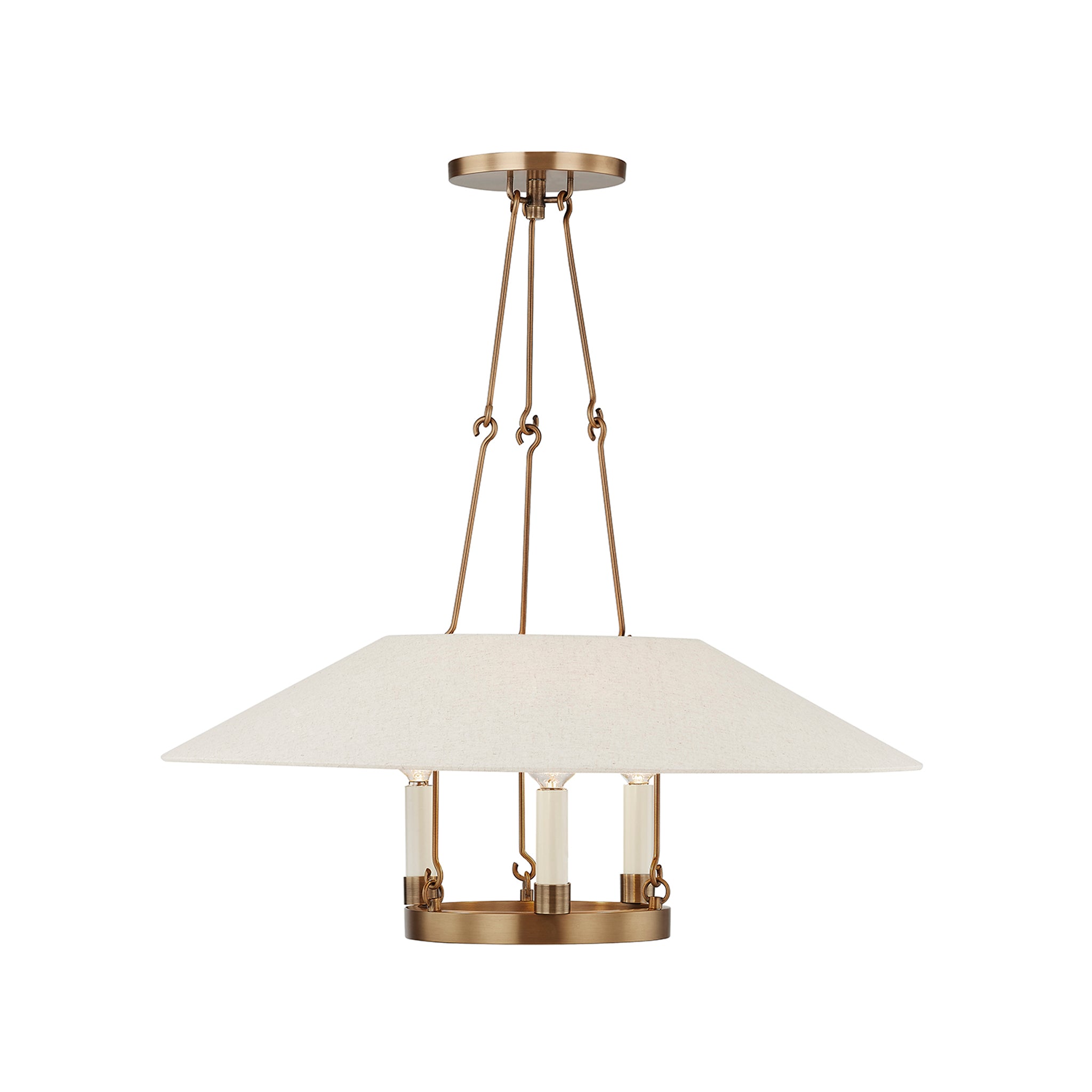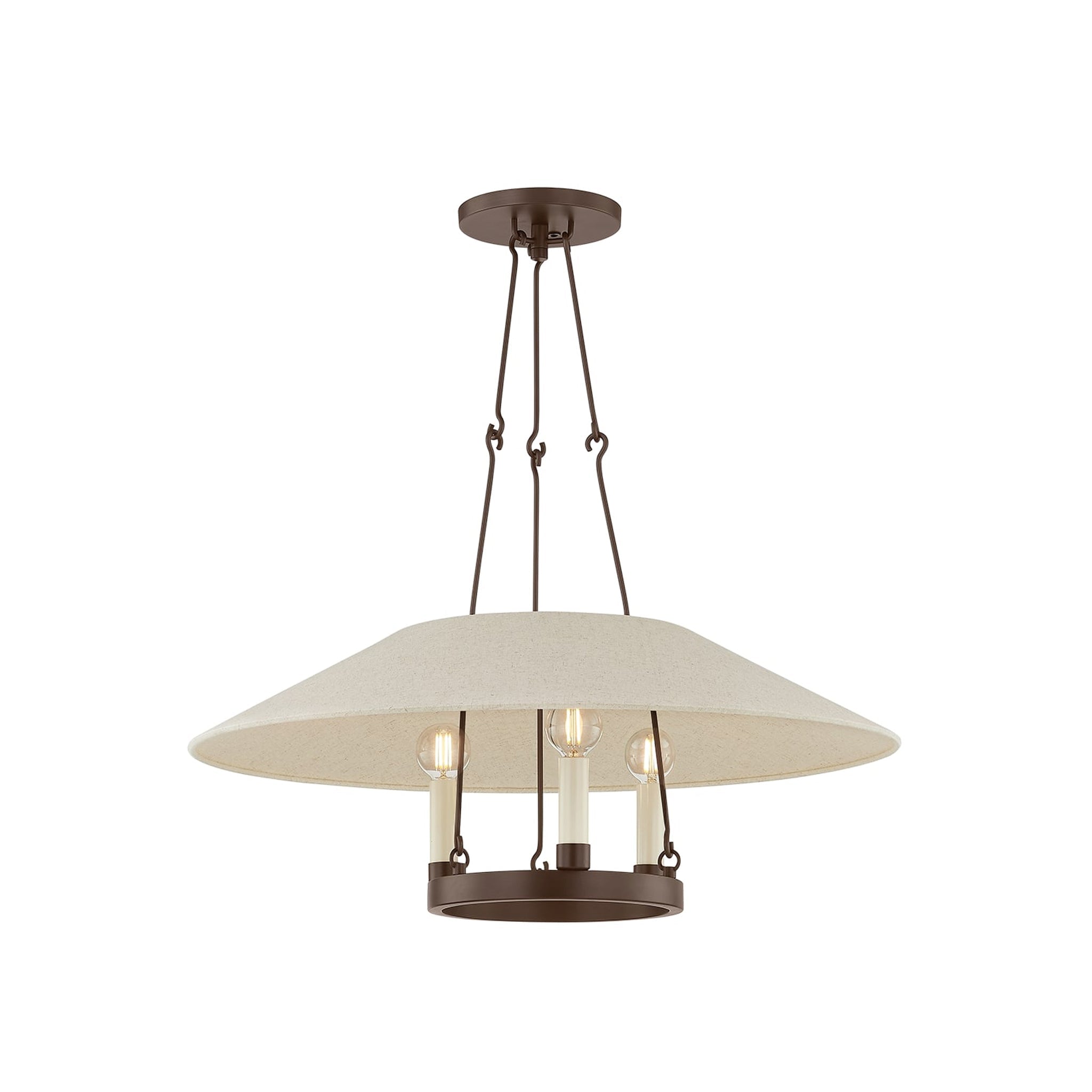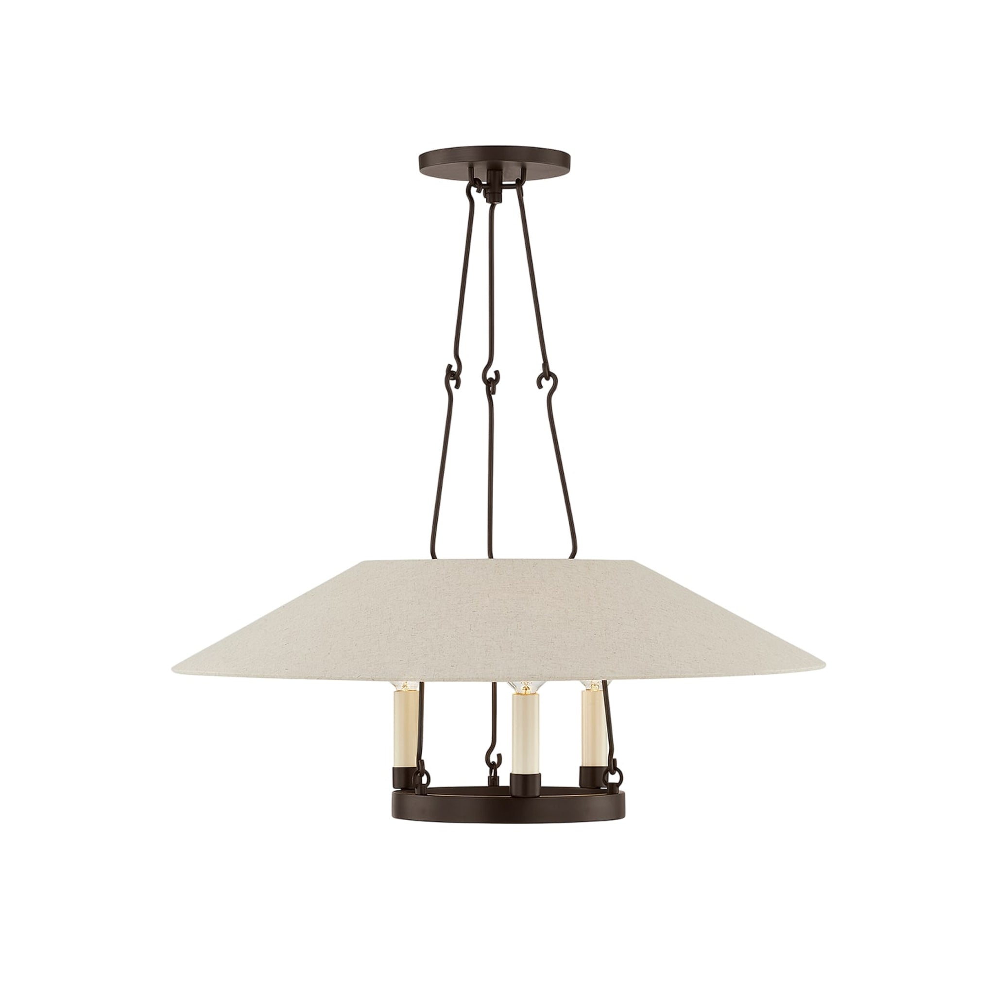 A cross between a ring chandelier and an airy lantern, Archive blends familiar forms into something distinctly fresh. Candle-style lights are arranged within a metal frame, finished in Patina Brass or Bronze, and paired with cream candle sleeves that echo the soft, natural linen shade above. Available in two sizes, Archive makes an elegant statement above a dining table or gathering space. Lauren Liess for Troy Lighting.