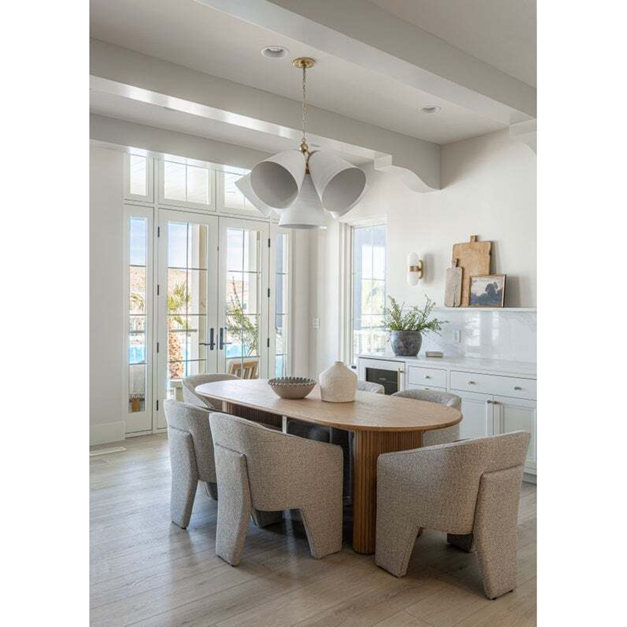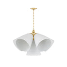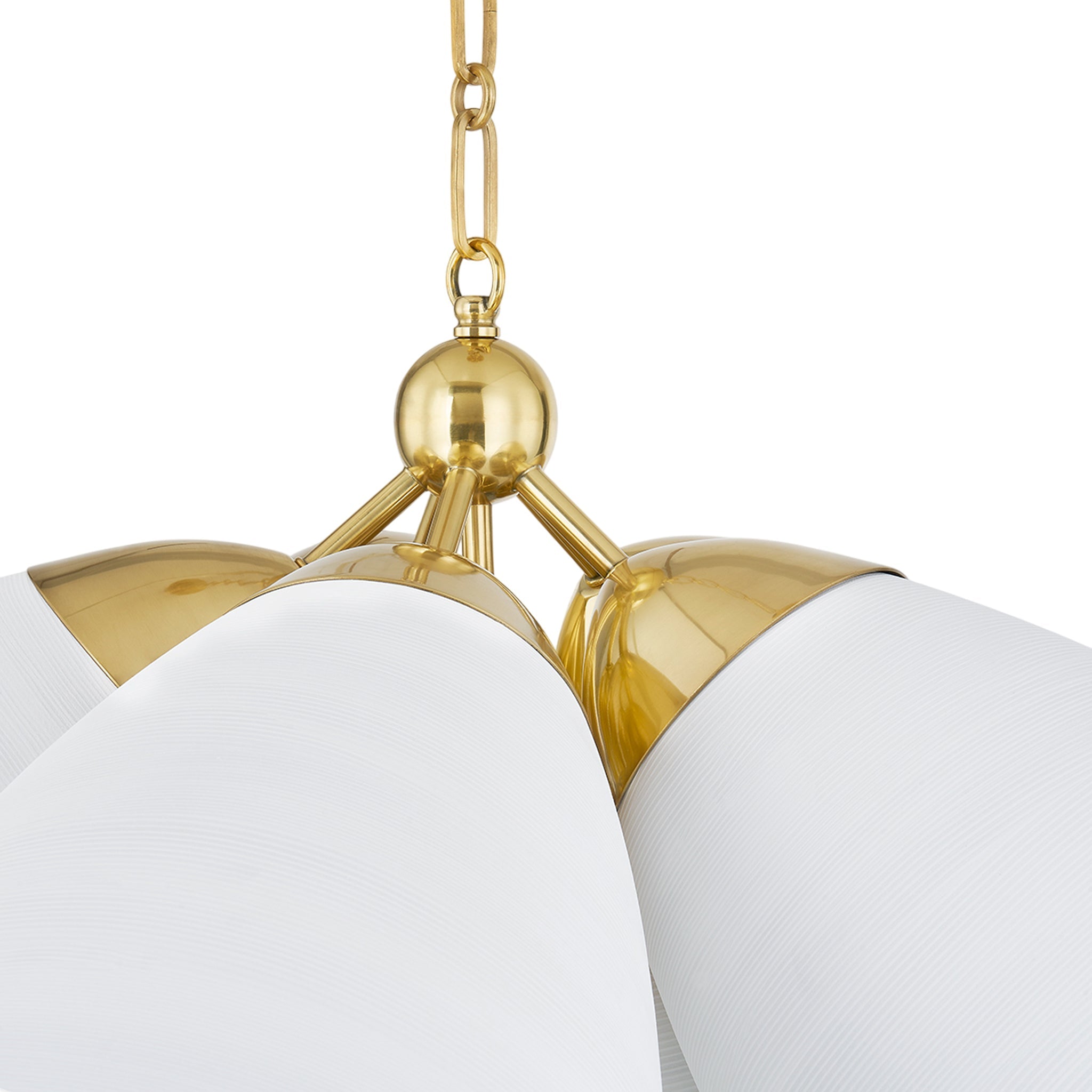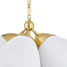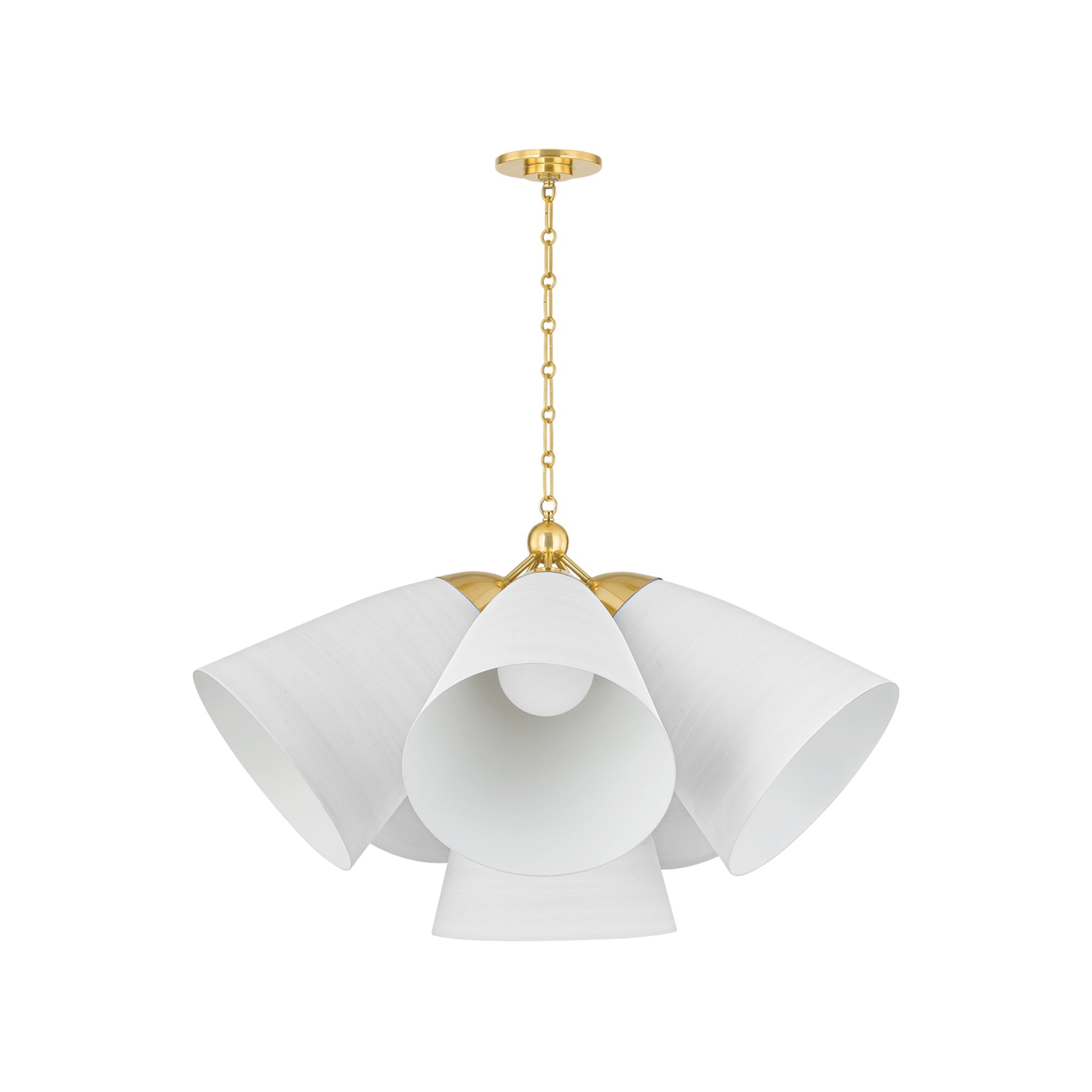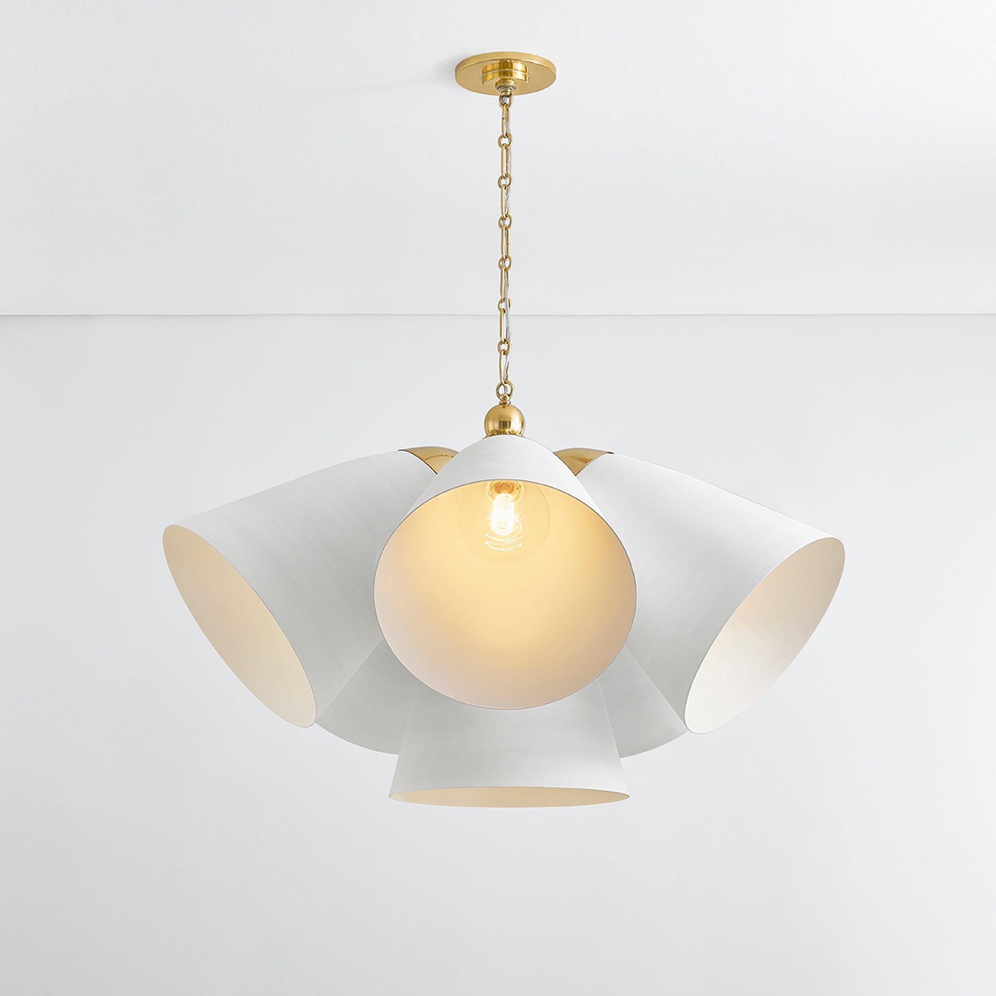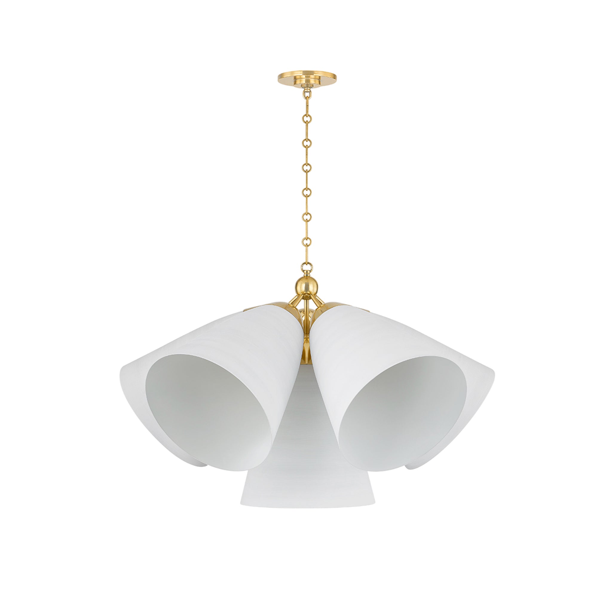 A refined bell-shaped fixture with a modern edge, Bronson features a sleek, tapered silhouette crafted from clean White Plaster. The opaque materiality and funnel shape creates a powerful downlight to fill a large area. Accented by the inviting warmth and reflective nature of Aged Brass, including a large cap and finial, it evokes an organic feel. Available as a chandelier or pendant in two sizes. Becki Owens for Hudson Valley Lighting.