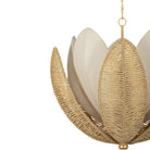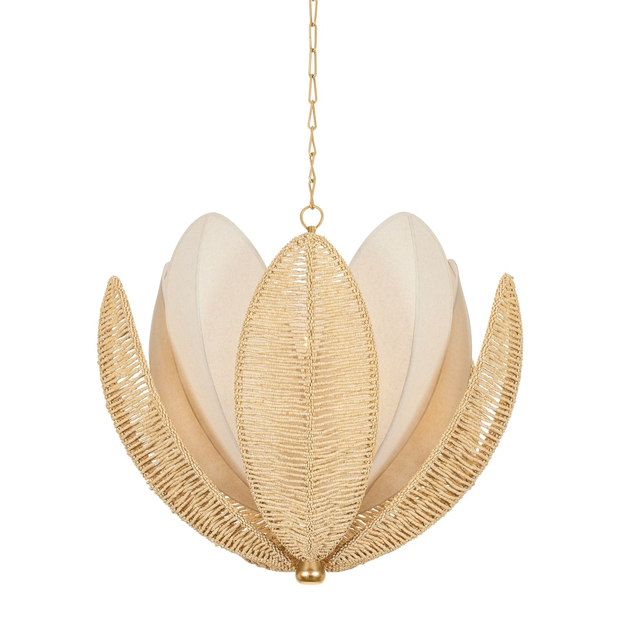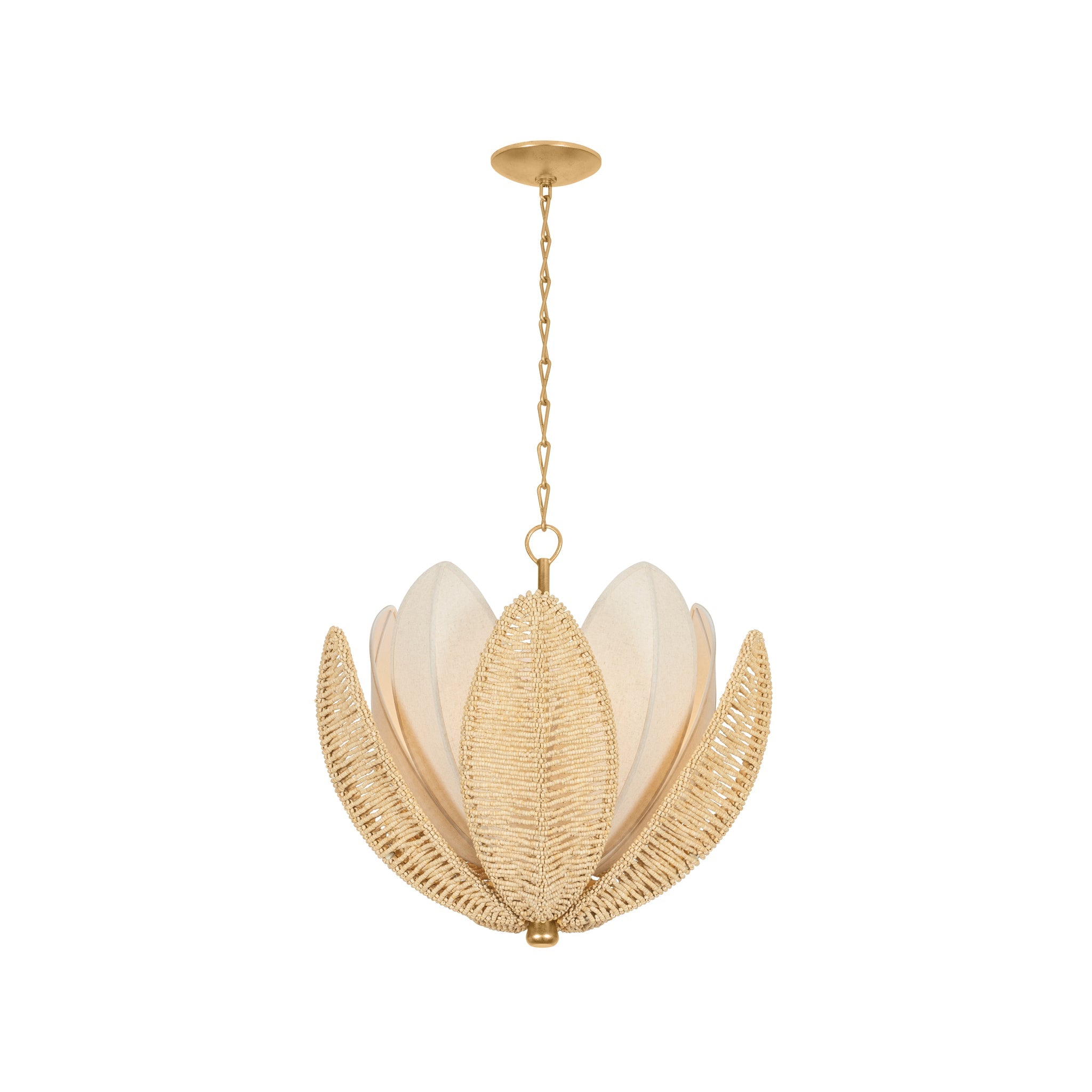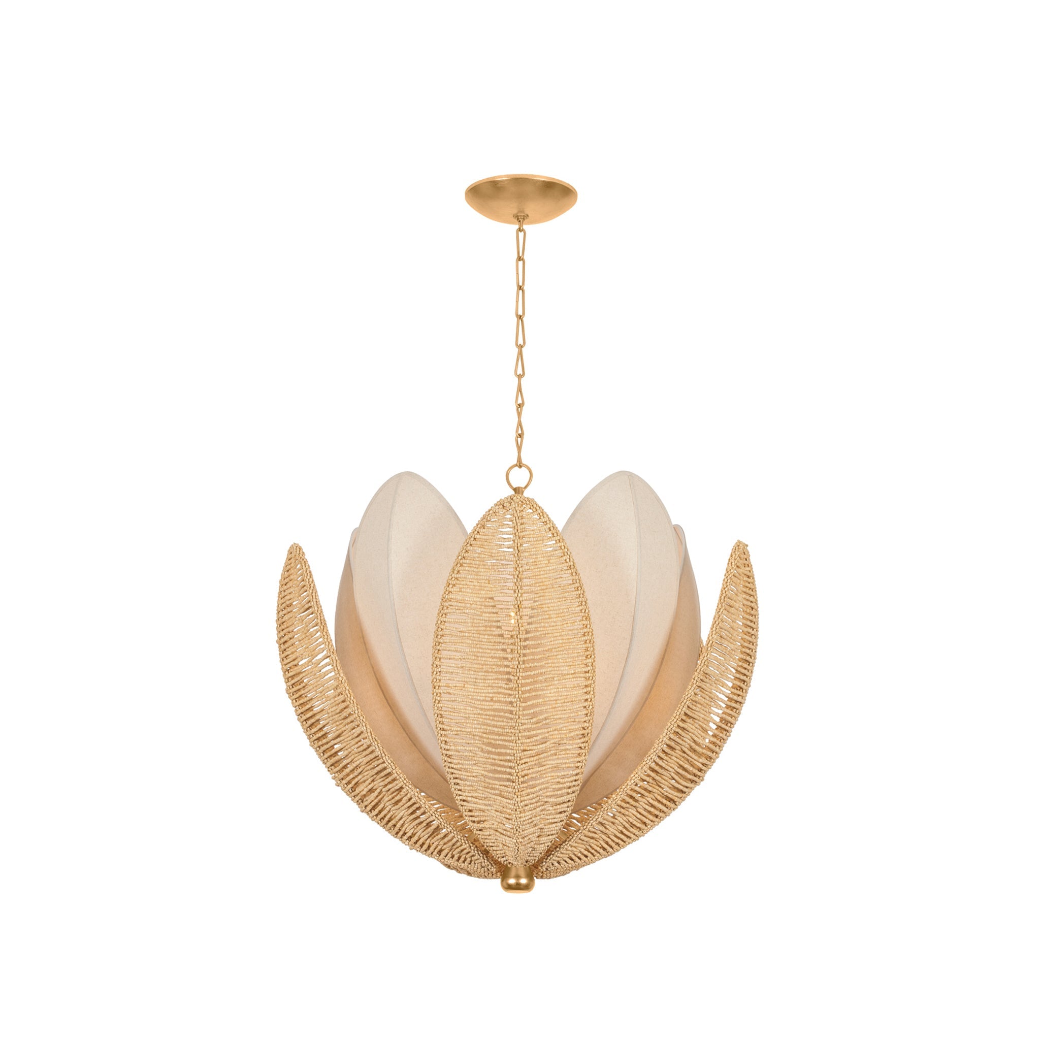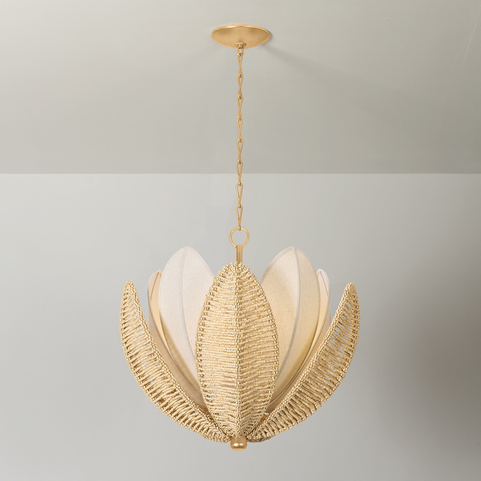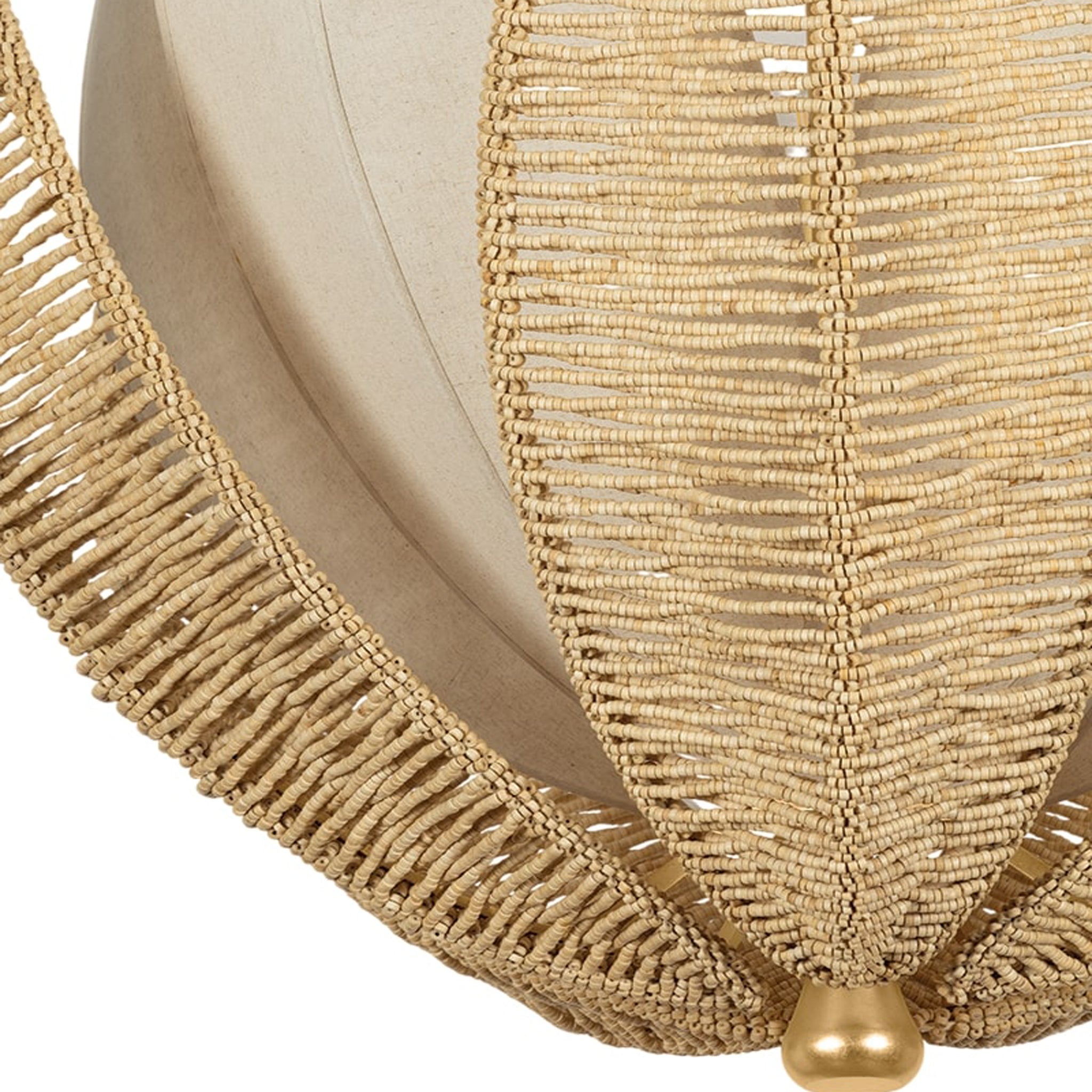 A celebration of nature, Costa Brava is the perfect blend of tropical texture and tonality. The outer shade of ‘petals' is strung with coco shell beads, while the inner layer is woven from grained natural linen. Each petal features a center rib, creating a graceful curve to the shade. The Vintage Gold Leaf finial and canopy add a luxurious note. Available in two sizes, Costa Brava is an organic delight for any space.