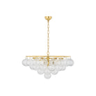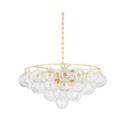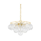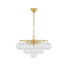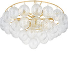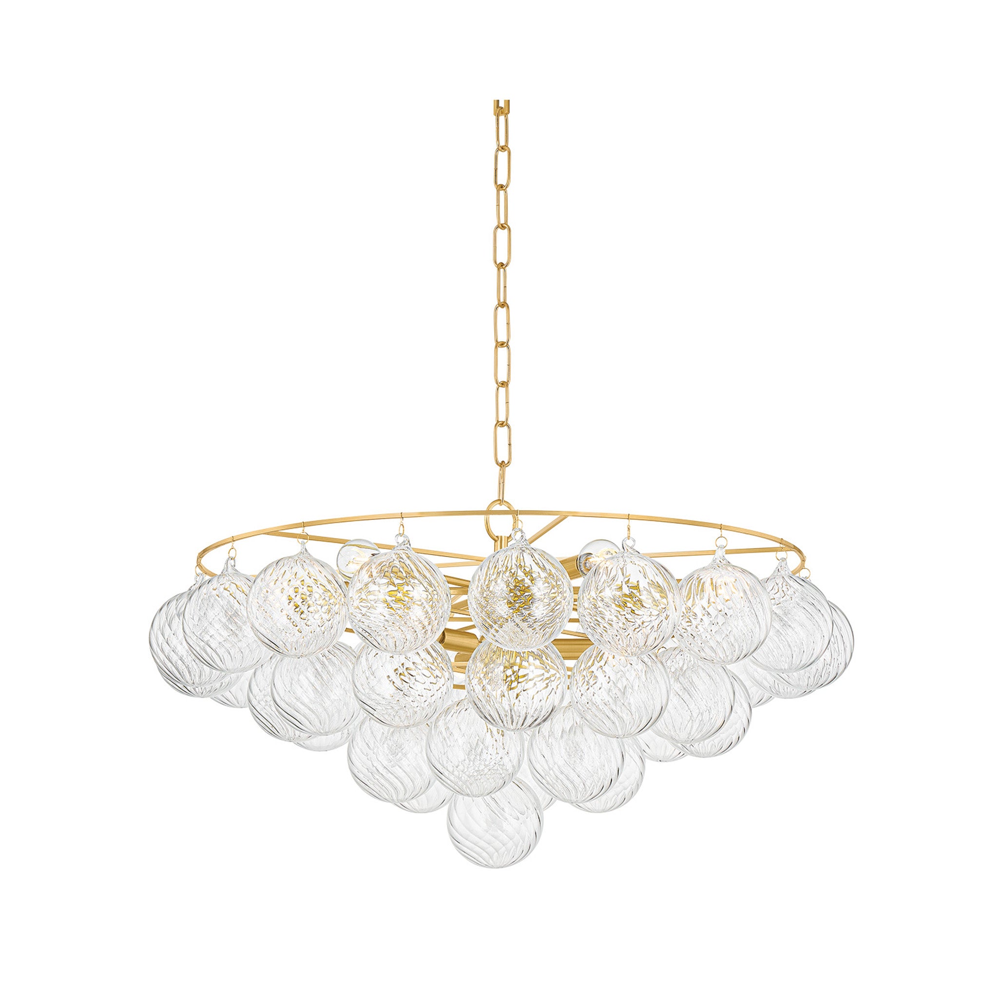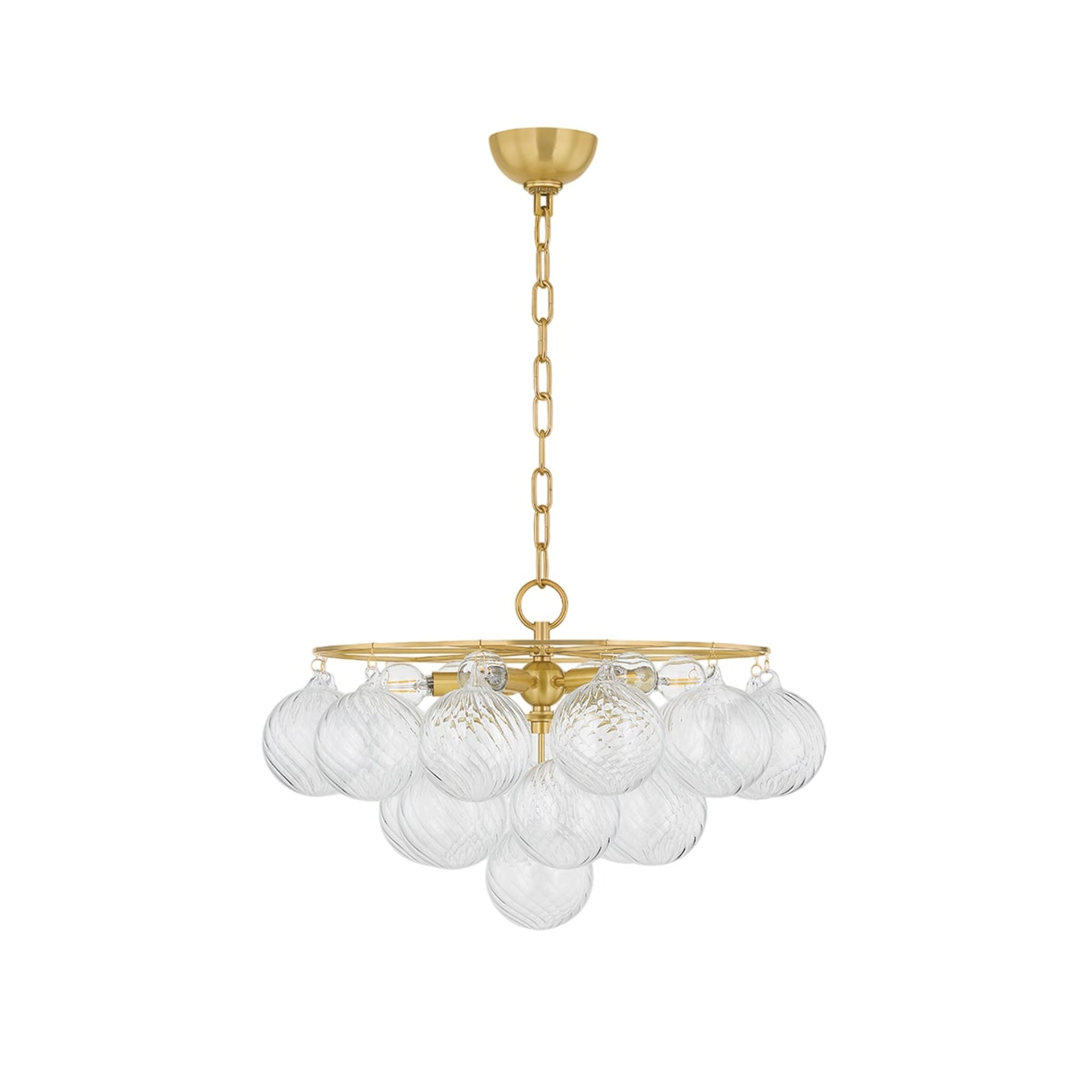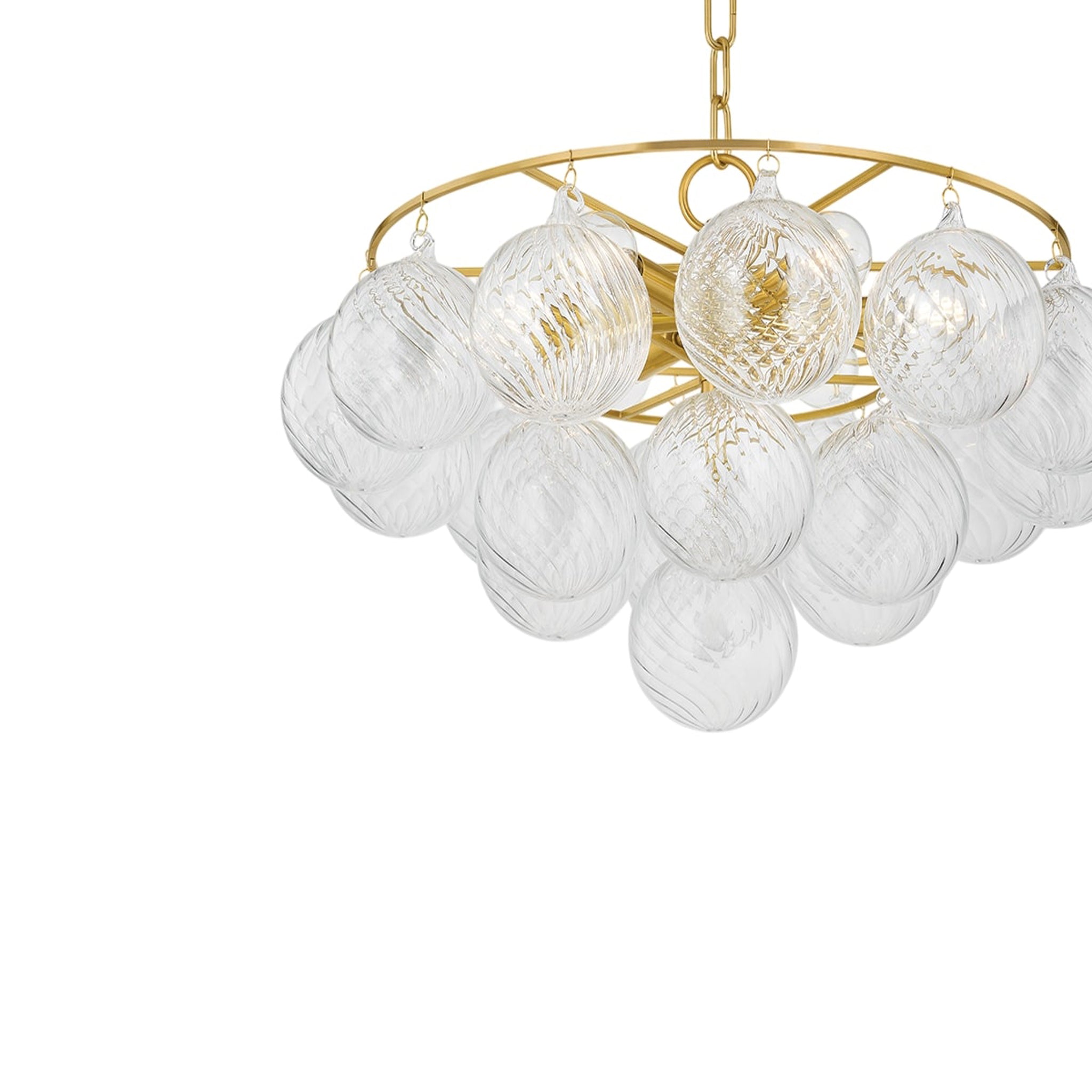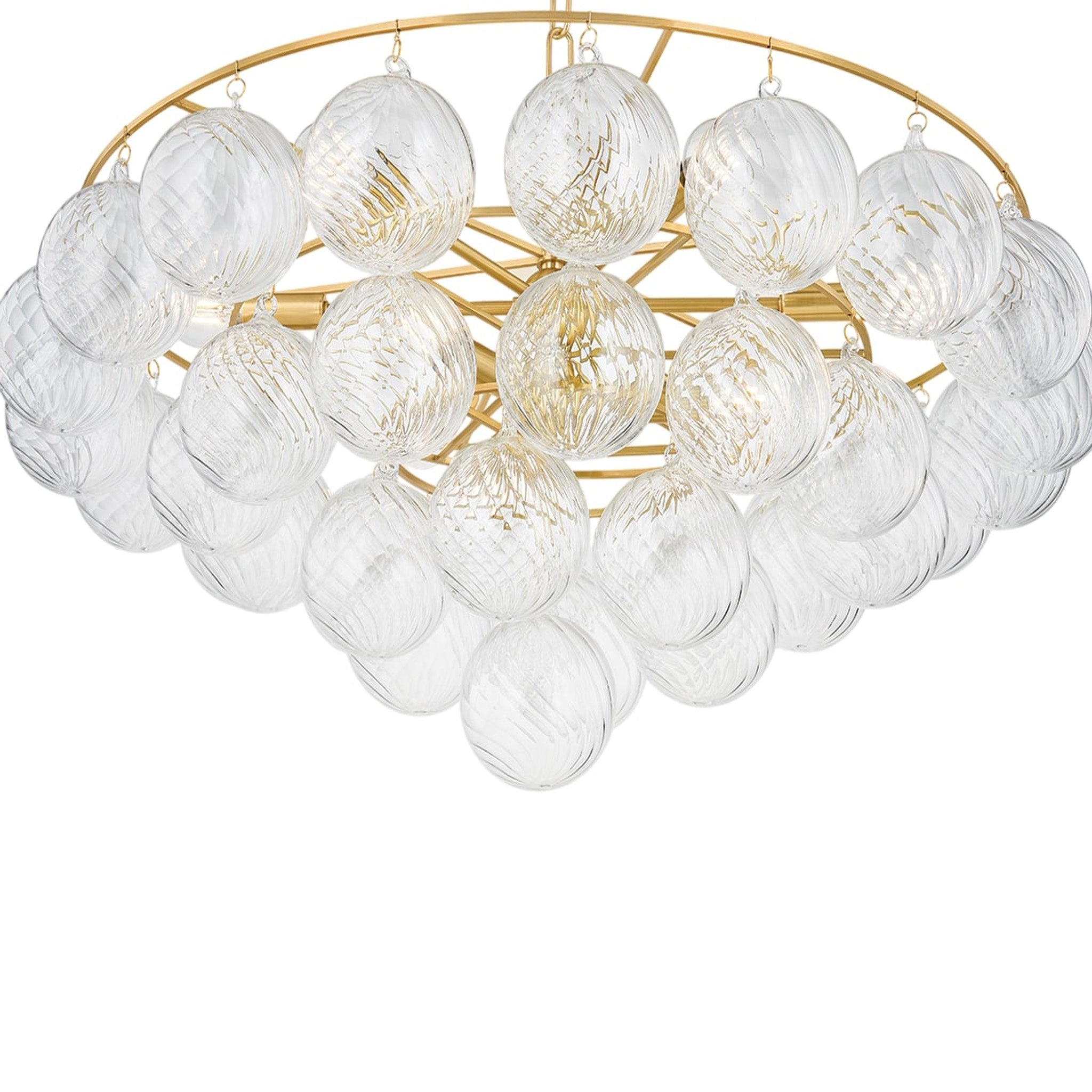 Swirl-ribbed or plated champagne glass globes dangle from an Aged Brass frame, creating this cloud-like showstopper. Whether you're dressing up a breakfast nook with the small chandelier, adding a soft glow to an entryway with the flush mount, or making a glam statement in your dining room with the large chandelier, the possibilities for Mimi are endless. Megan Molten for Mitzi Lighting.