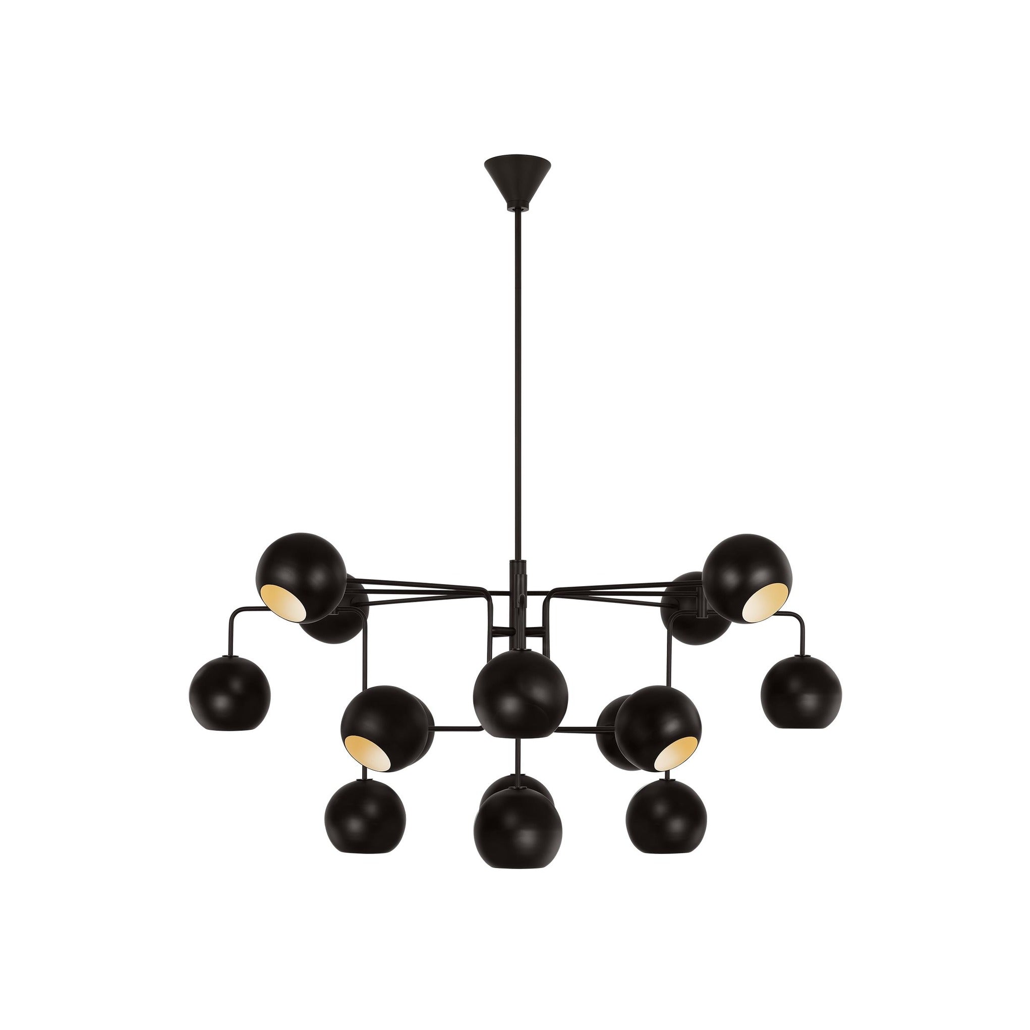 Chaumont casual 16-light indoor dimmable extra large chandelier in aged iron finish with aged iron steel shades. Multi-directional shades suggesting movement, with inspiration ranging from the mobiles of Calder to classic French mid-century forms