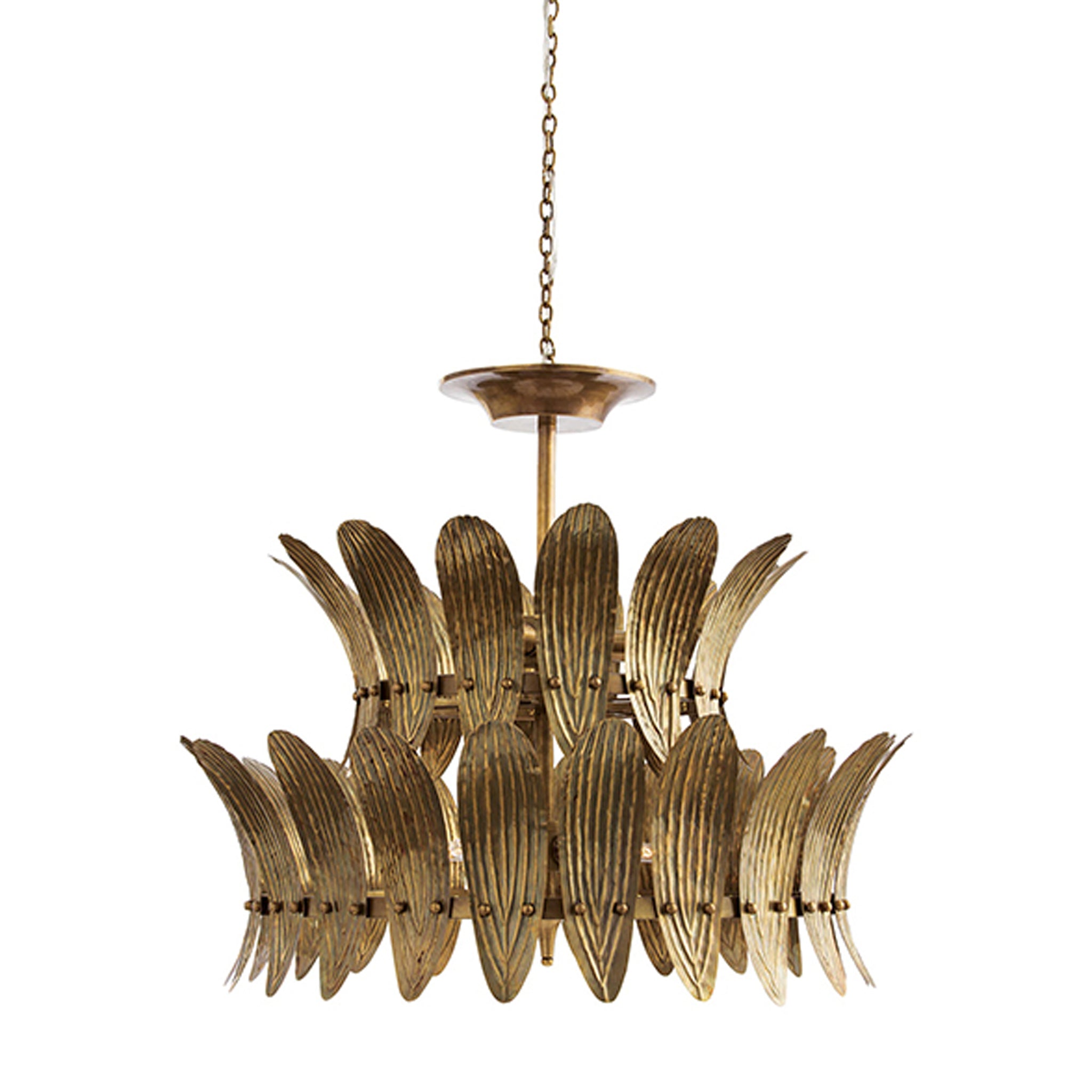 This eight-light chandelier features a stunning arrangement of gently-curved plates embossed with a leaf motif and finished in vintage brass. This gilded piece has a traditional and feminine feel that won't overpower a streamlined space. A frosted acrylic diffuser softens the light.