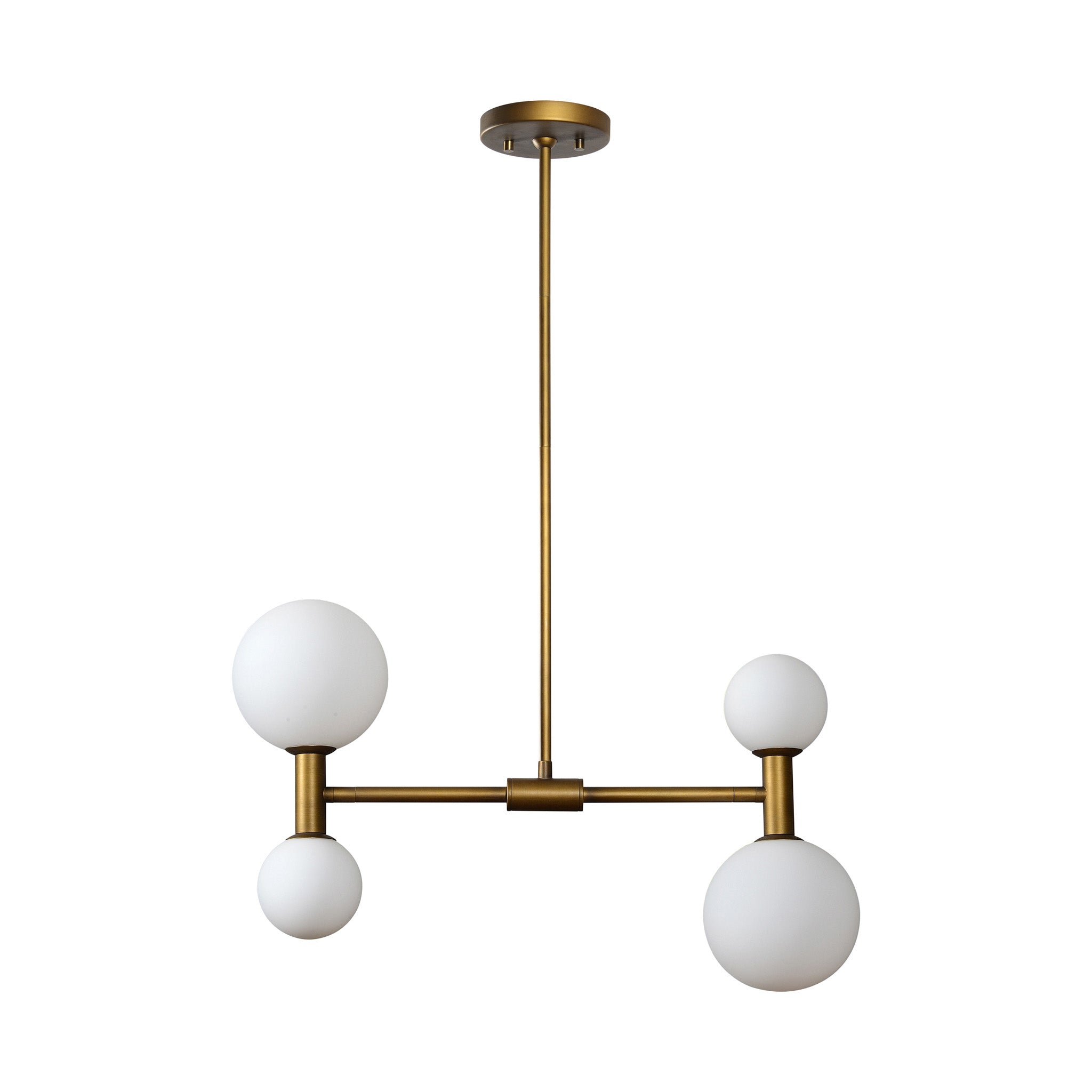 The Lambert Chandelier embodies a sleek retro design. Composed of iron with an antique brass finish, it exudes warmth. At 24 inches in width, its four bulbs allow it to cast light across an expansive space.