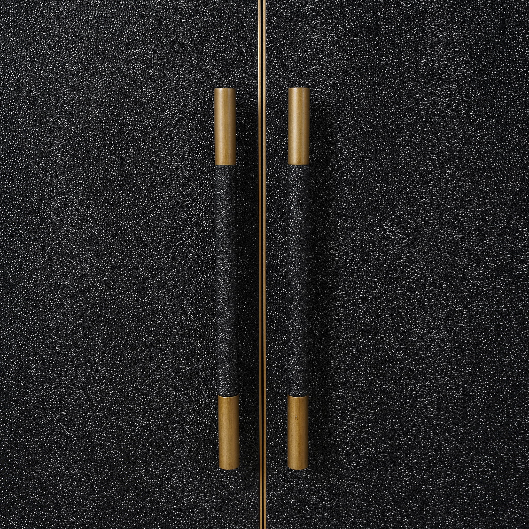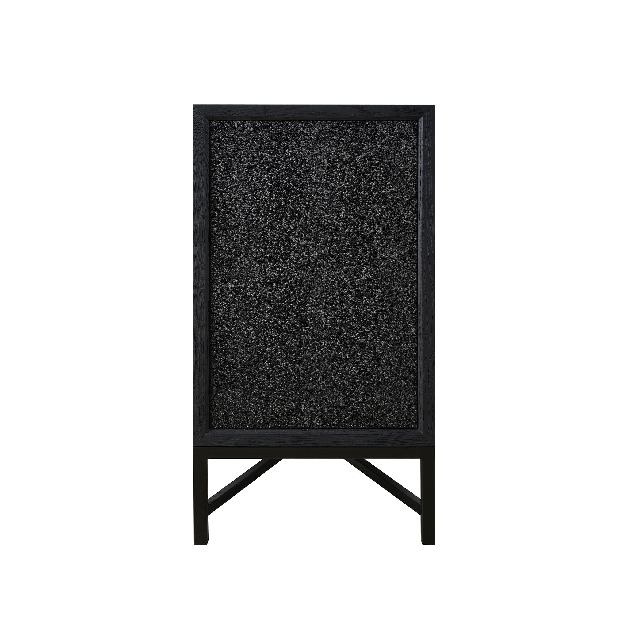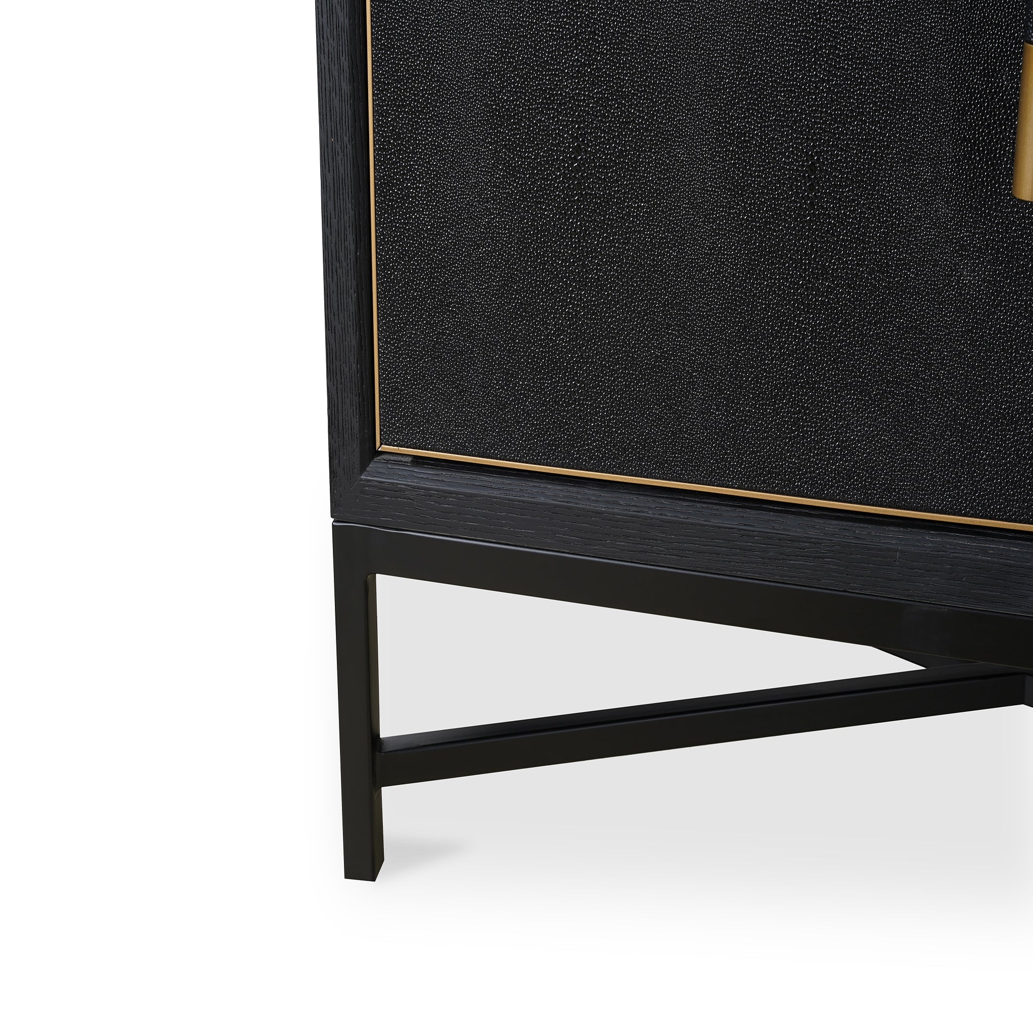 Material: Shagreen Patterned Polyurethane, Solid Black Oak Frame, Brass Legs, Plywood On Door,Side Panel,Top Panel Back Panel,Shelf