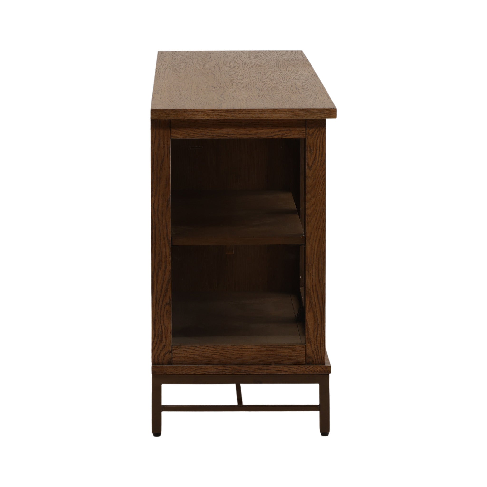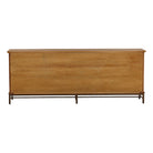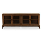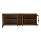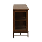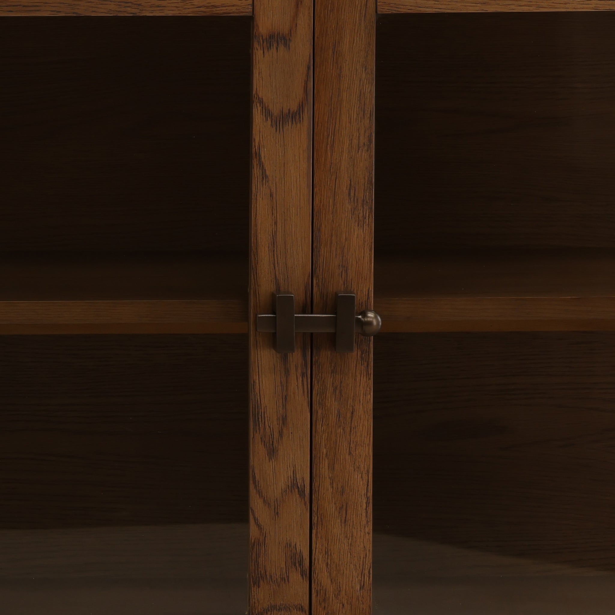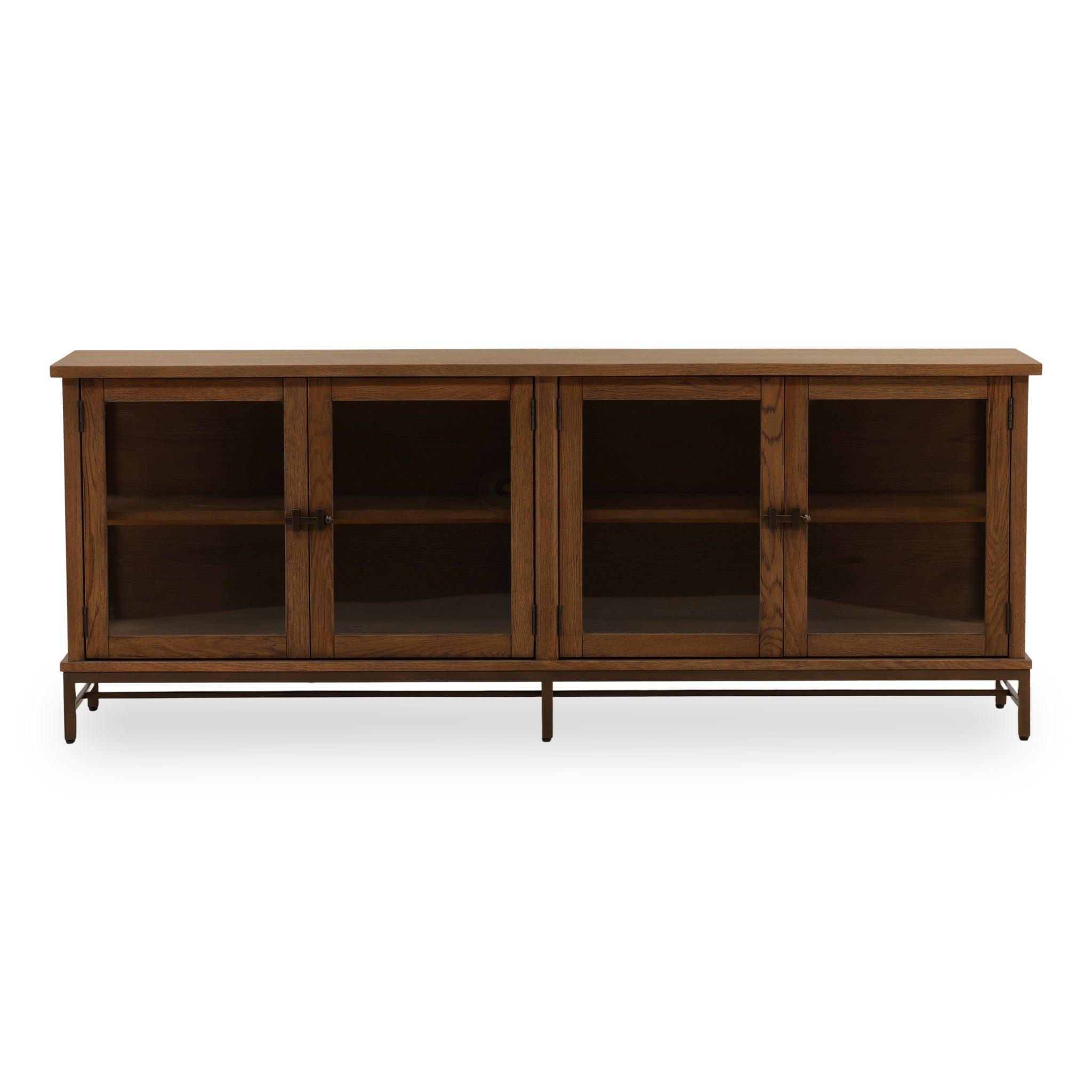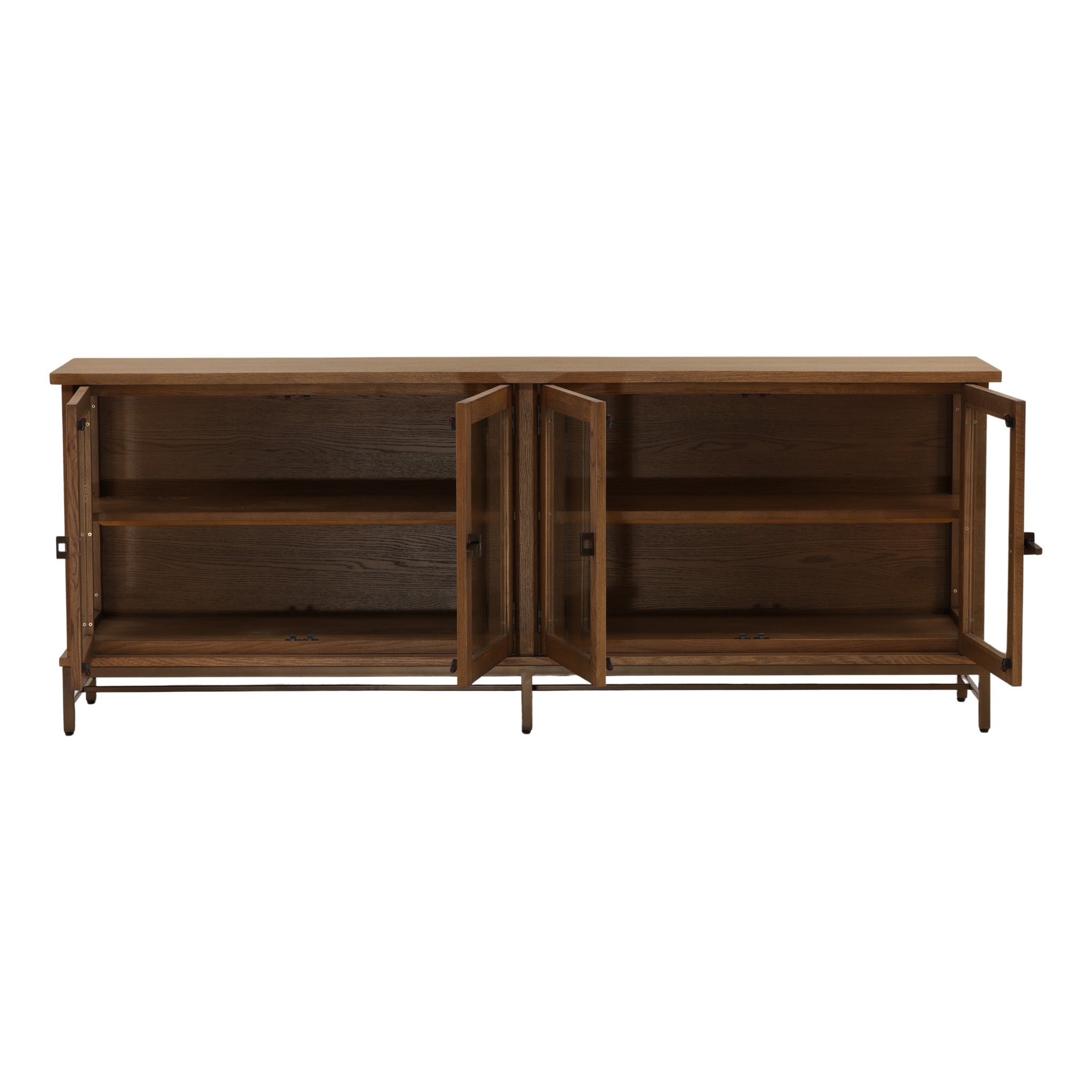 The Ronan Sideboard brings a strong and striking storage piece to living or dining spaces. It combines oak veneer, oak wood, and iron to create a sturdy structure designed for daily use. The dark brown and bronze finish gives the piece a bold appearance. This sideboard provides a broad top surface along with space to organise household items.