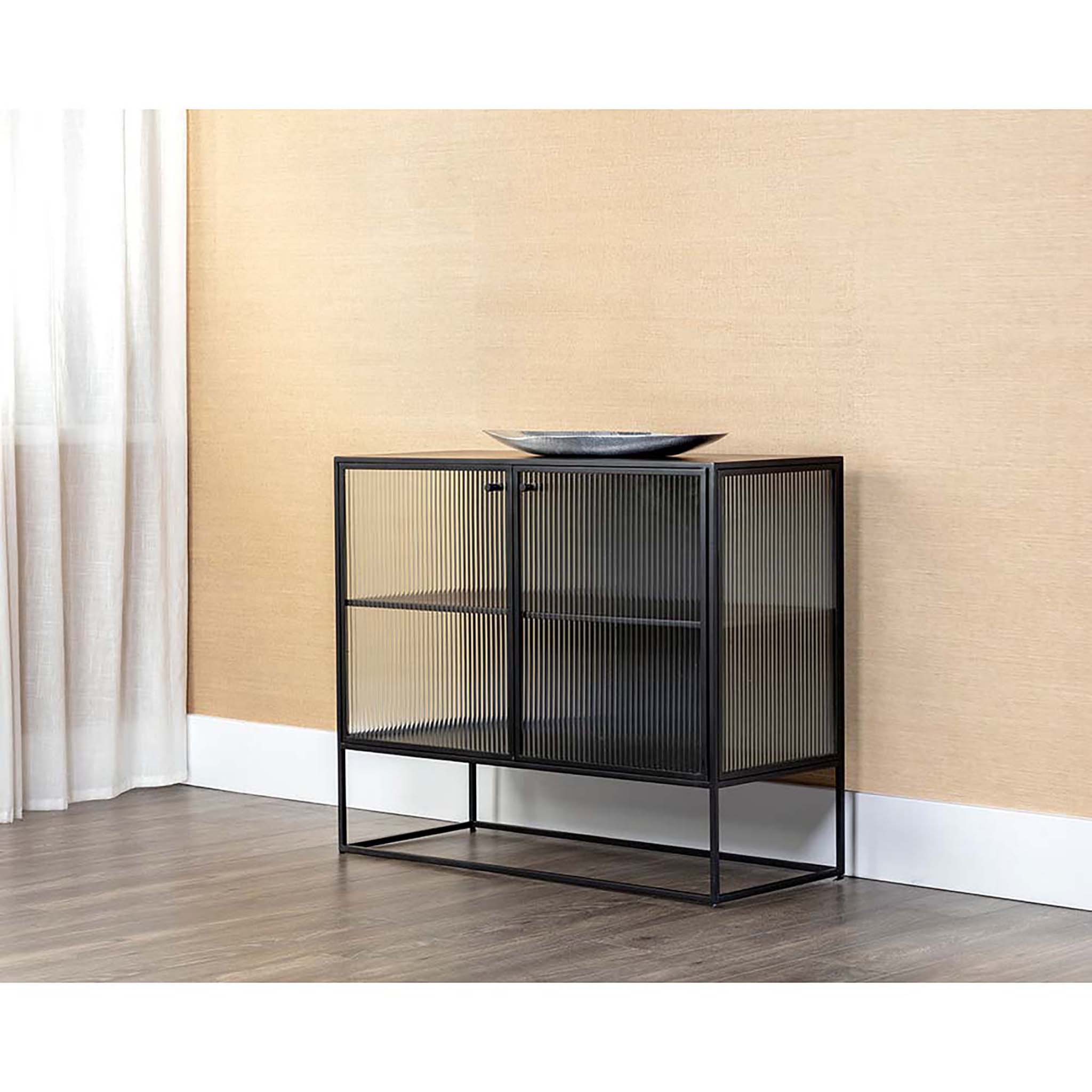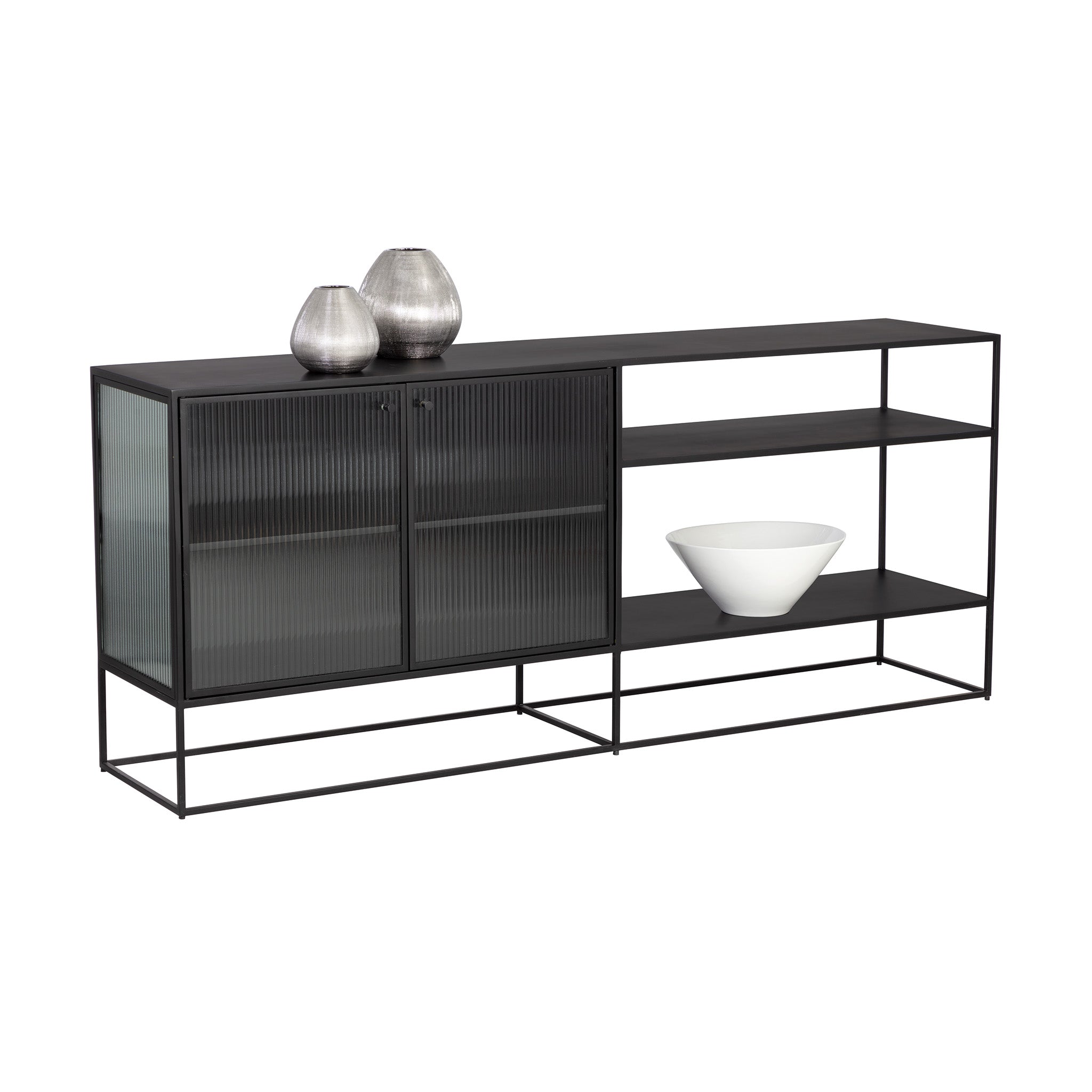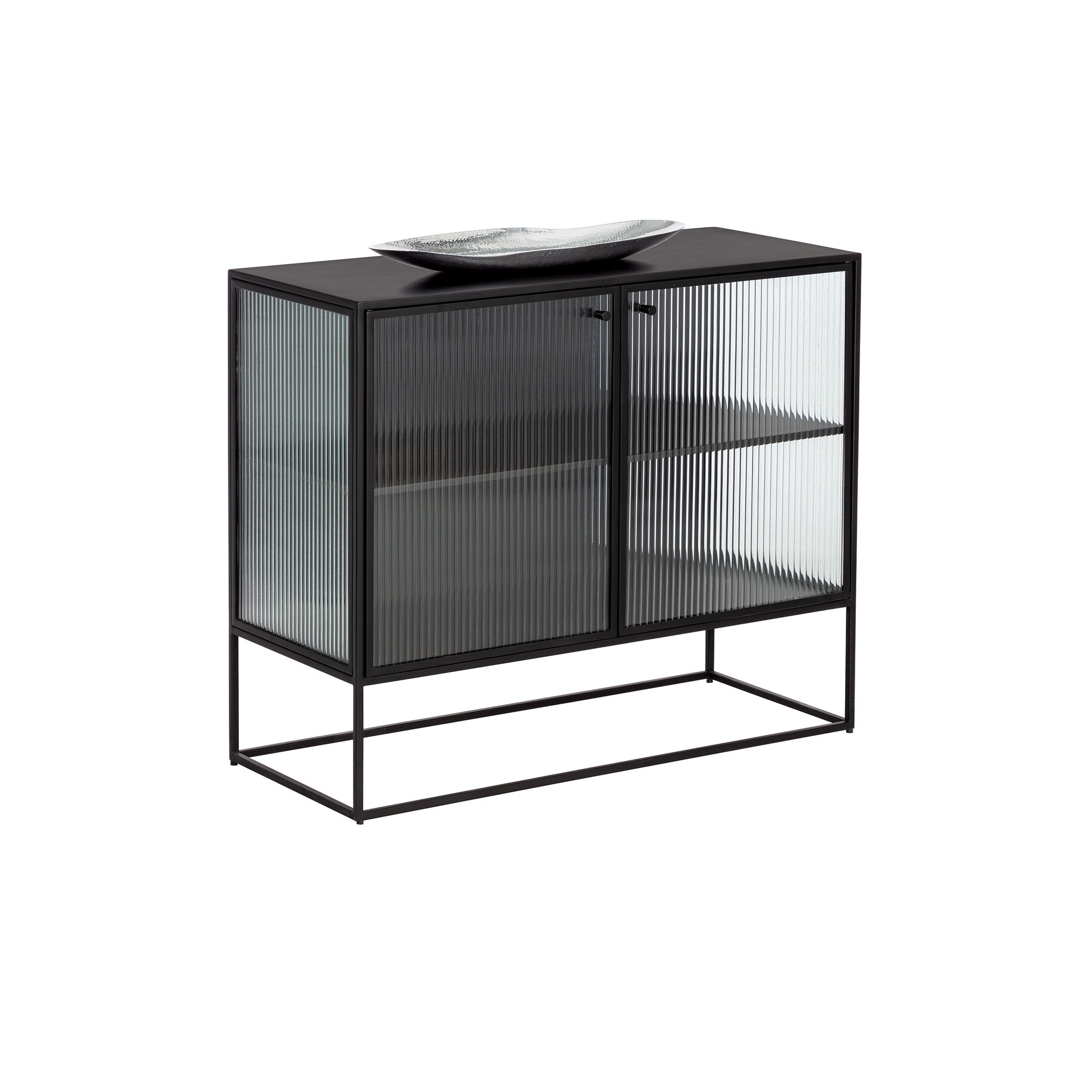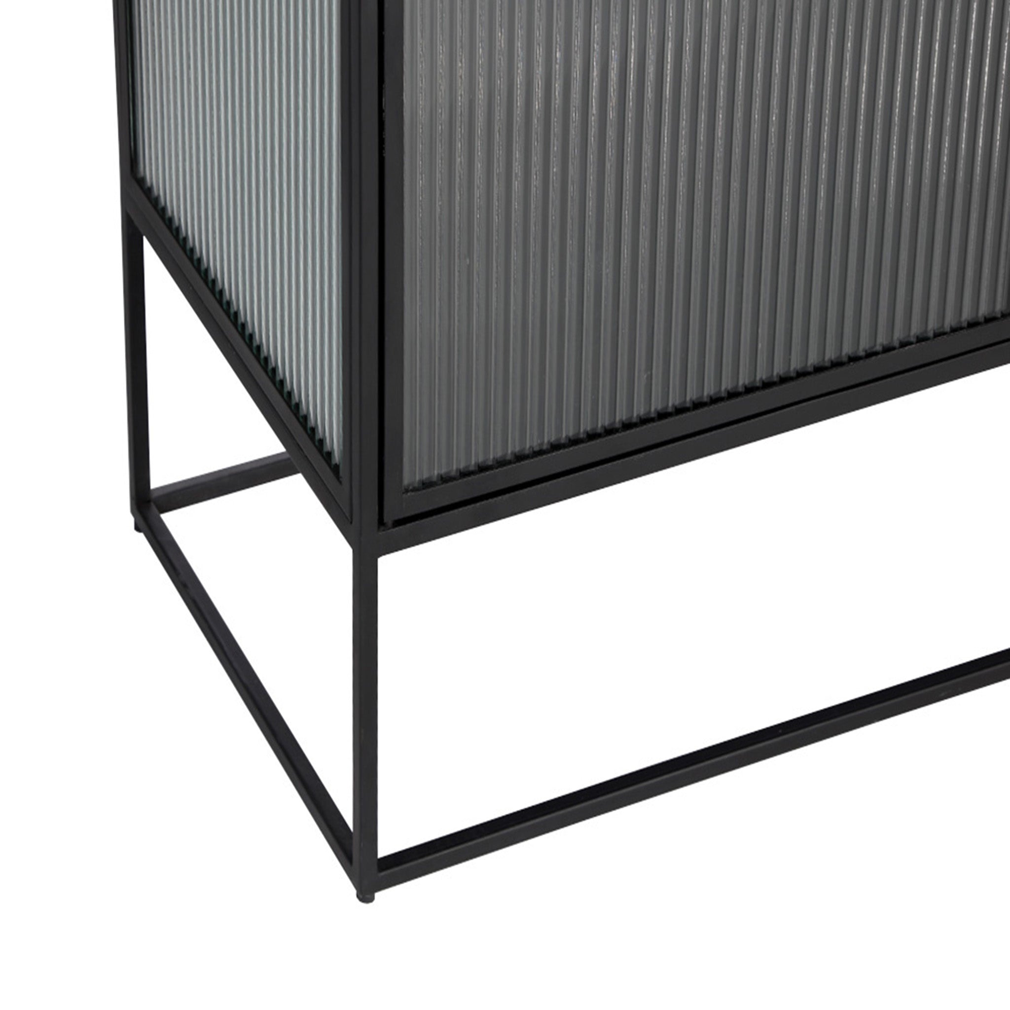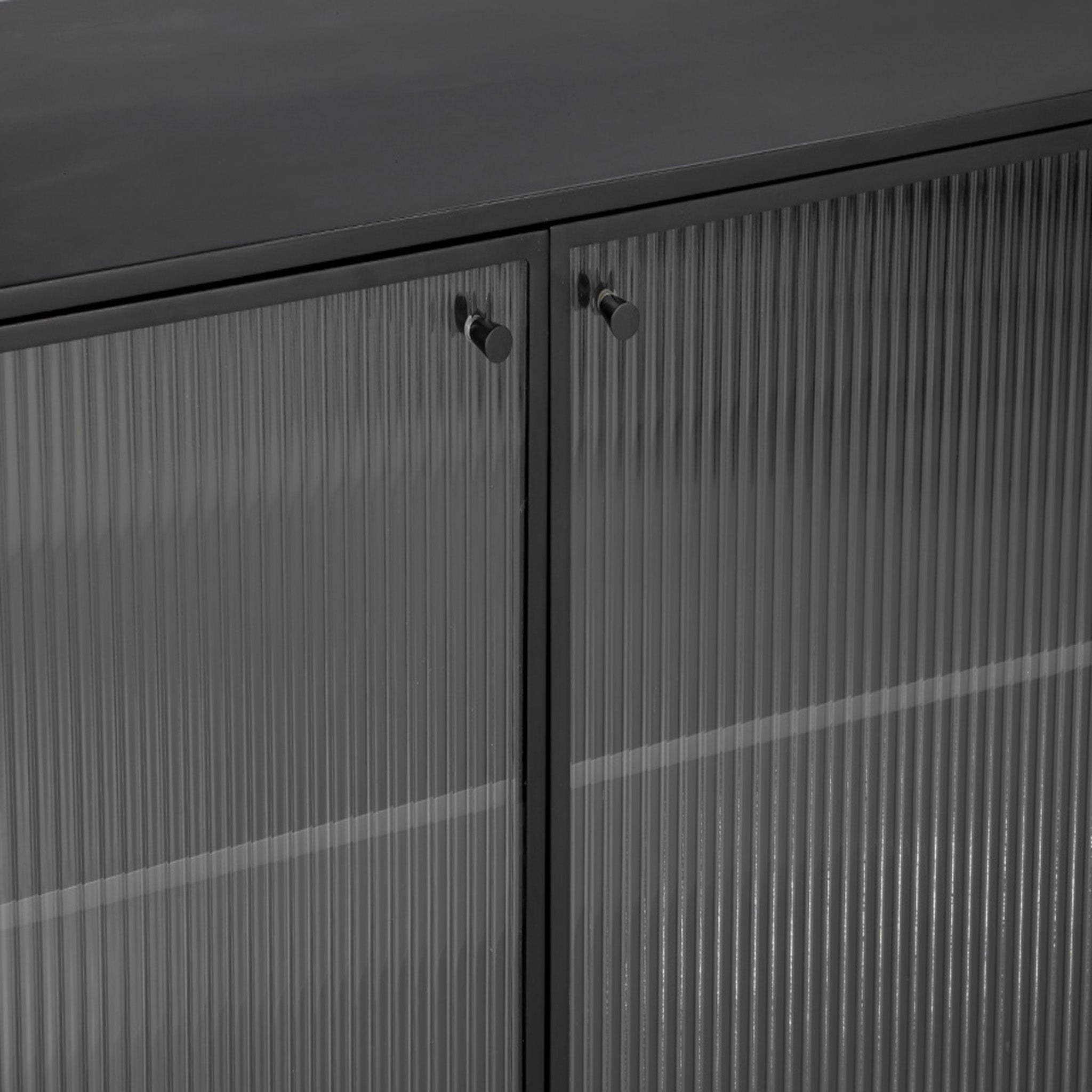 Inspired by mid-century modern designs, this sideboard evokes a timeless and minimalist style. Crafted with a matte black iron frame and features fluted glass doors.