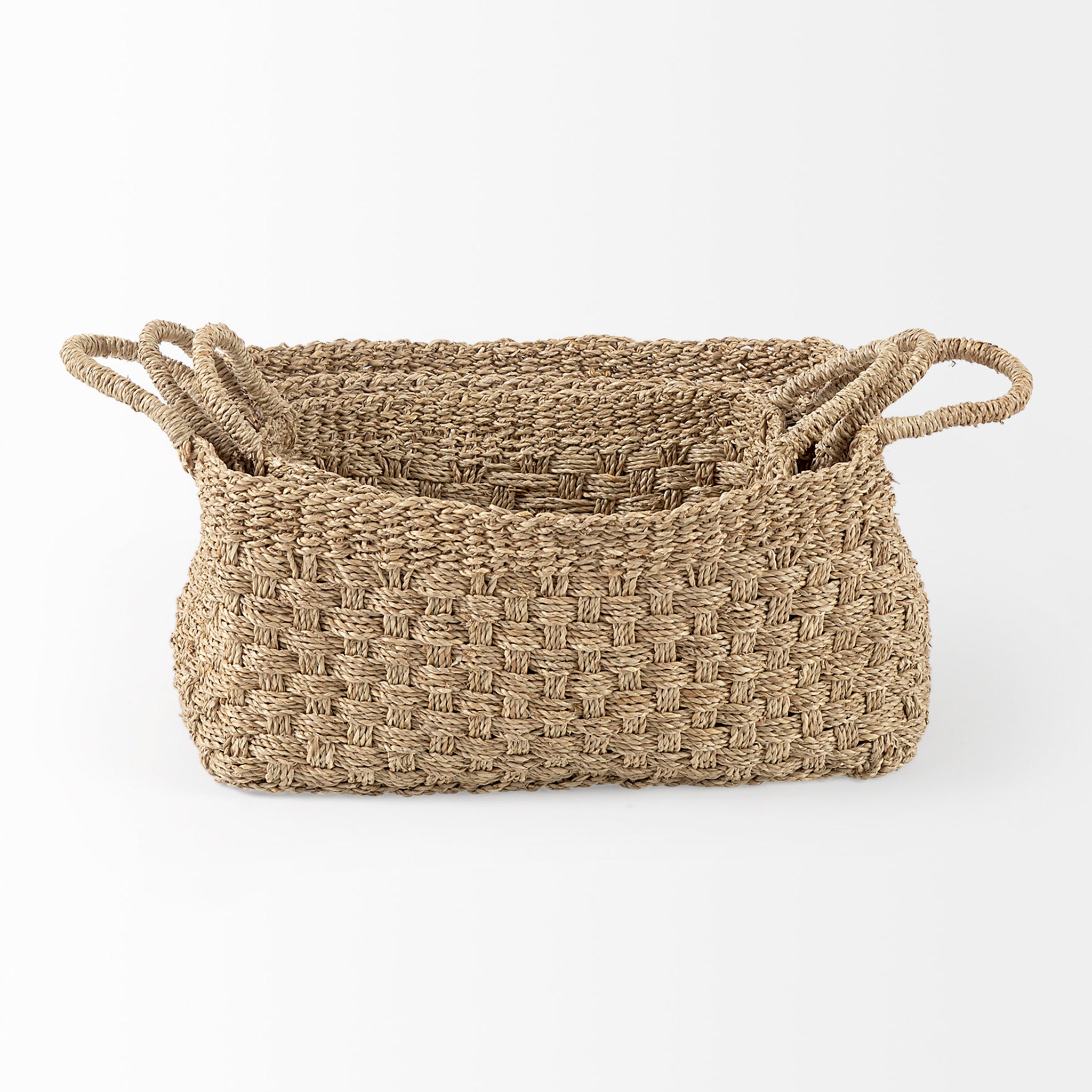 Serveware meets decor with our versatile set of seagrass baskets. Our Eleanor Seagrass Baskets come in a set of 3, and they are an embodiment of rustic charm and functionality that display perfectly in any room. The large rectangular baskets are crafted from natural seagrass and are spacious enough for a variety of uses. The convenient handles also add a practical touch, making it easy to transport and display your belongings, so whether in your kitchen, dining room or even bedroom, this set of baskets are just what you need.