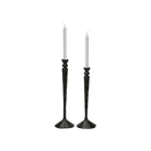 The handsome profile of this set of two candlesticks is rich in traditional design motifs. The slender silhouette of each candleholder is sculpted from aluminum and finished in Black with subtle imperfections that allude to their artisanal craftsmanship. Alternating heights make the decorative candleholder set a dynamic pairing as a rustic accent upon a farmhouse-style dining room table.