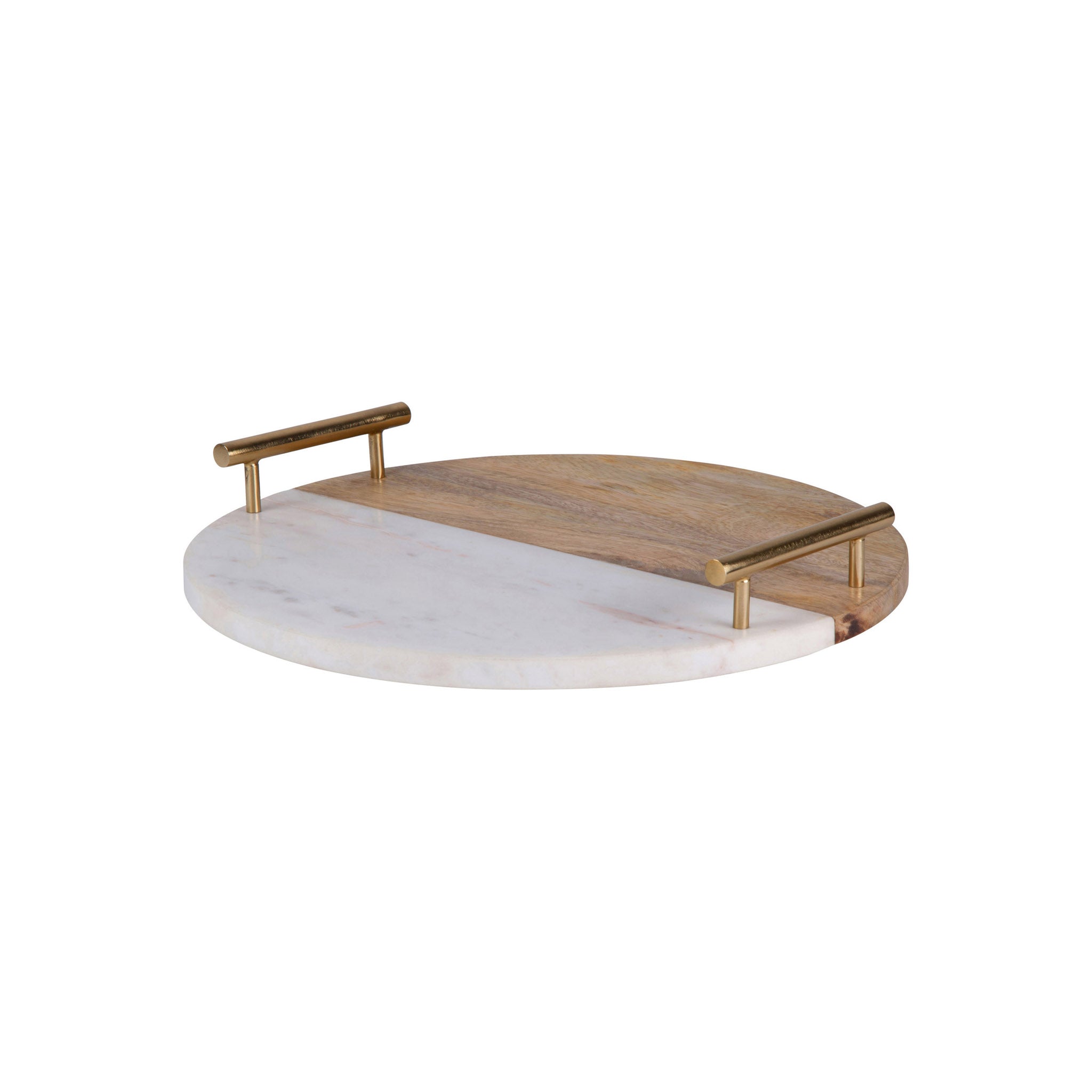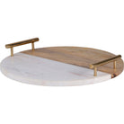 The home gathering experience is elevated aesthetically with this tray design. An attractive blend of warm and cool textures and tones, its half marble, half wood composition makes it stand out from the norm. Antique brass plated handles further enhance the piece and offer greater ease-of-use.