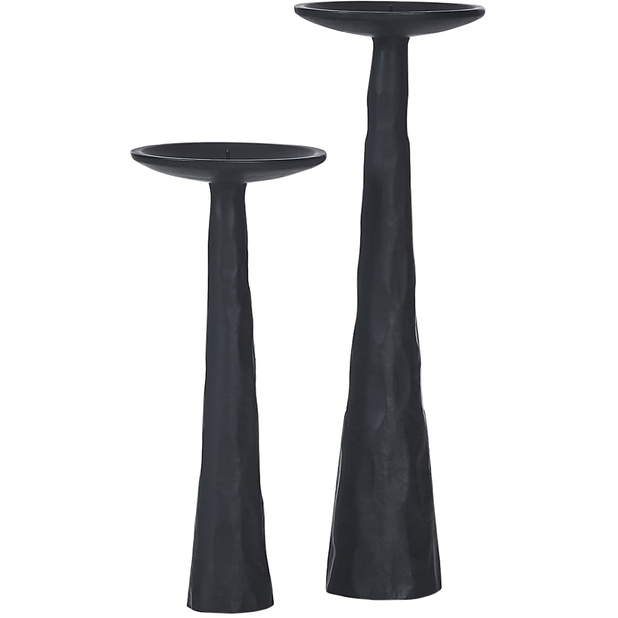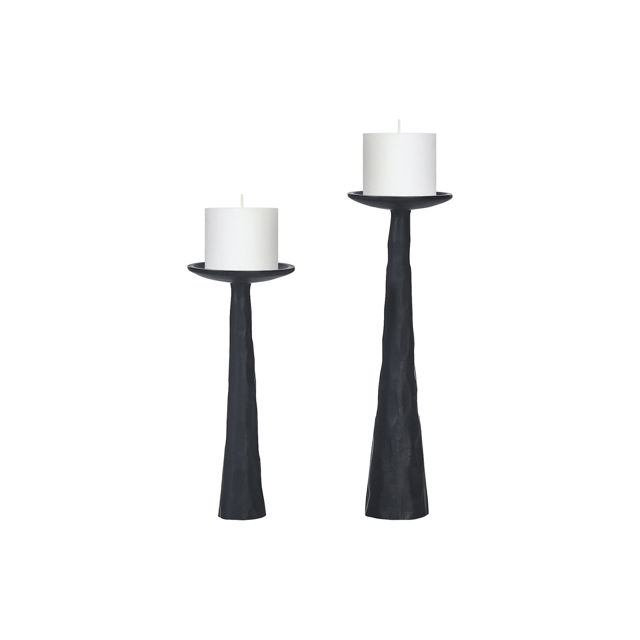 The Tamara Candle Holders are stunning on a buffet or console table. With one pillar standing at 13 inches and the other 10, they complement one another and create greater dramatic impact through their differences. Composed of cast aluminum painted matte black, they are even more exquisite with glowing candles atop.