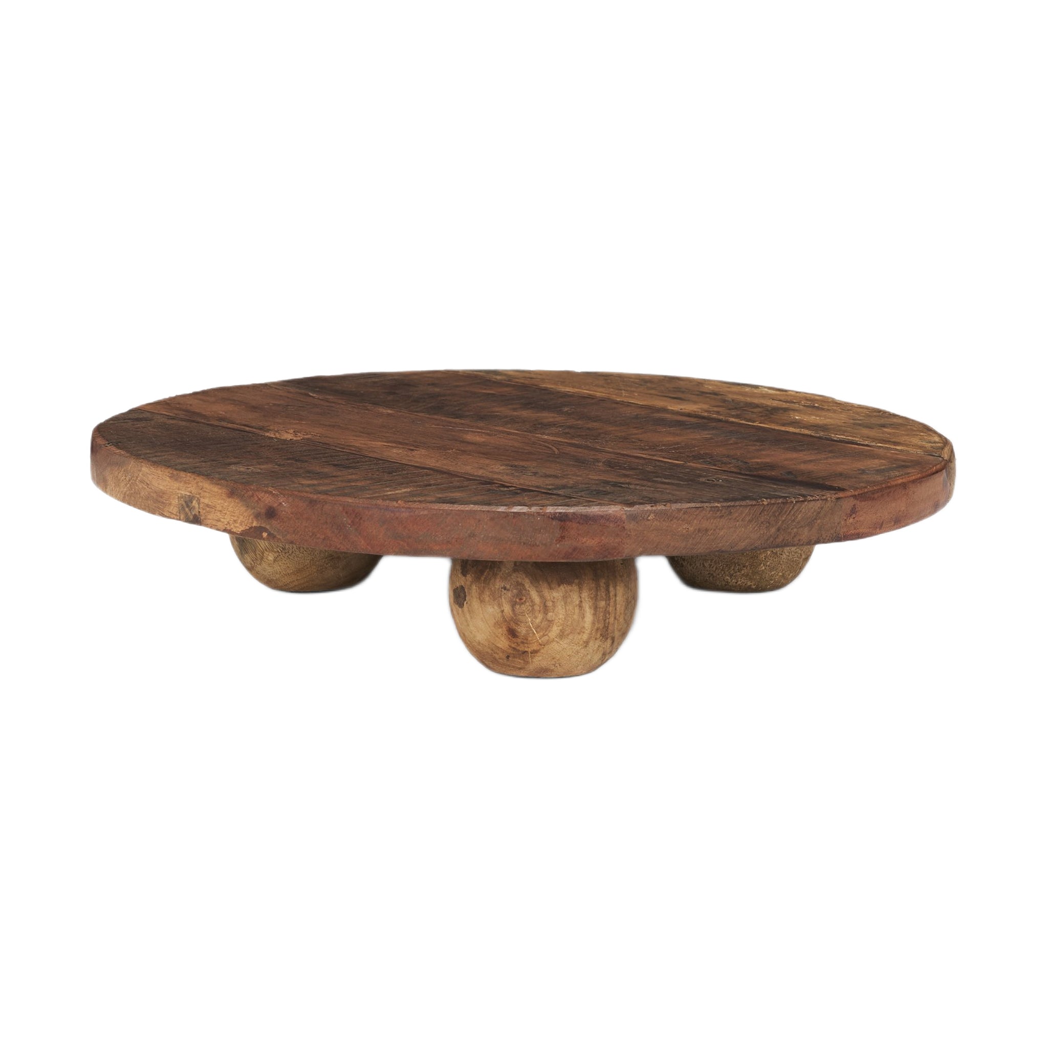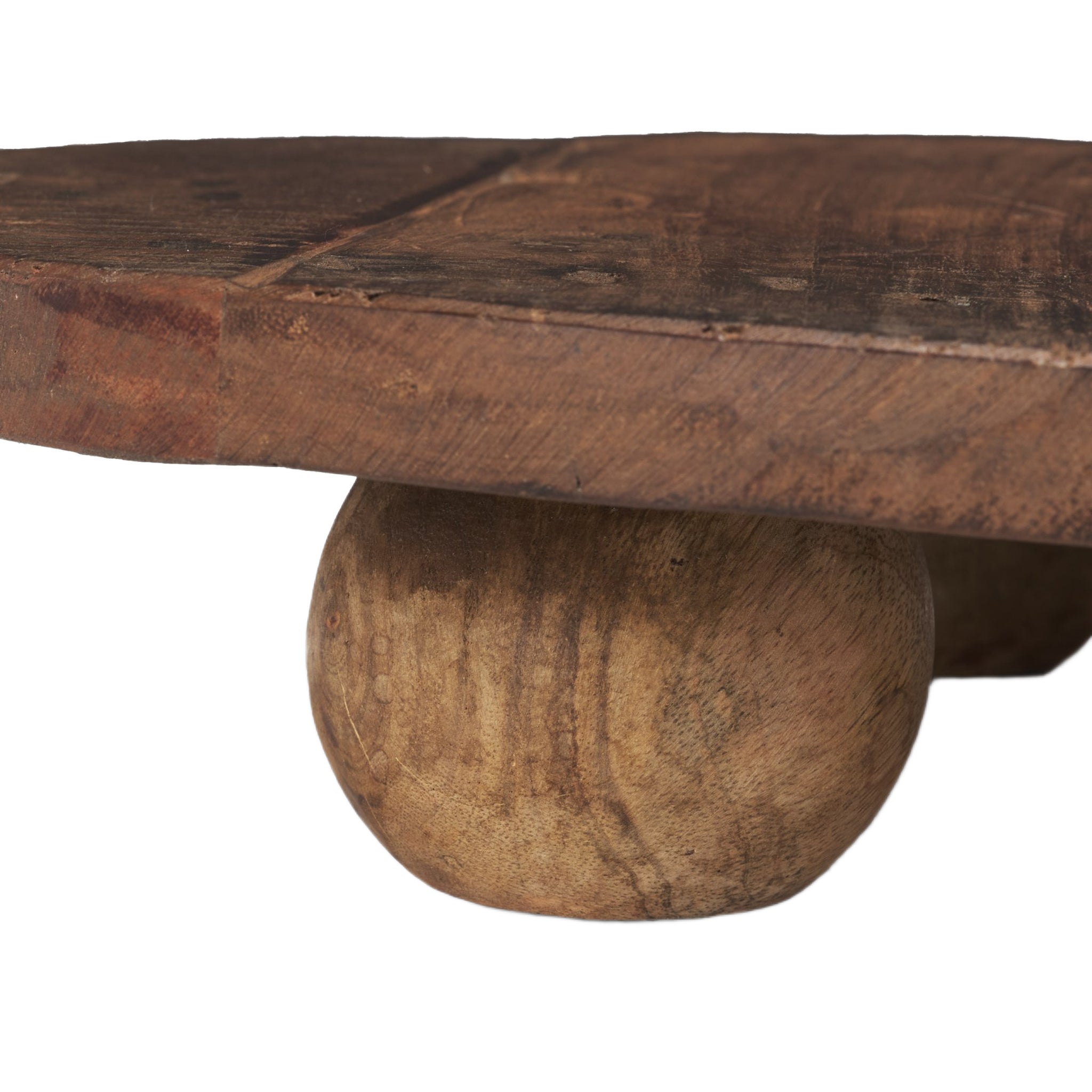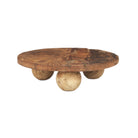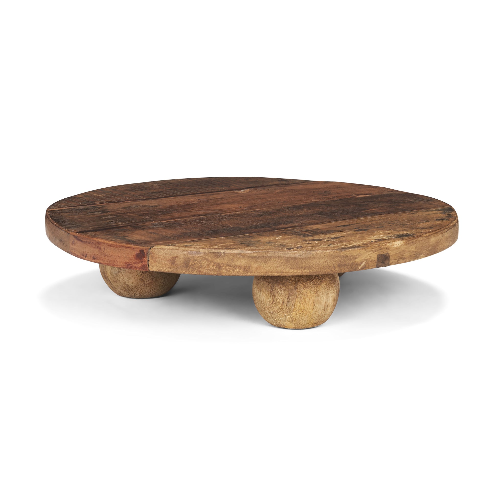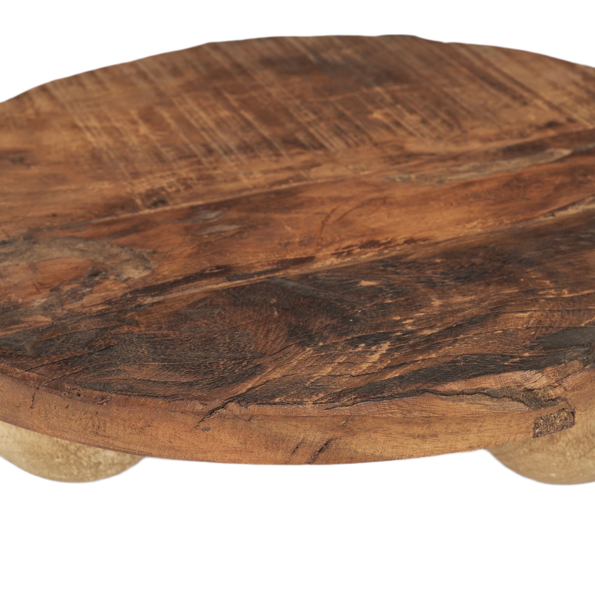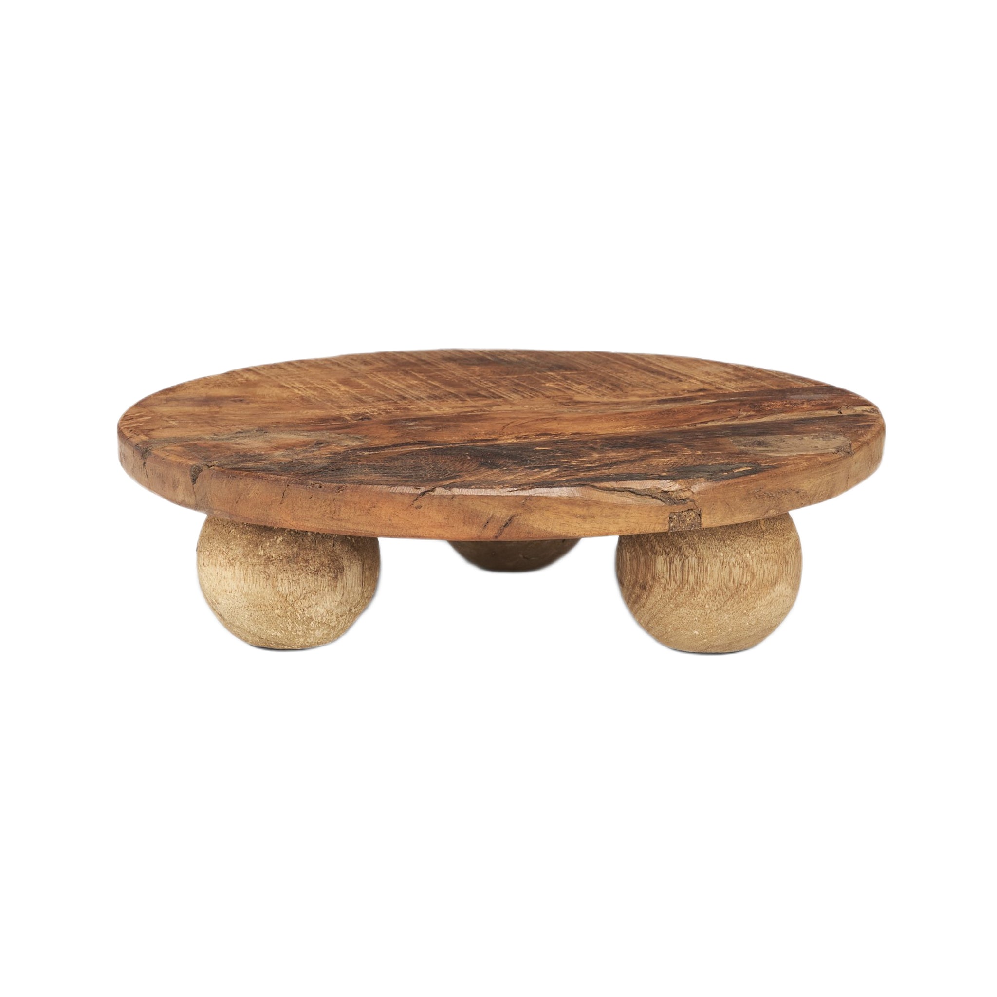 The Ryan Tray is crafted from solid reclaimed wood in a natural finish, featuring a round top set on sculptural ball feet.