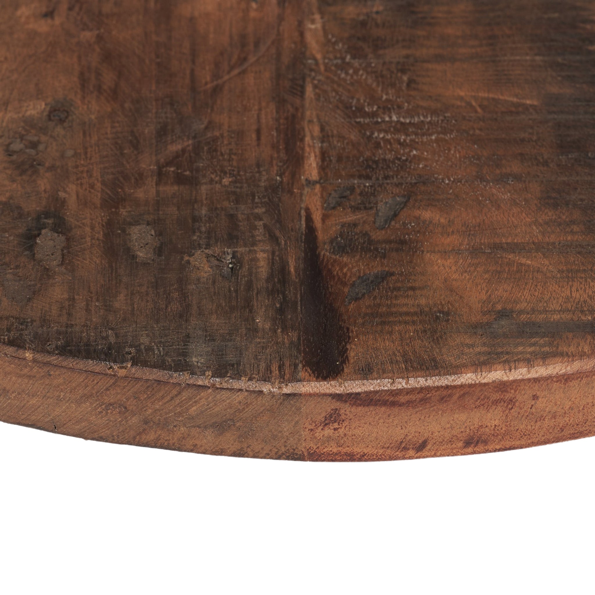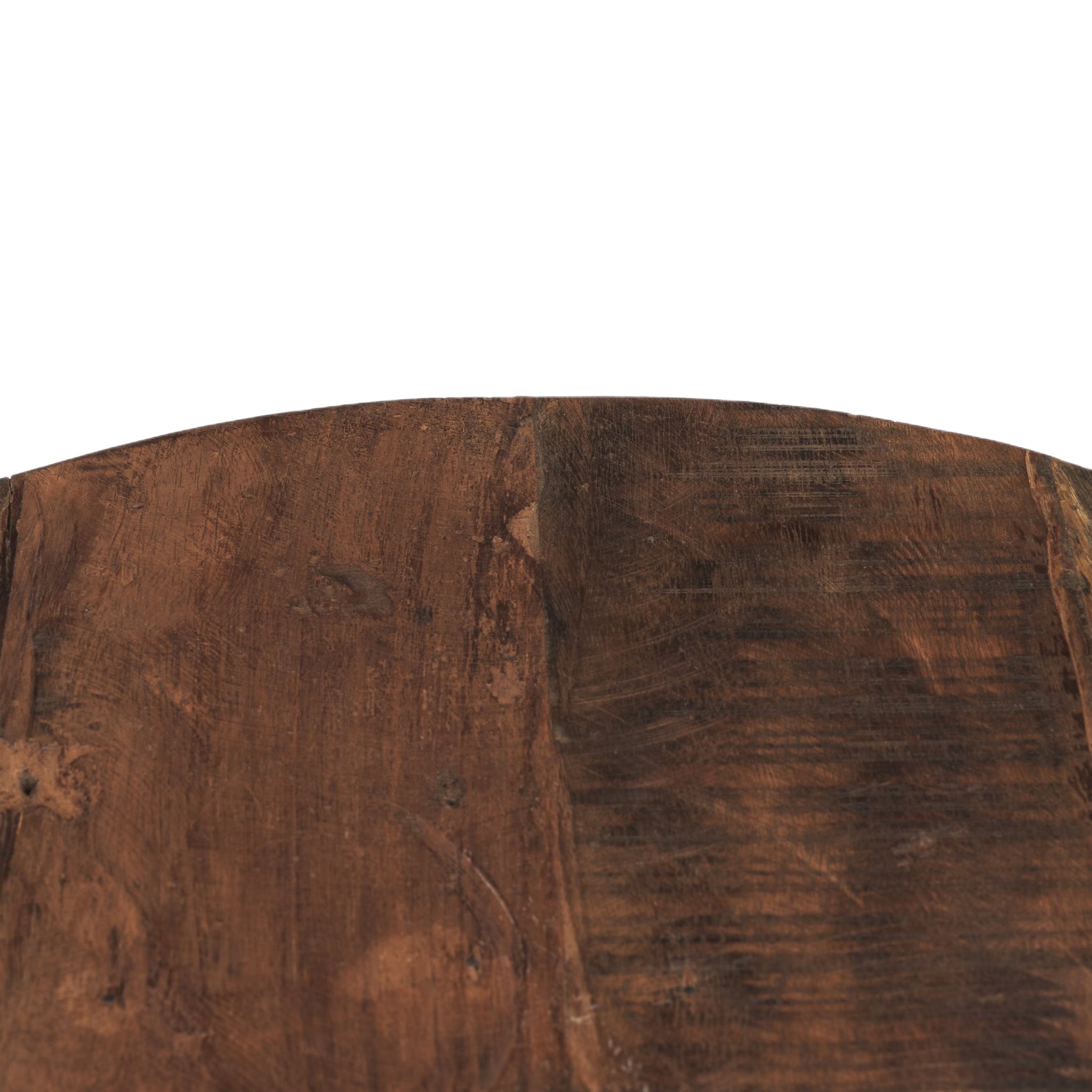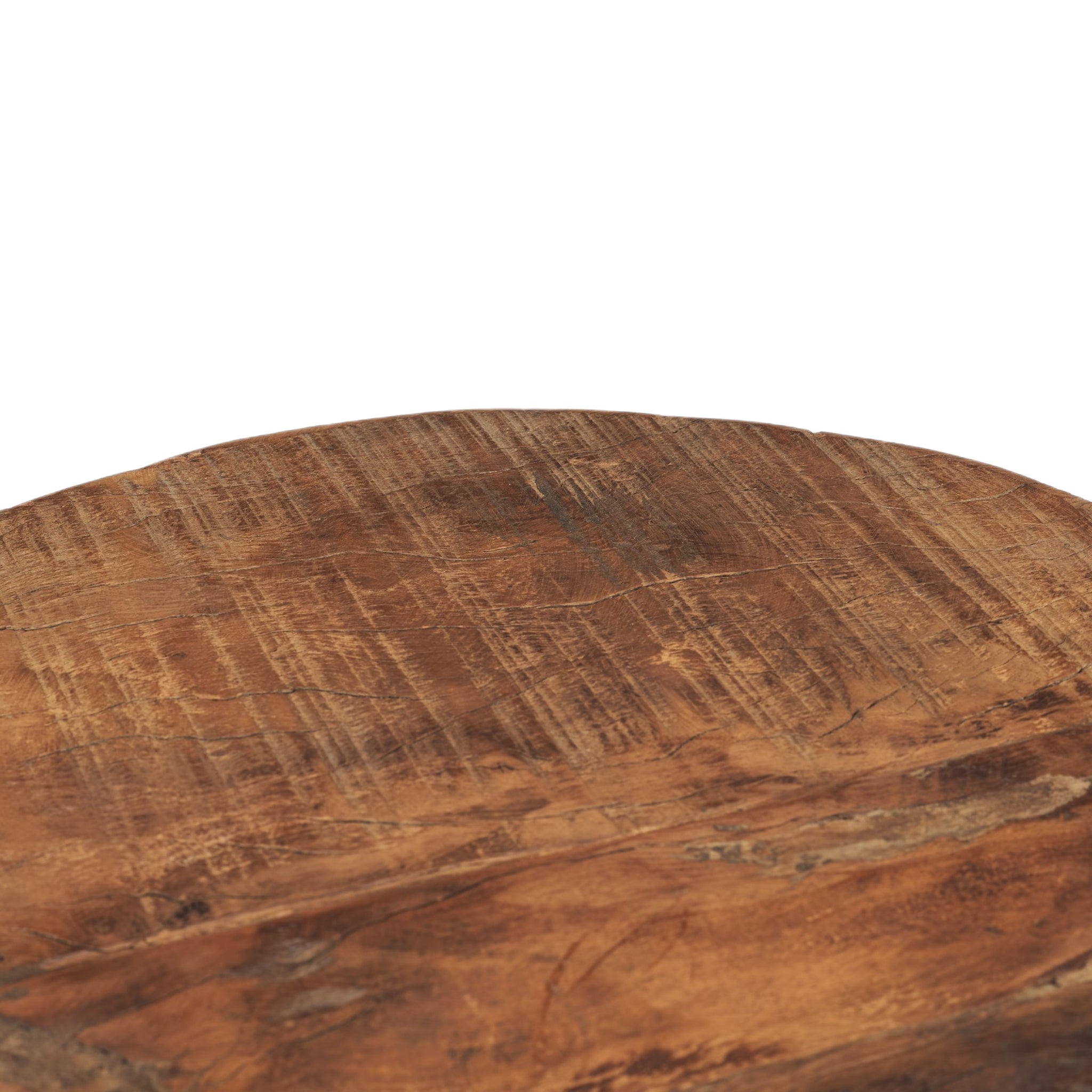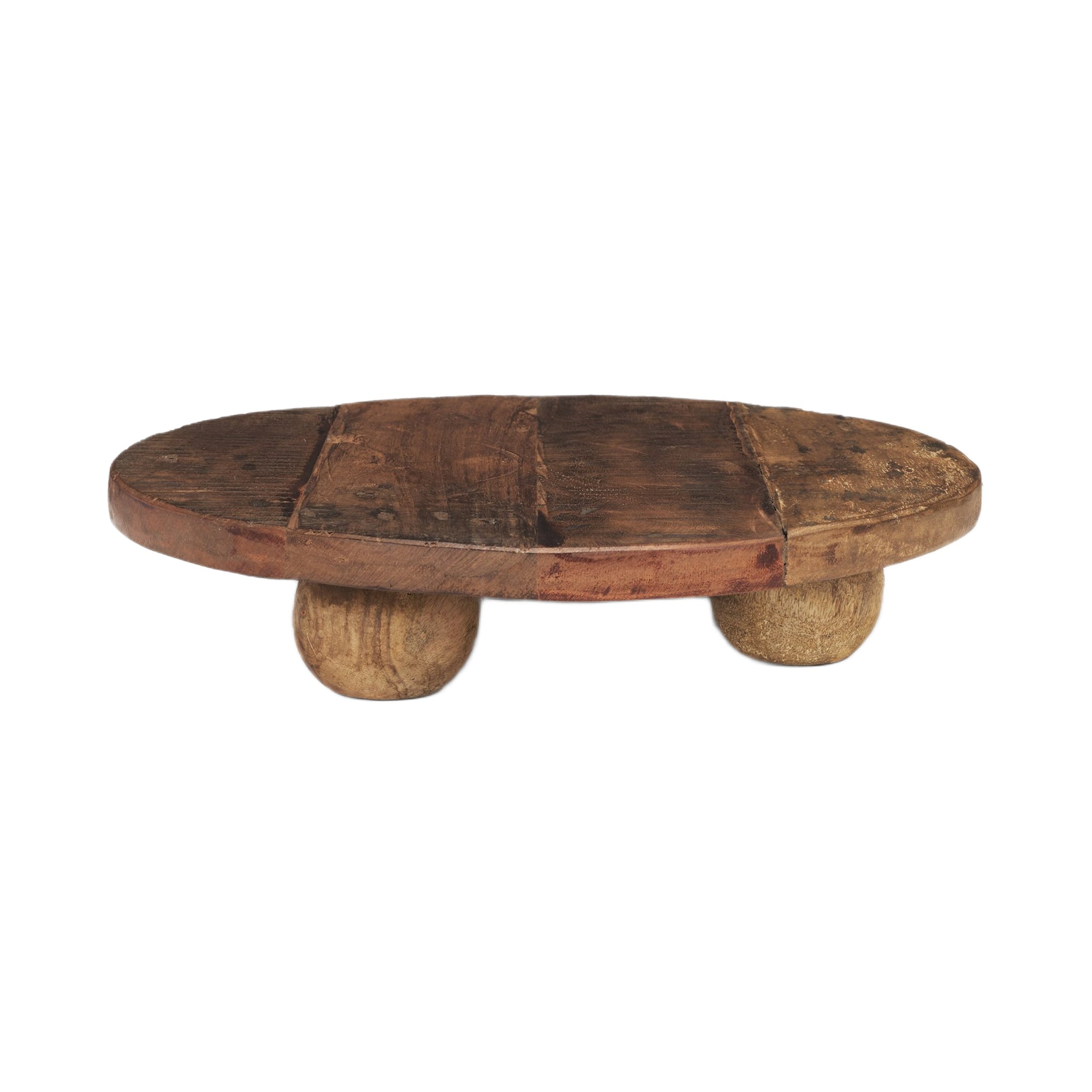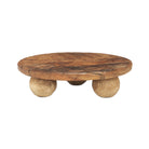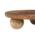 The Ryan Tray is crafted from solid reclaimed wood in a natural finish, featuring a round top set on sculptural ball feet.