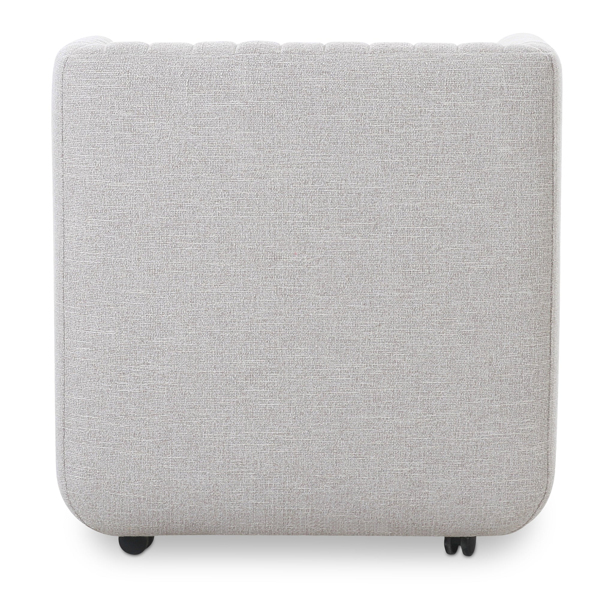The Beau rolling dining chair's oversized squared form and interior channeling detail merge beautifully with textured performance fabric upholstery to complement its rolling design. Its simple elegance combines with a padded seat and armrests to create a versatile piece that encapsulates effortless accessibility and indulgent comfort.