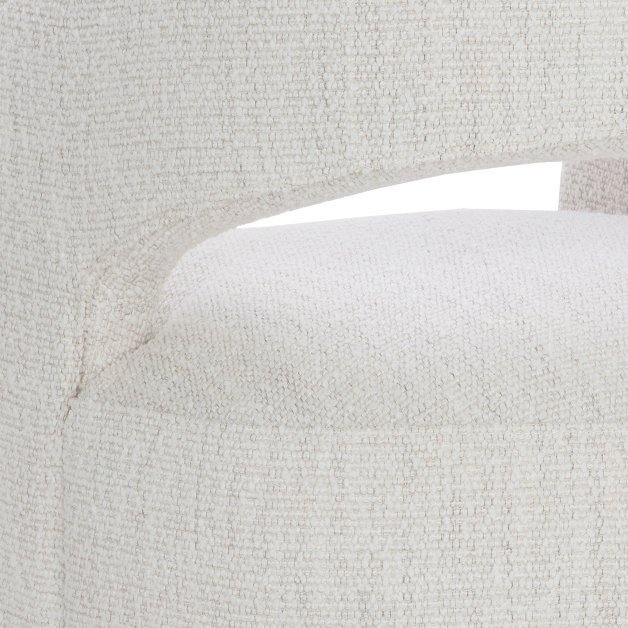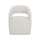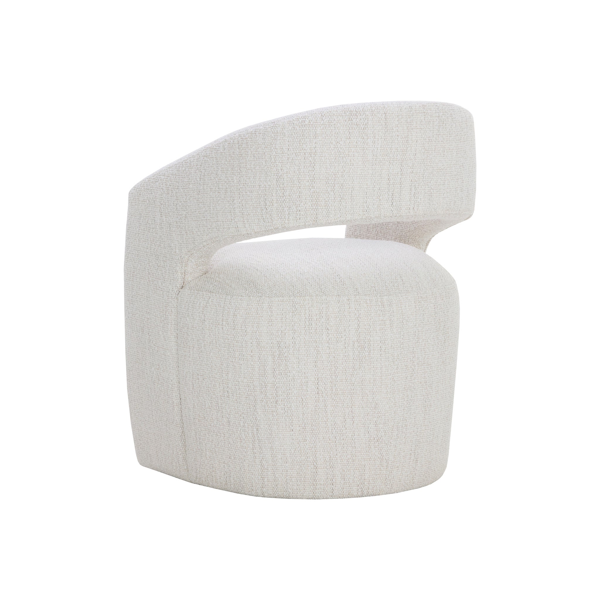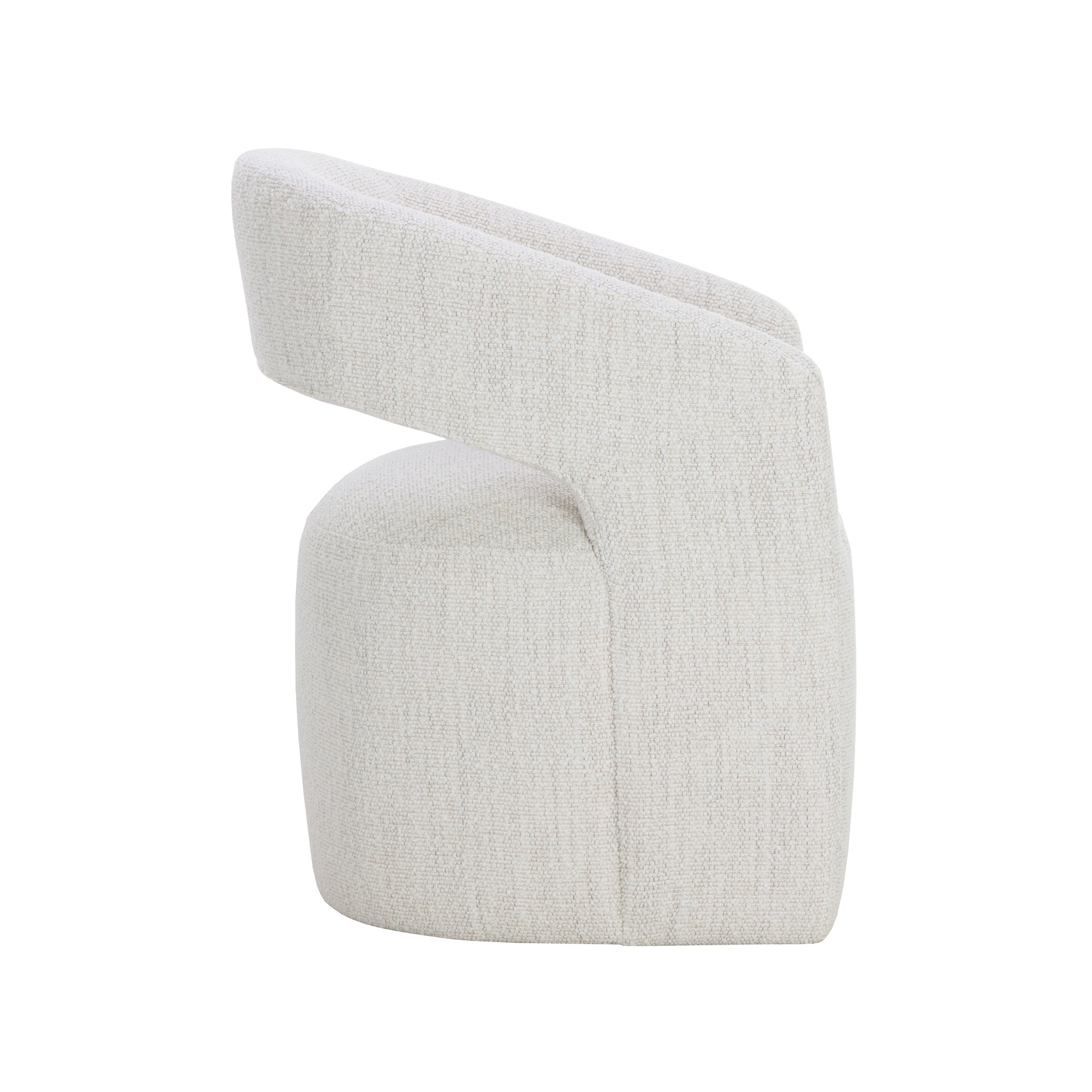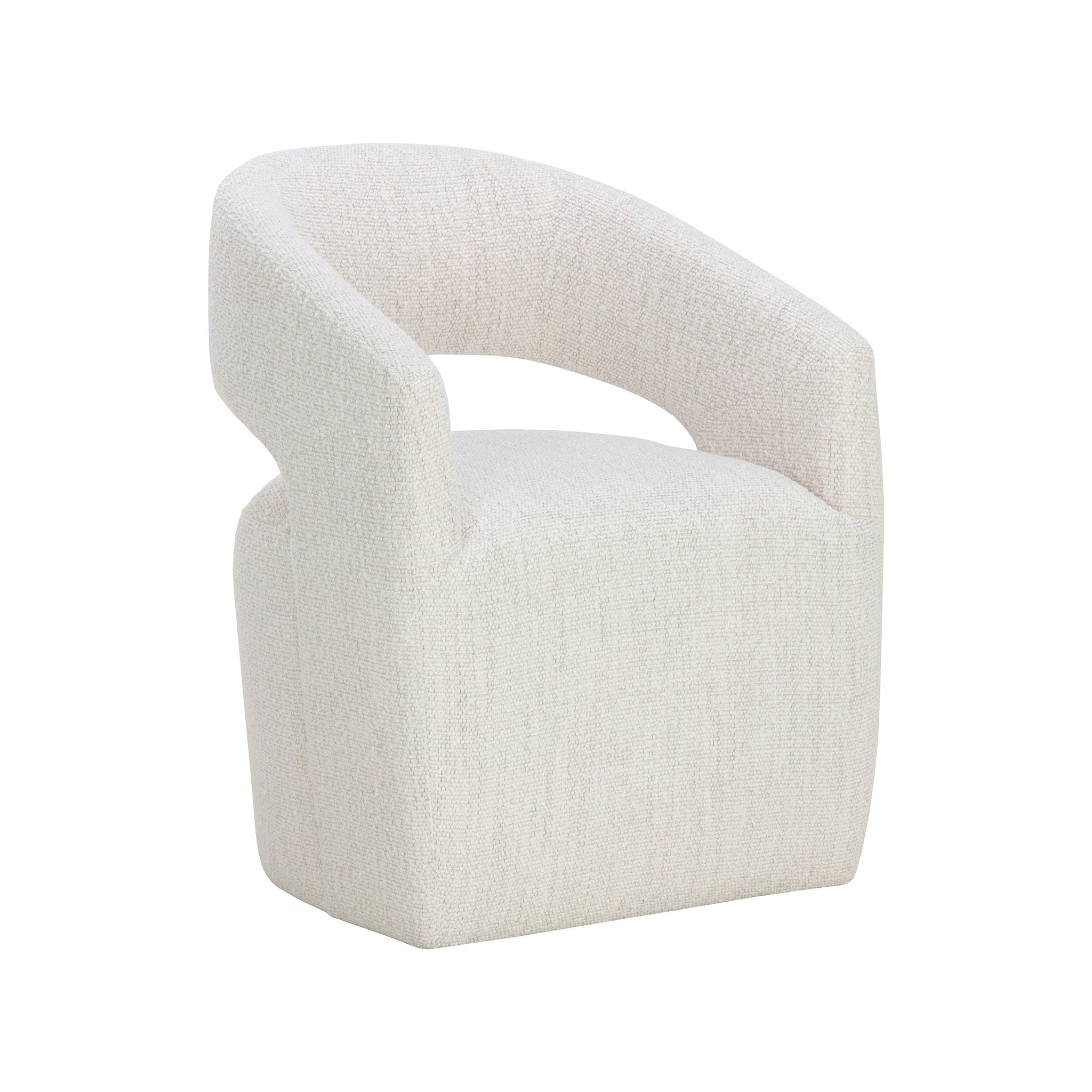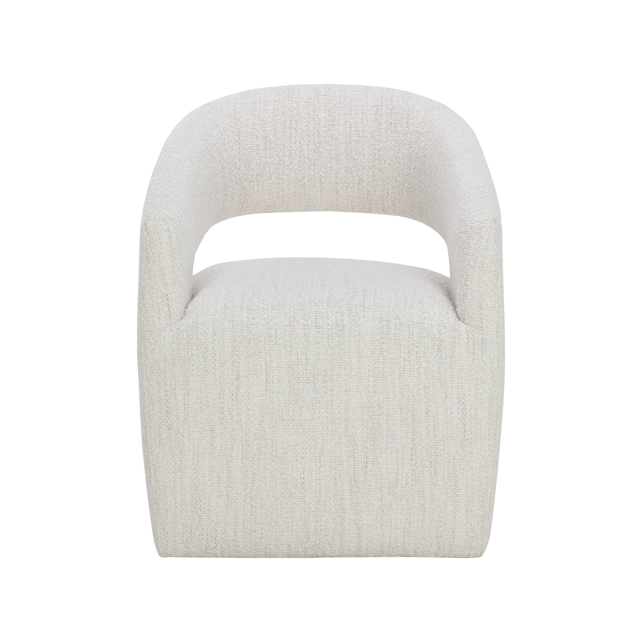Gentle curves give the Donald Wheeled Dining Armchair an elegantly defined silhouette. Fully upholstered in merino pearl performance fabric with a comfortable seat and casters for an easy glide. Performance fabric is moisture repellent, durable and easy to clean.