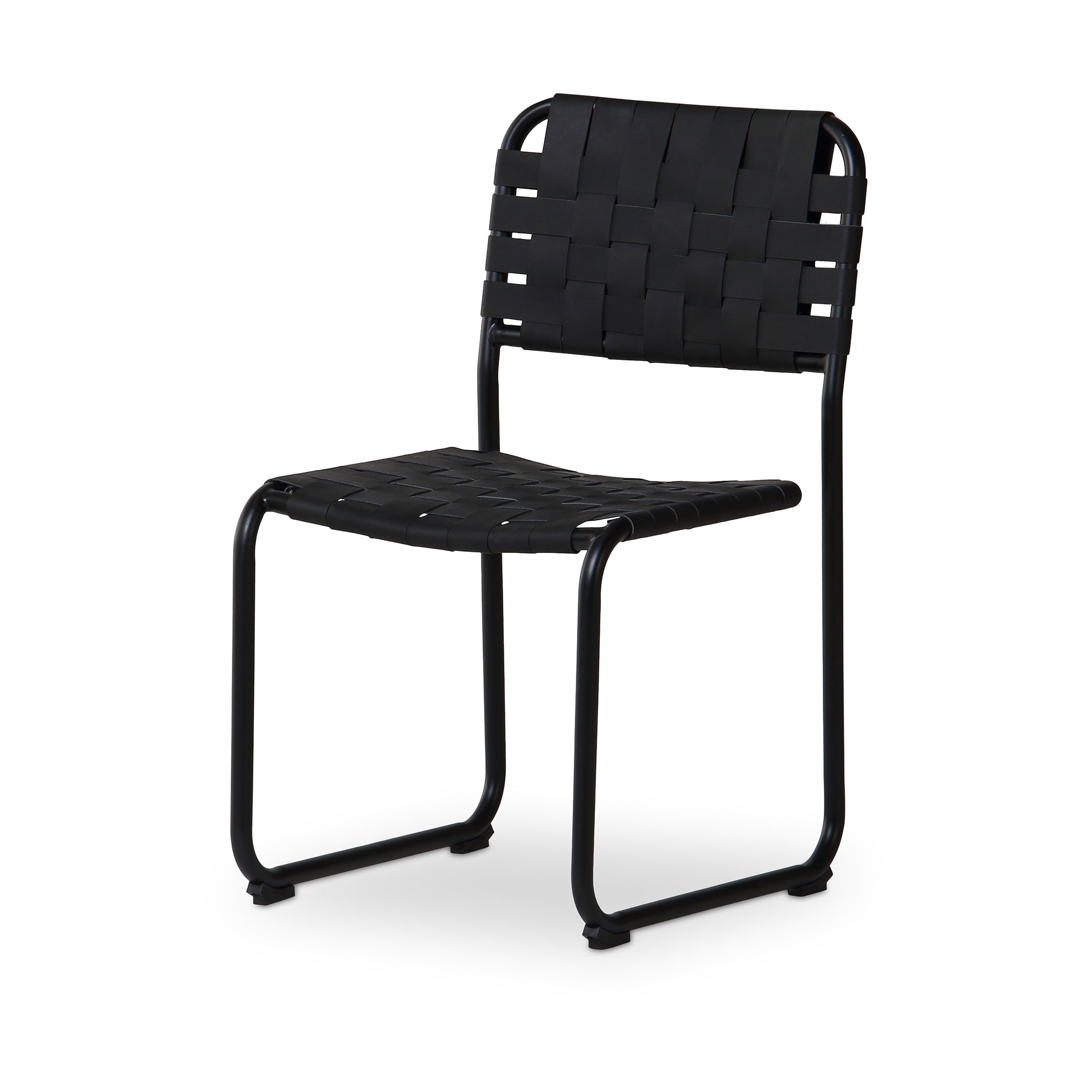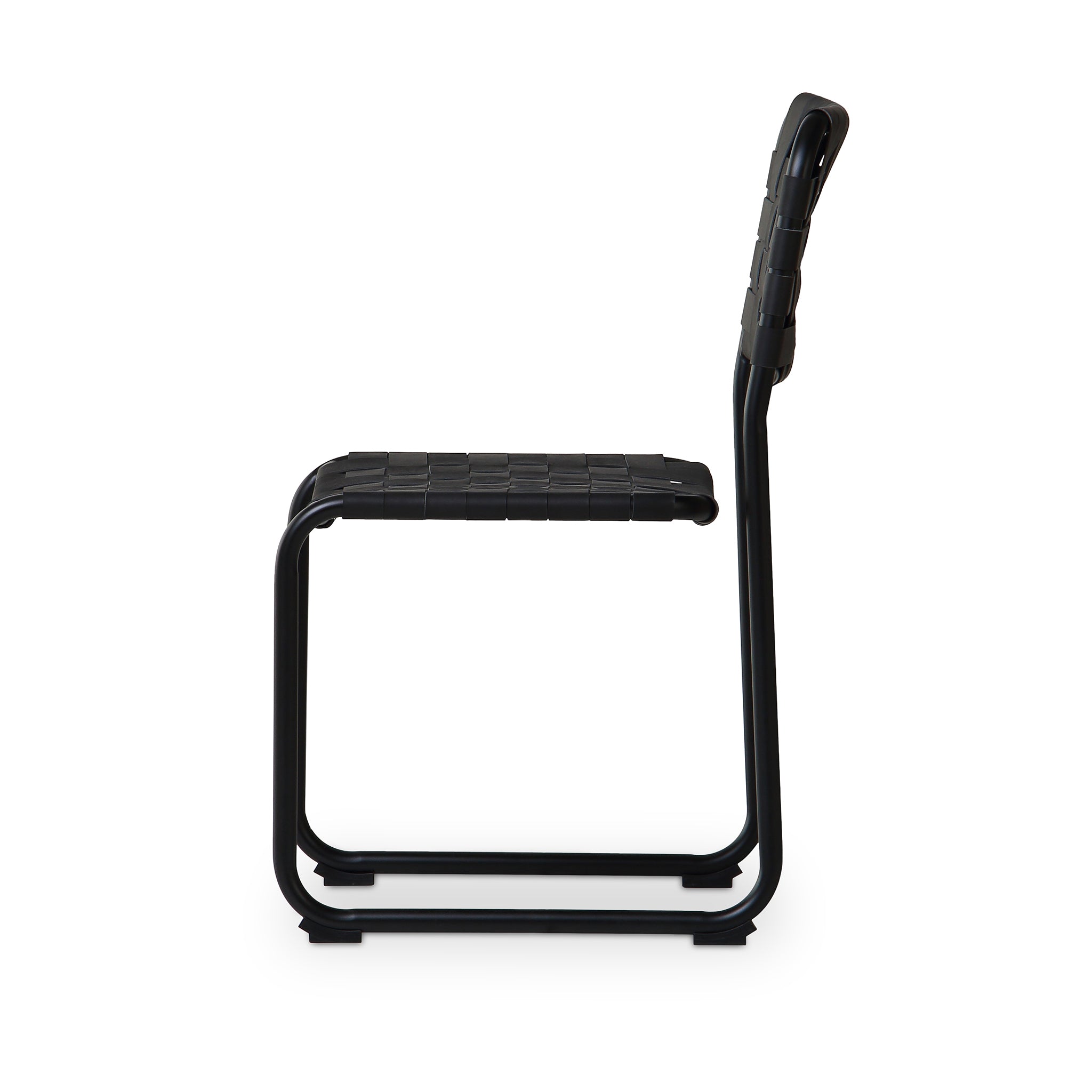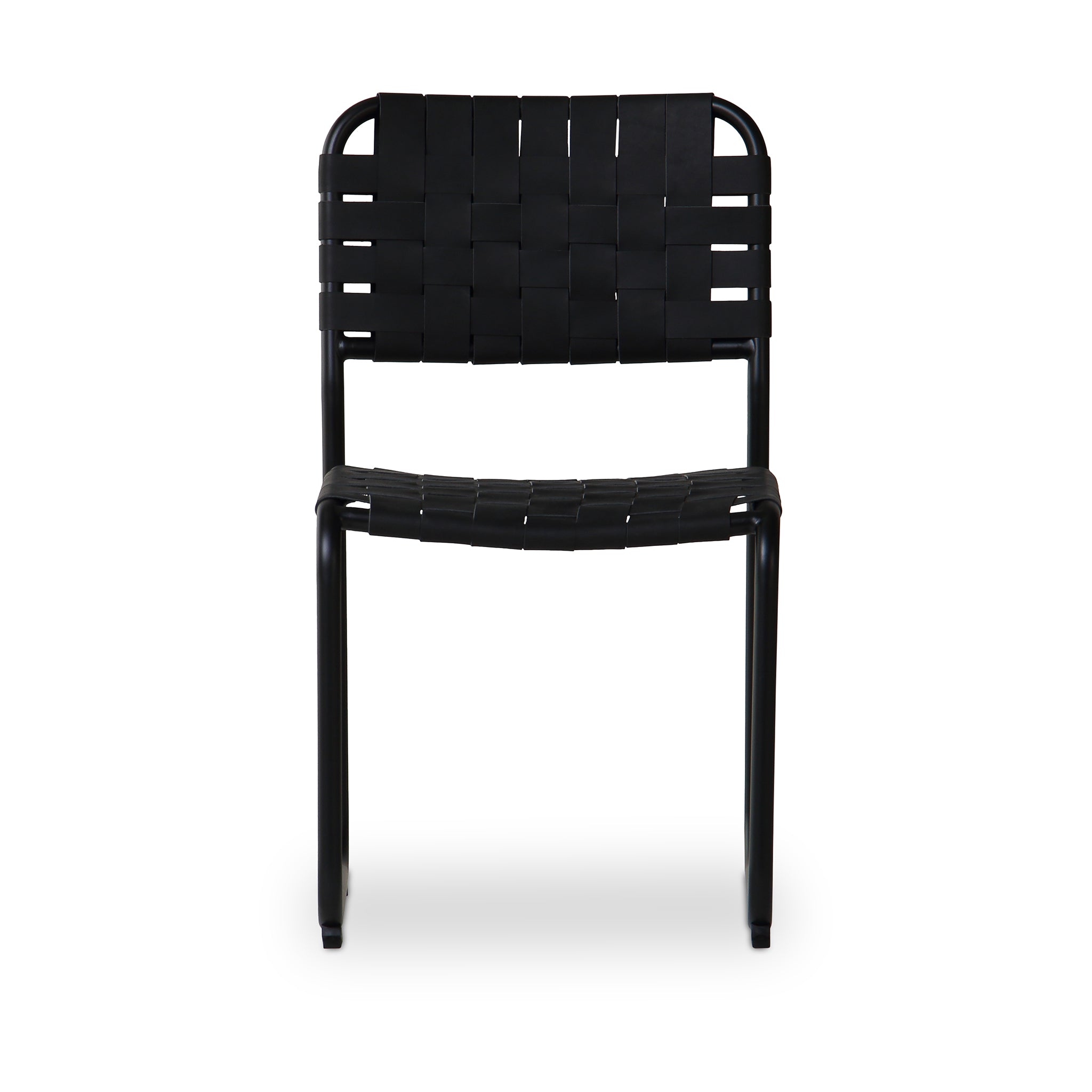 The Eli dining chair is a trend-forward piece blending handmade charm with industrial chic. It features a sturdy black iron frame, artistically complemented by handwoven leather straps in a classic basketweave pattern across the seat and back. The leather's rich texture against the sleek metal base and cut-out back adds visual depth, while a distinctive gap between the seat and back enhances its modern appeal.