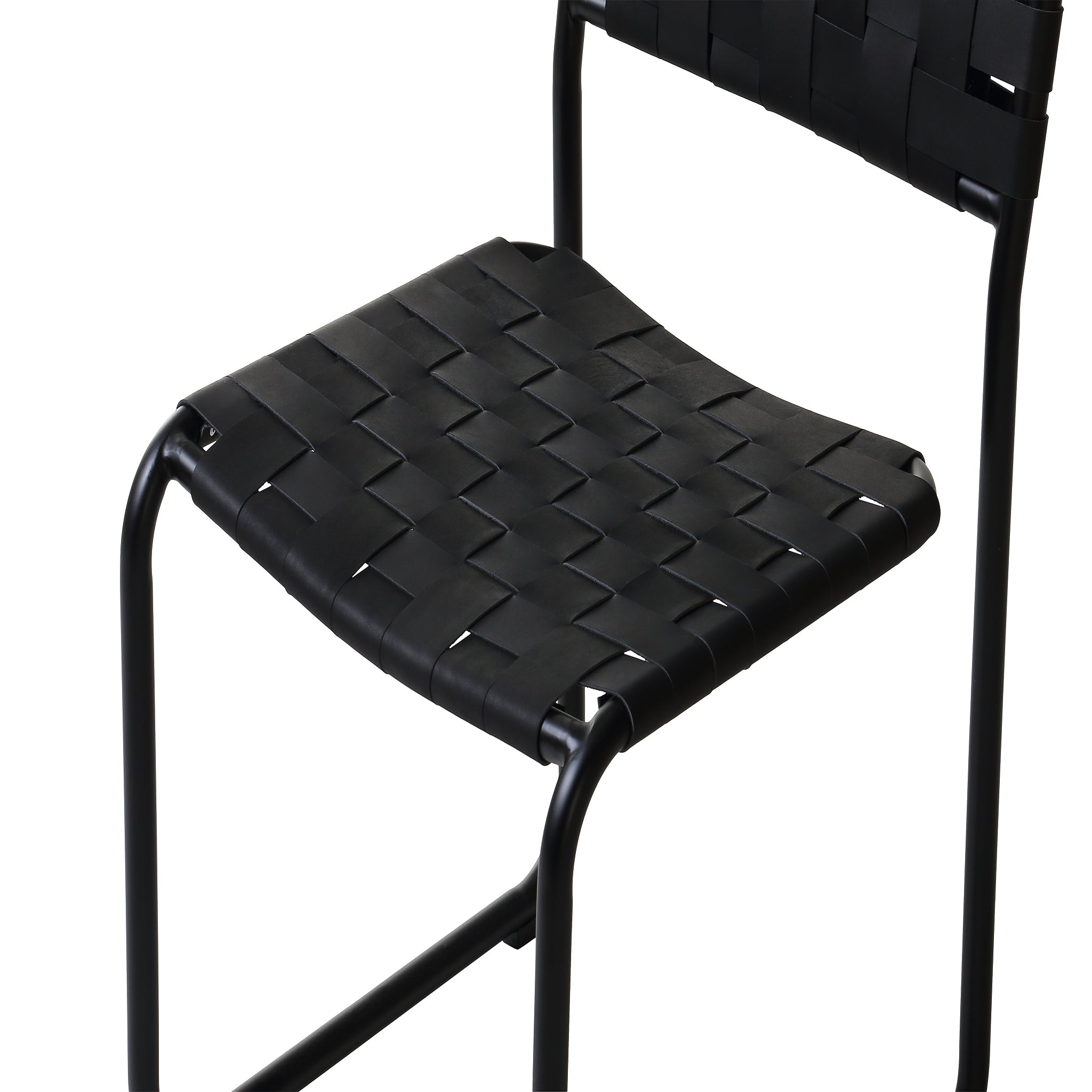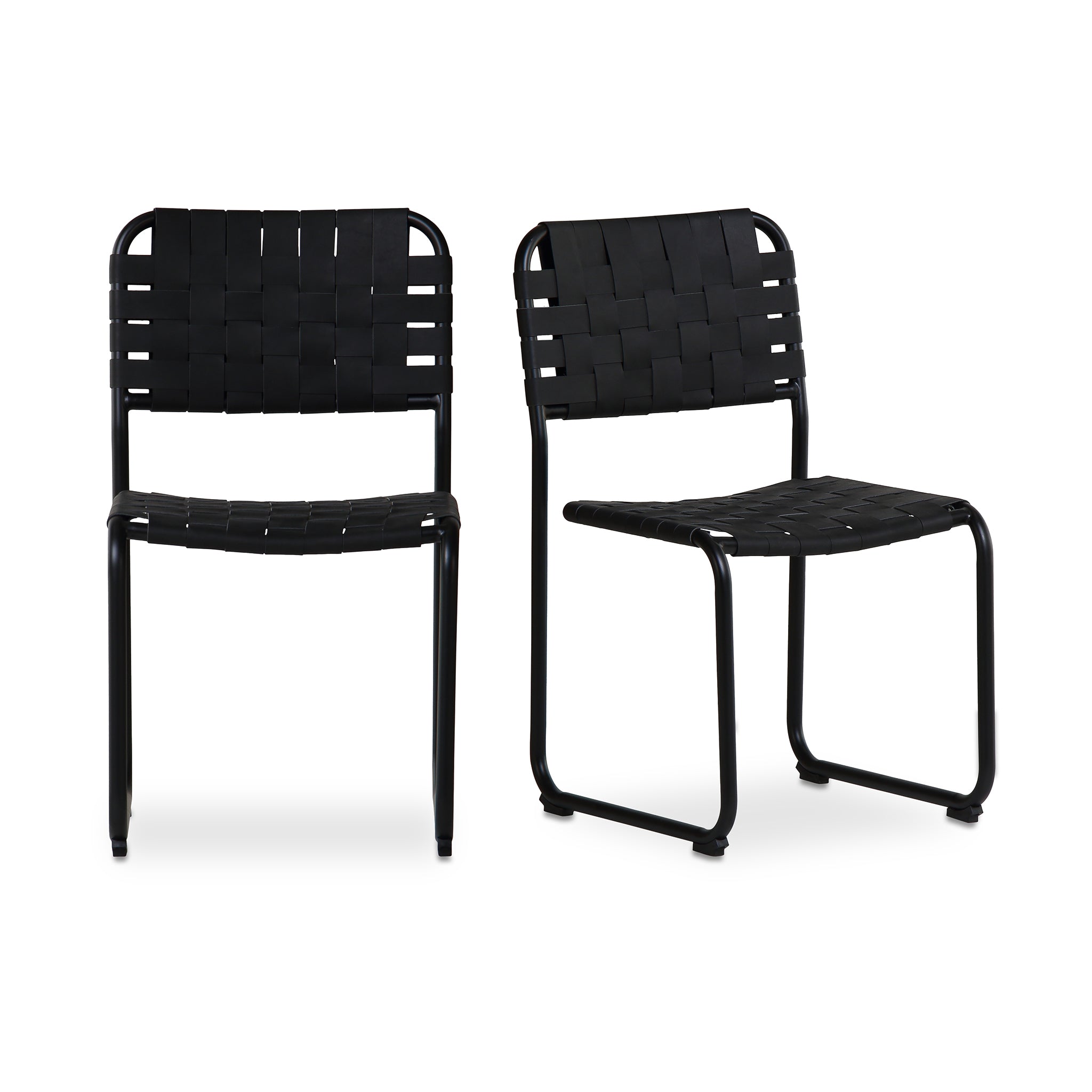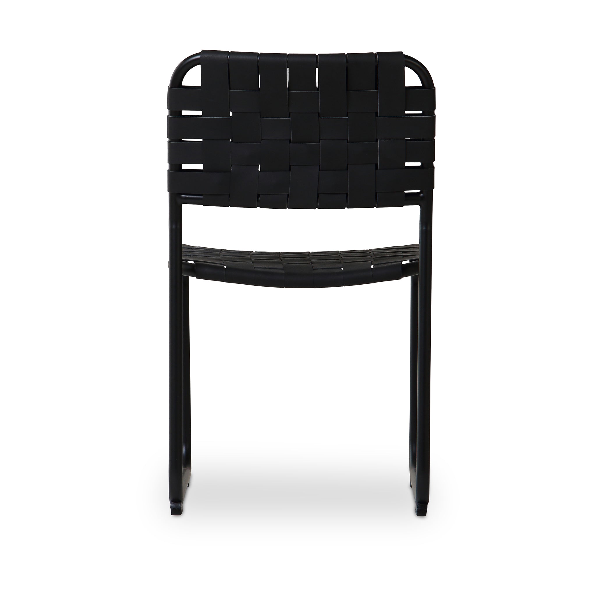 The Eli dining chair is a trend-forward piece blending handmade charm with industrial chic. It features a sturdy black iron frame, artistically complemented by handwoven leather straps in a classic basketweave pattern across the seat and back. The leather's rich texture against the sleek metal base and cut-out back adds visual depth, while a distinctive gap between the seat and back enhances its modern appeal.