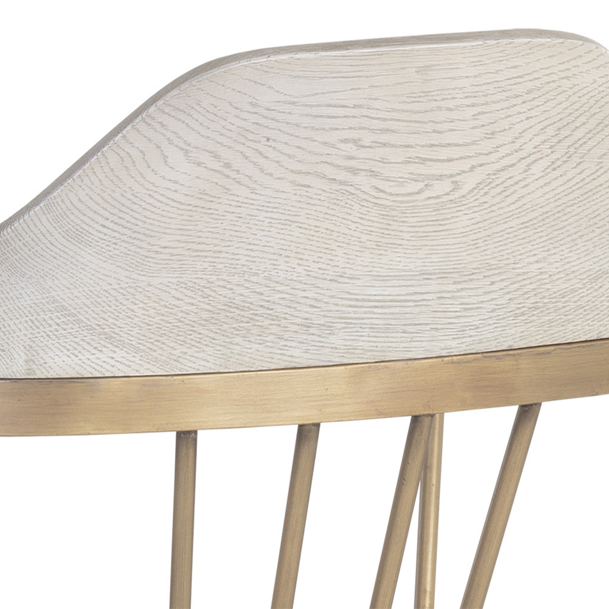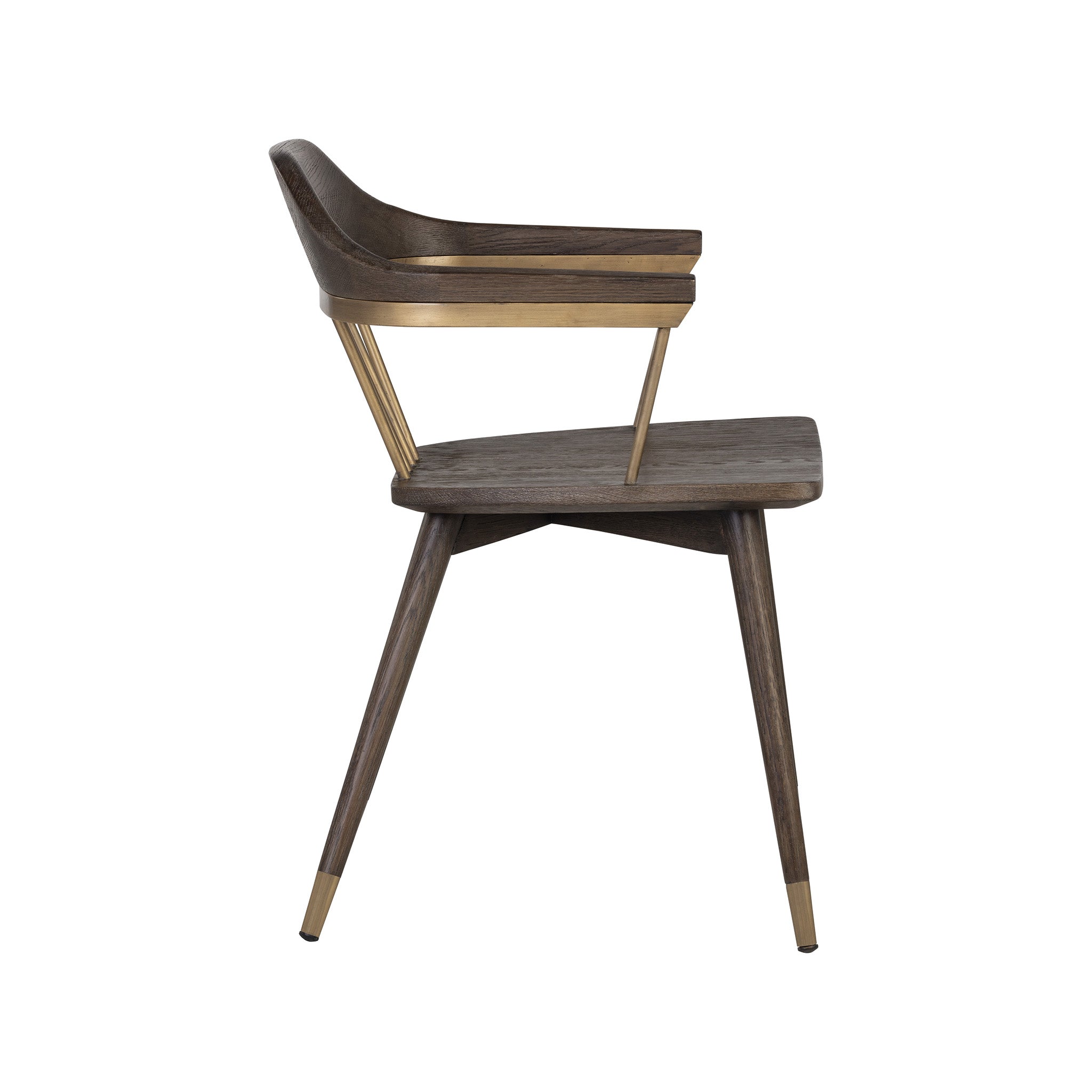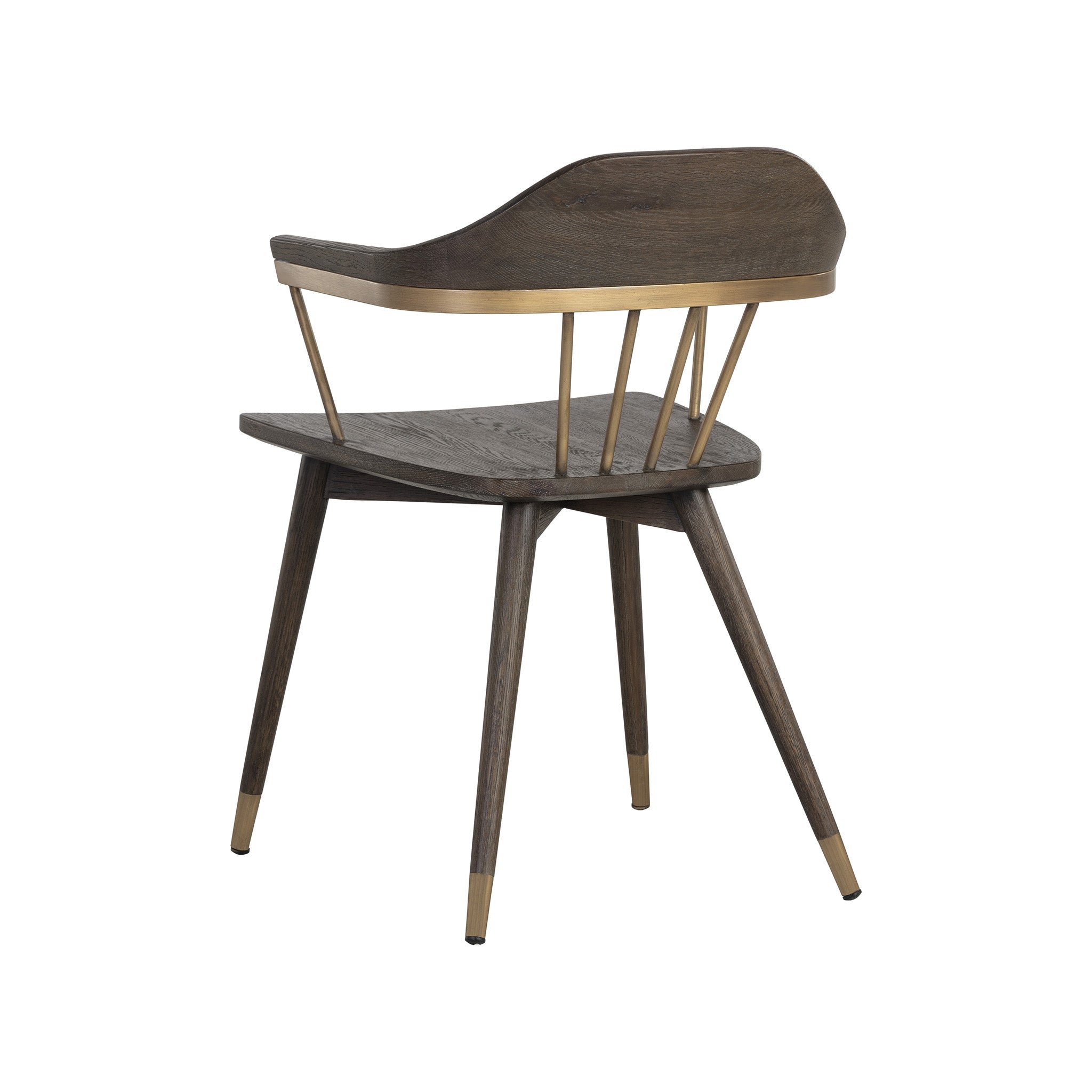 The classic elegance of this dining chair is guaranteed to make a statement in any dining room. The stylish antique brass spindles complement the matching metal caps of the chair legs. Completed with a solid oak wood base.
