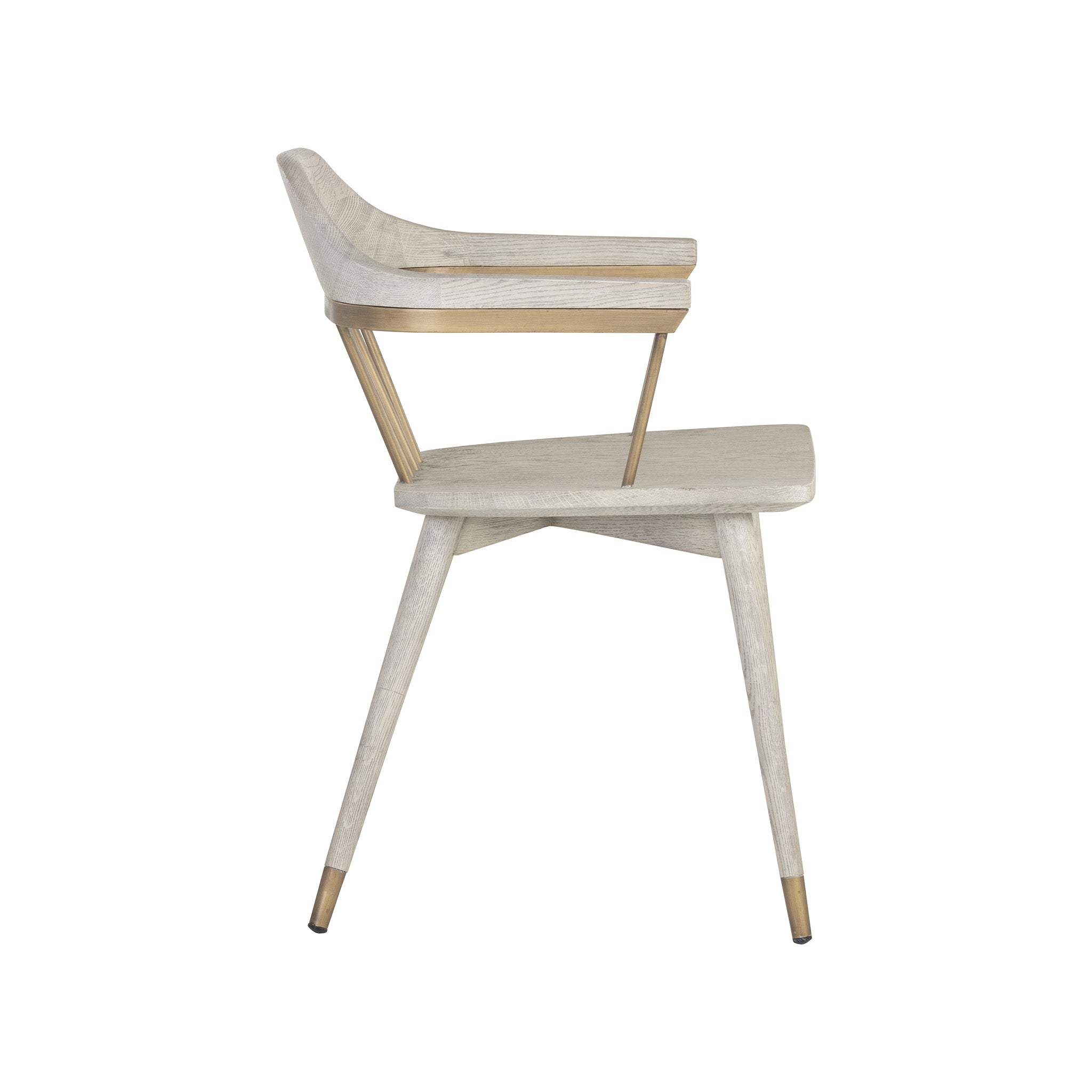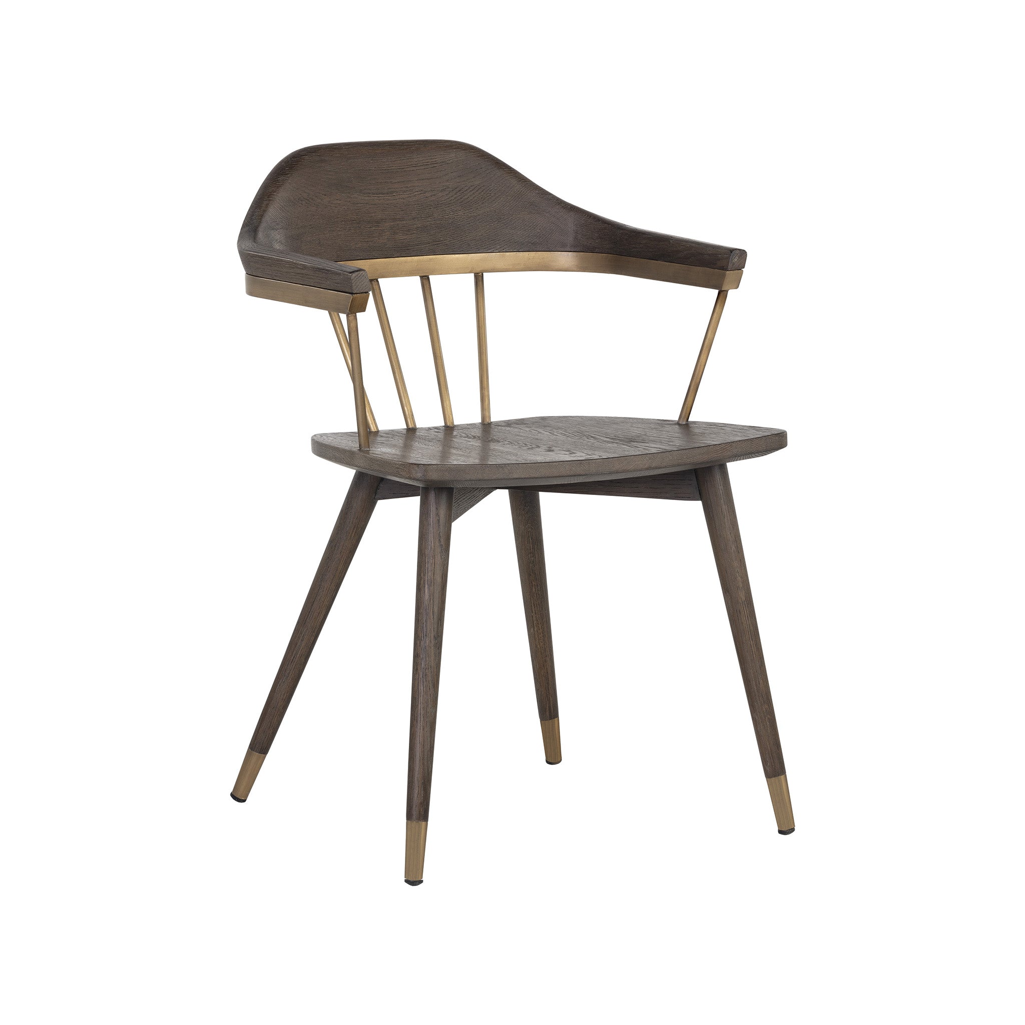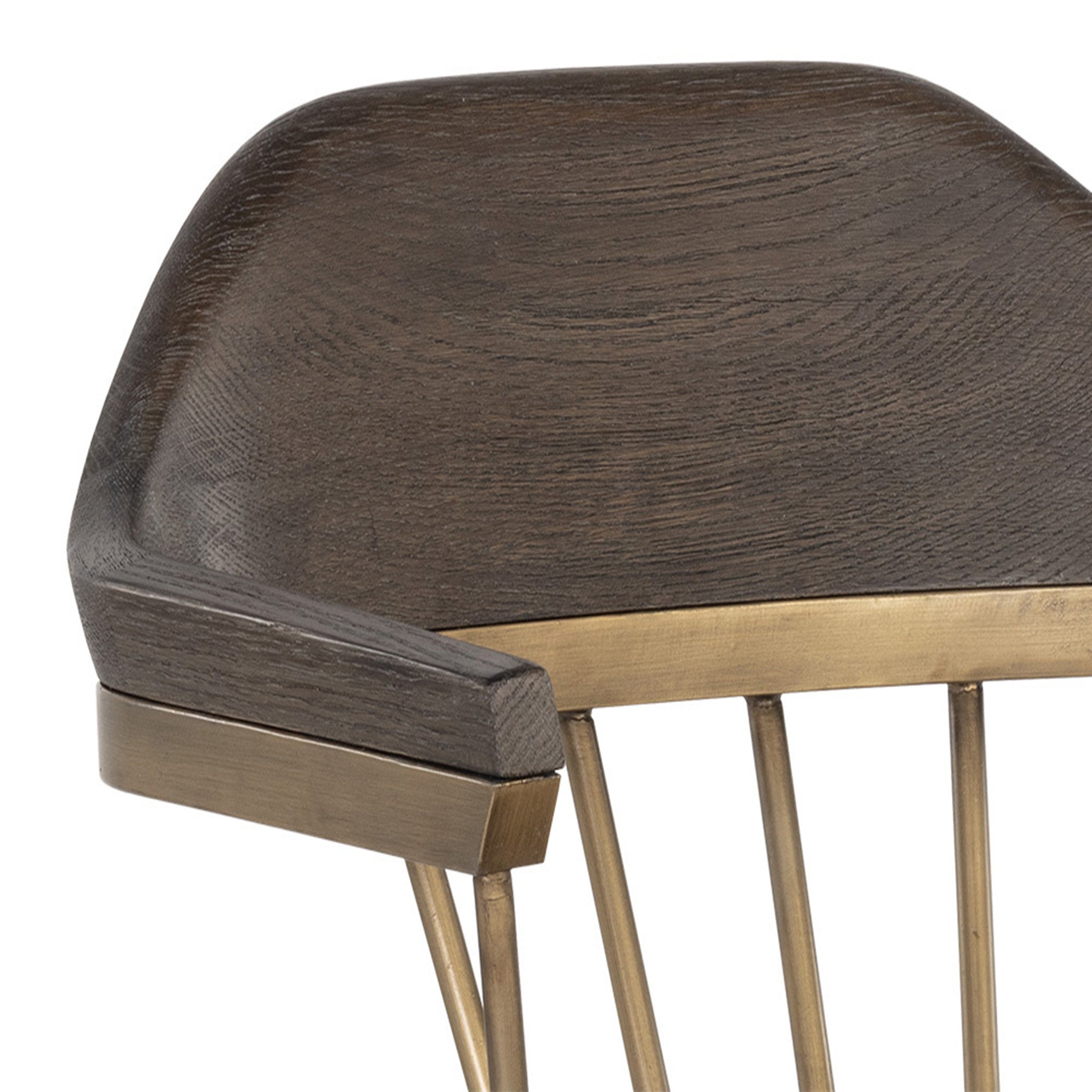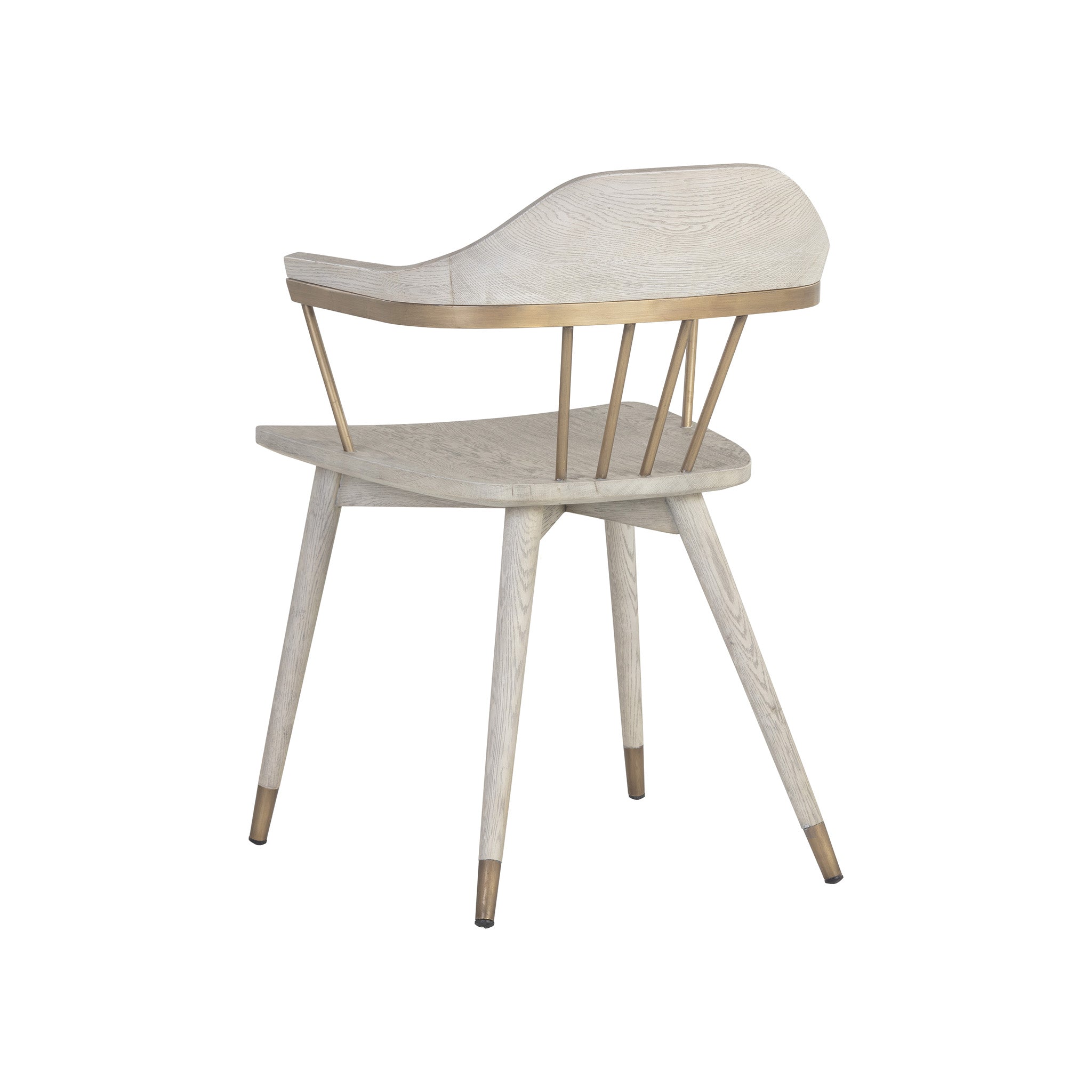 The classic elegance of this dining chair is guaranteed to make a statement in any dining room. The stylish antique brass spindles complement the matching metal caps of the chair legs. Completed with a solid oak wood base.