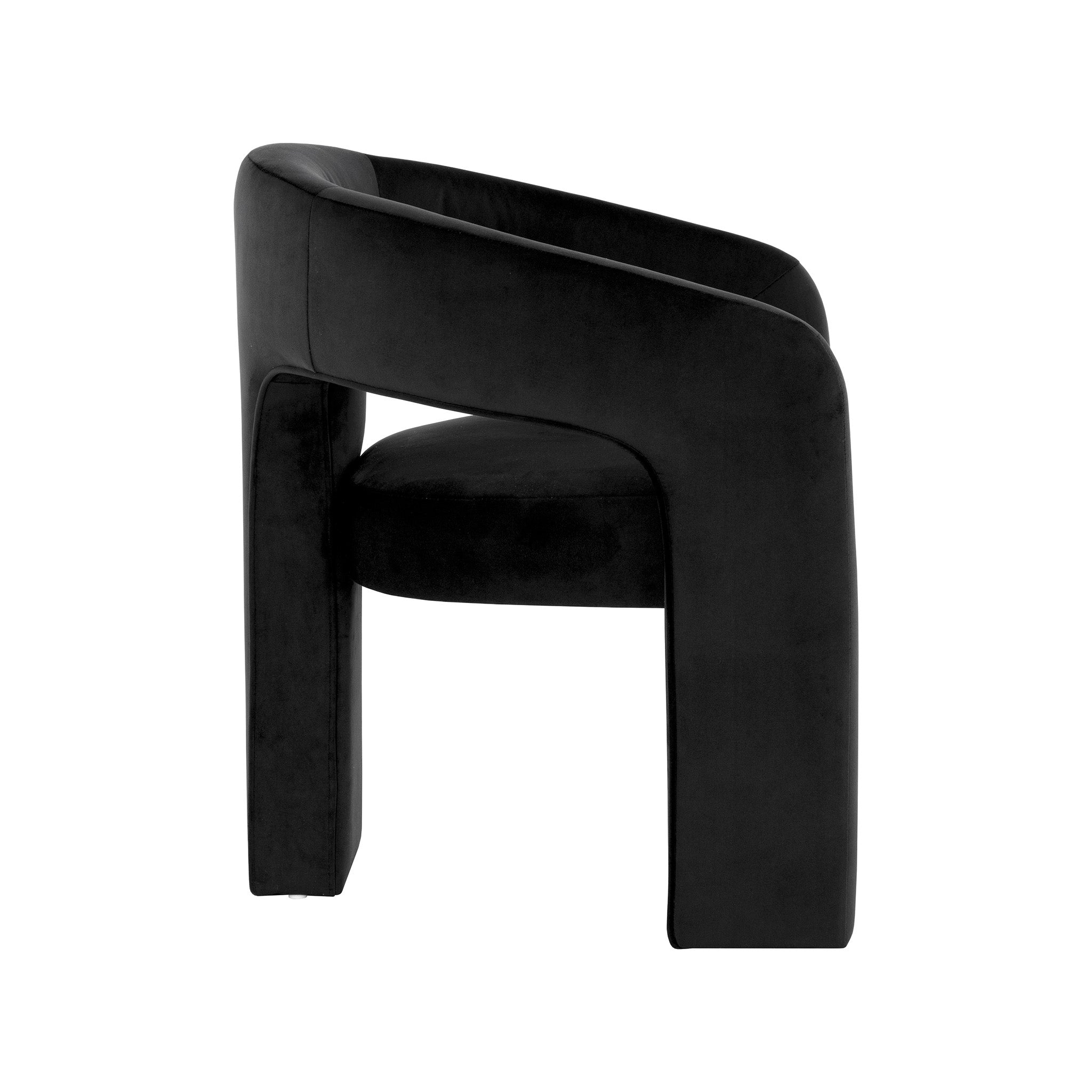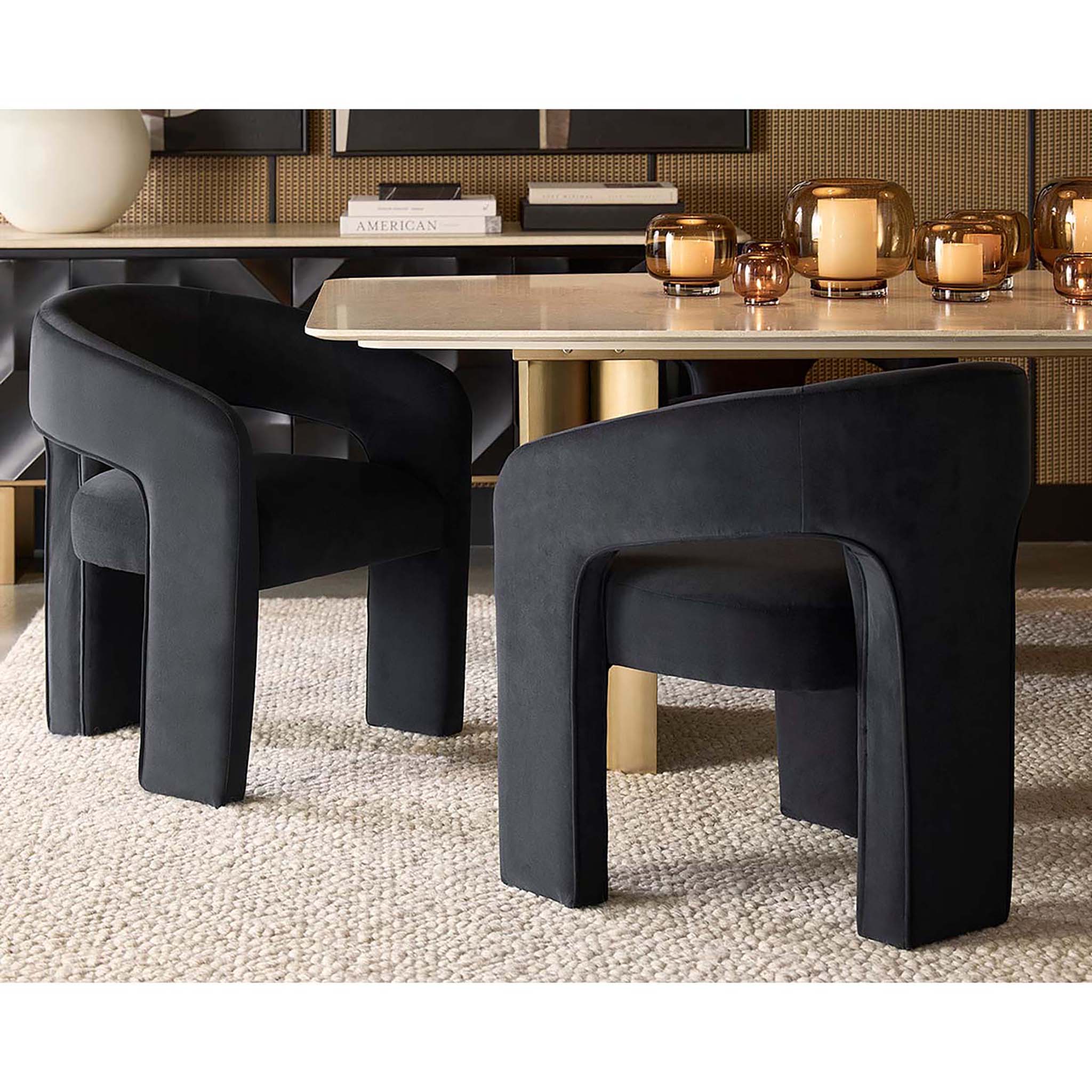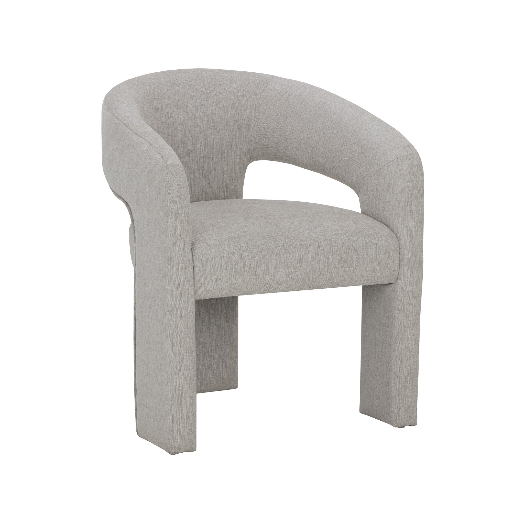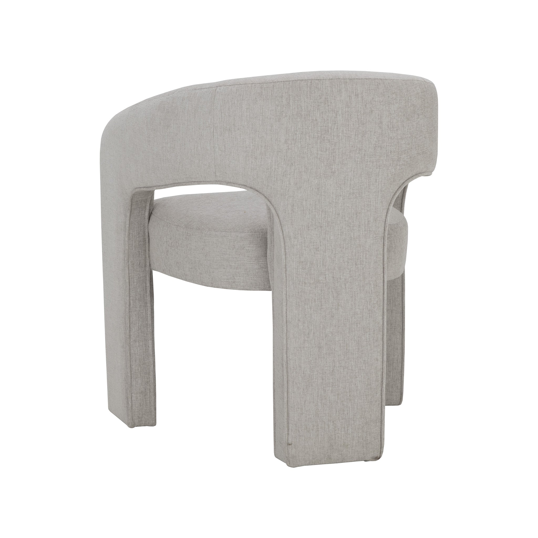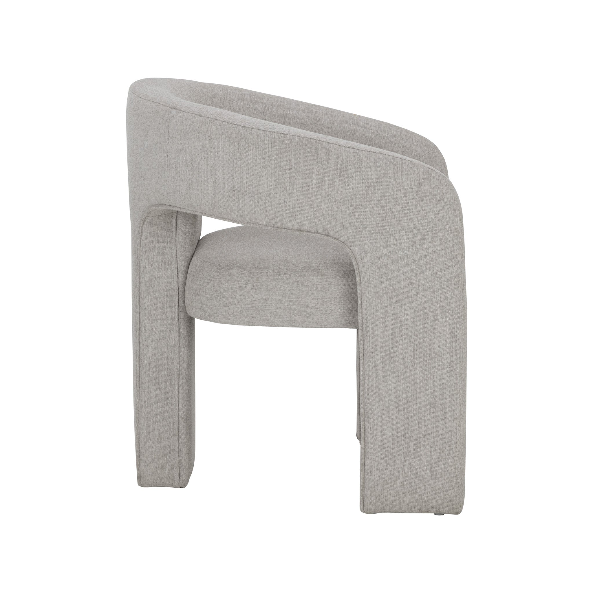 Clean lines and contoured arches add style and structure to this contemporary dining chair. Features a curved backrest and open back for optimal comfort. Eye-catching from all angles. Fully upholstered in our fabric.