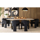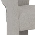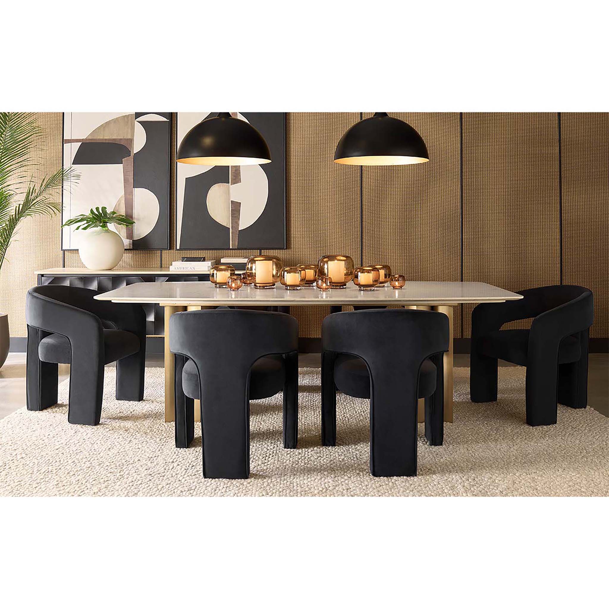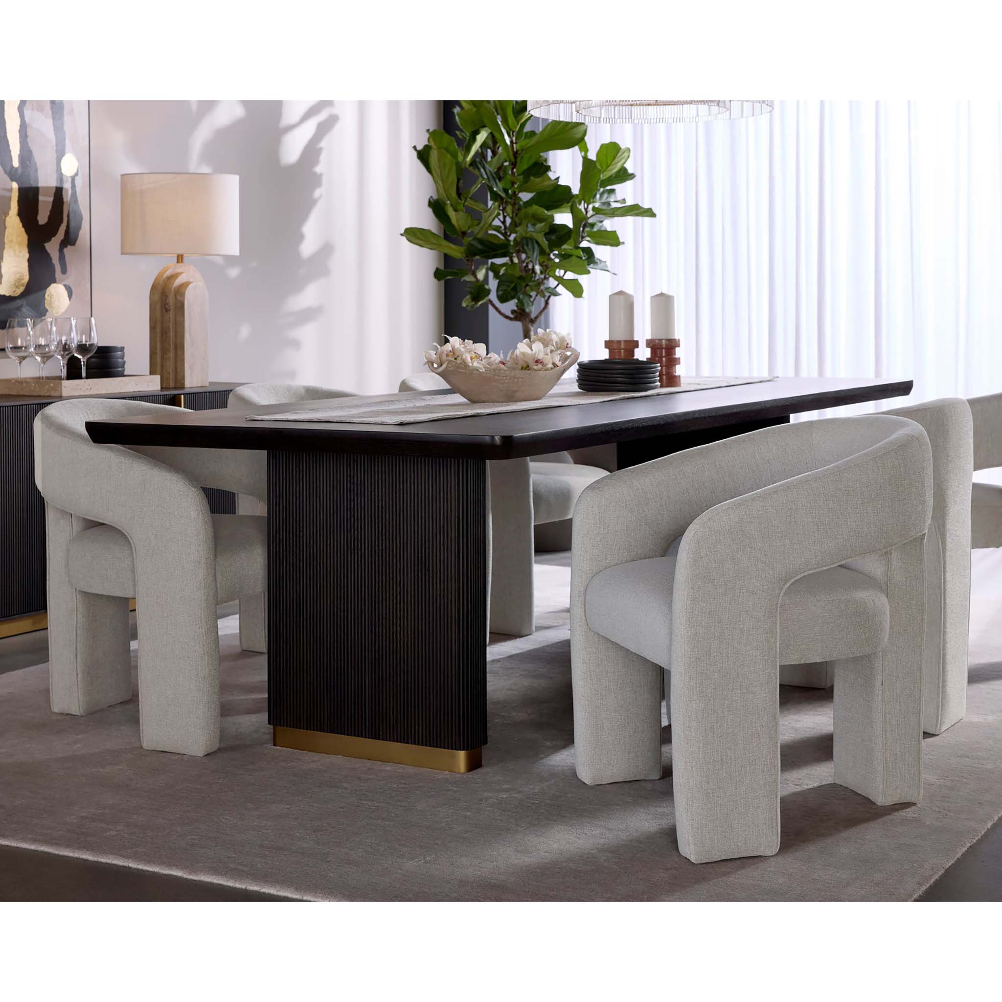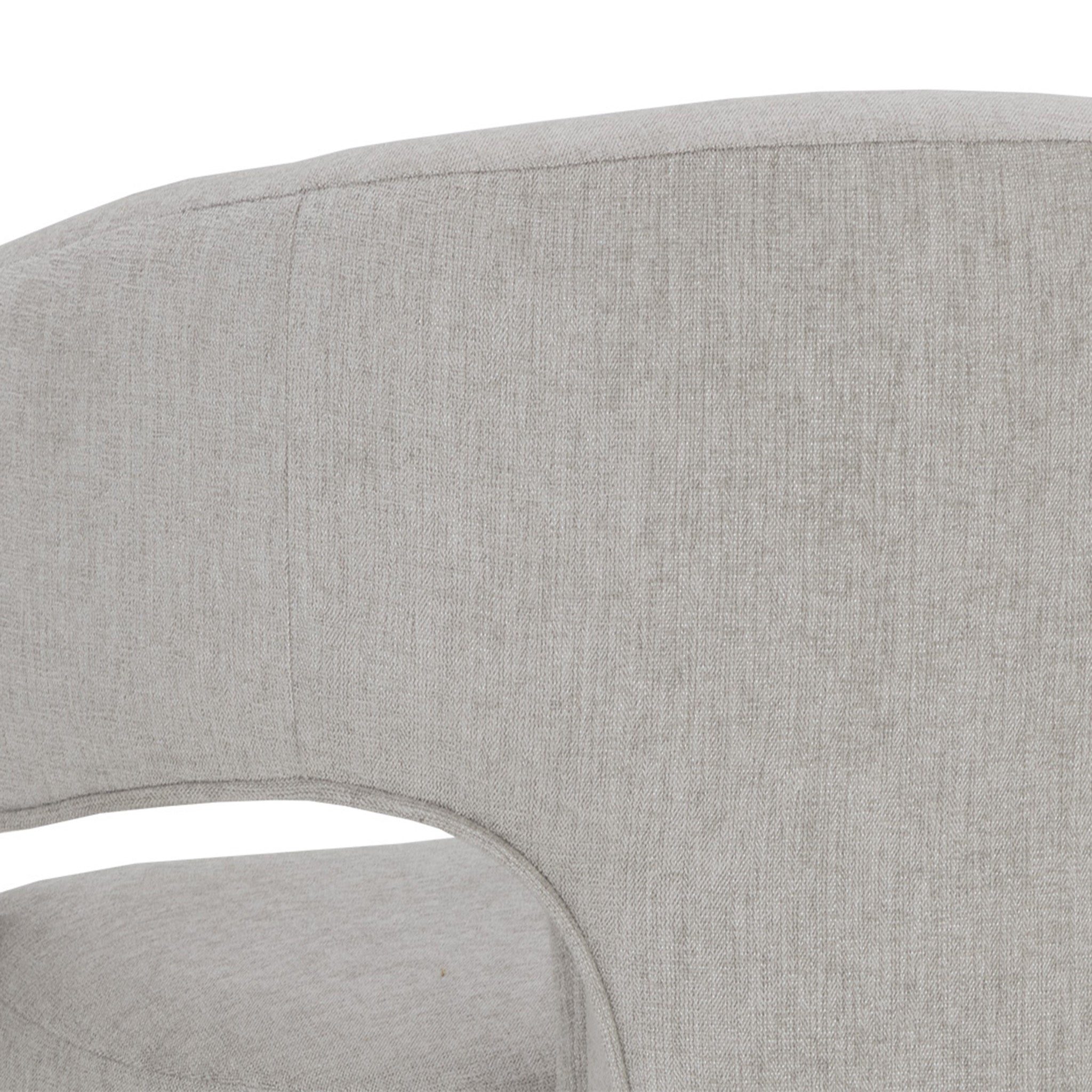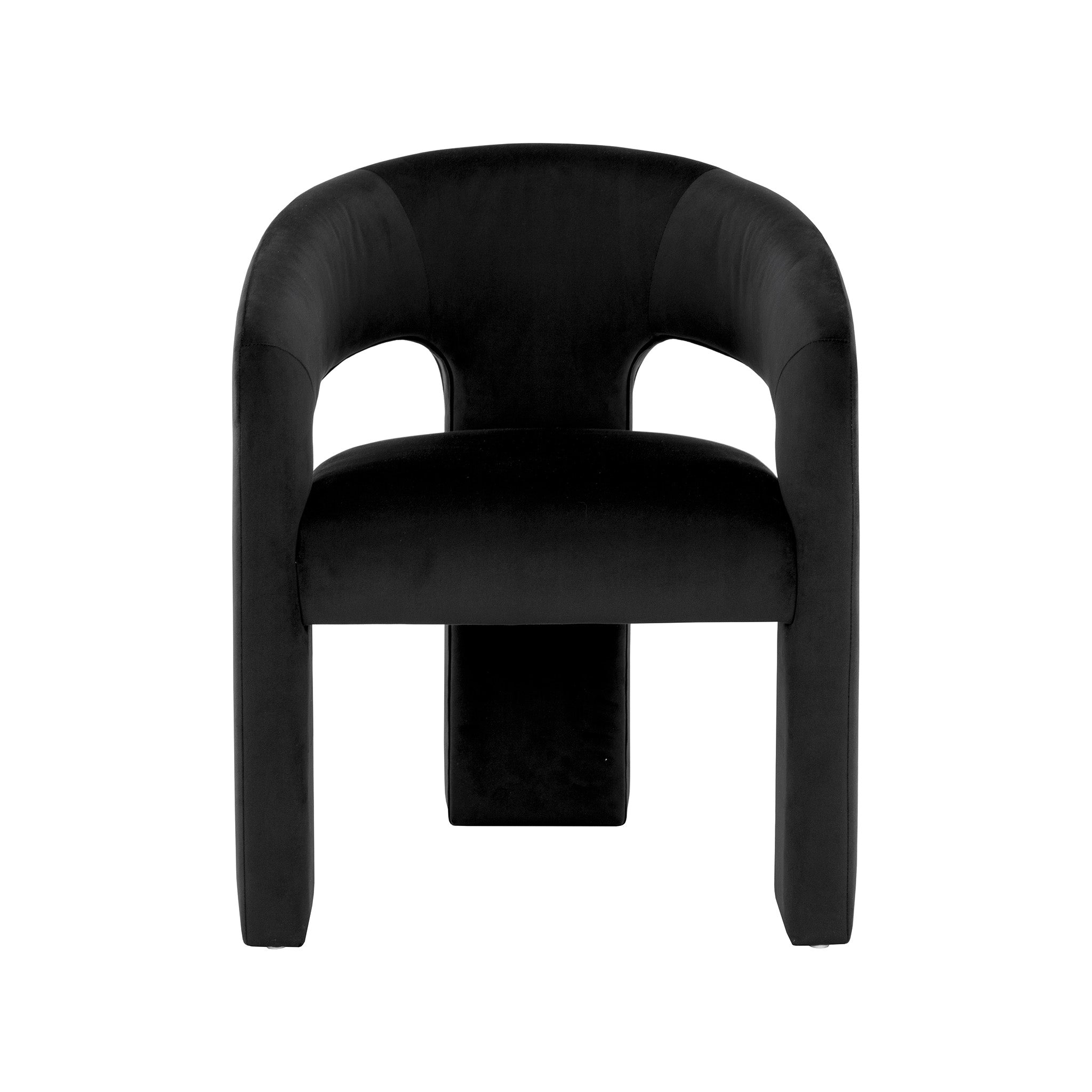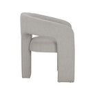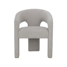Clean lines and contoured arches add style and structure to this contemporary dining chair. Features a curved backrest and open back for optimal comfort. Eye-catching from all angles. Fully upholstered in our fabric.