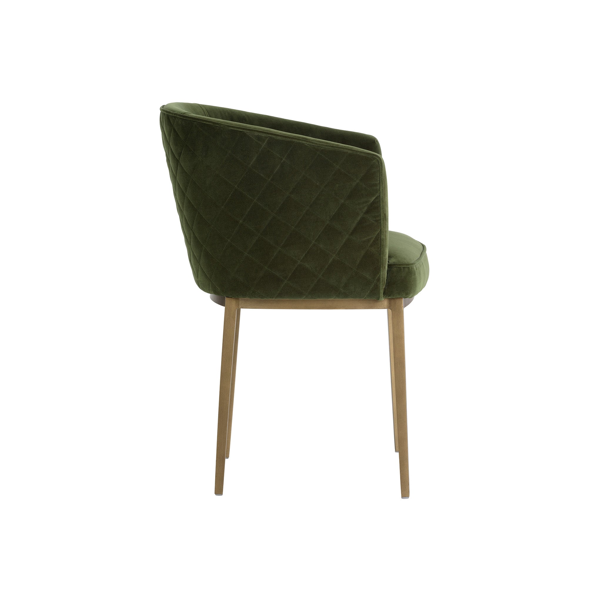 Feminine flair comes to life in this modern dining chair. Stocked in our forest green fabric with elegant diamond stitching on the exterior seatback. An antique brass steel frame completes the look.